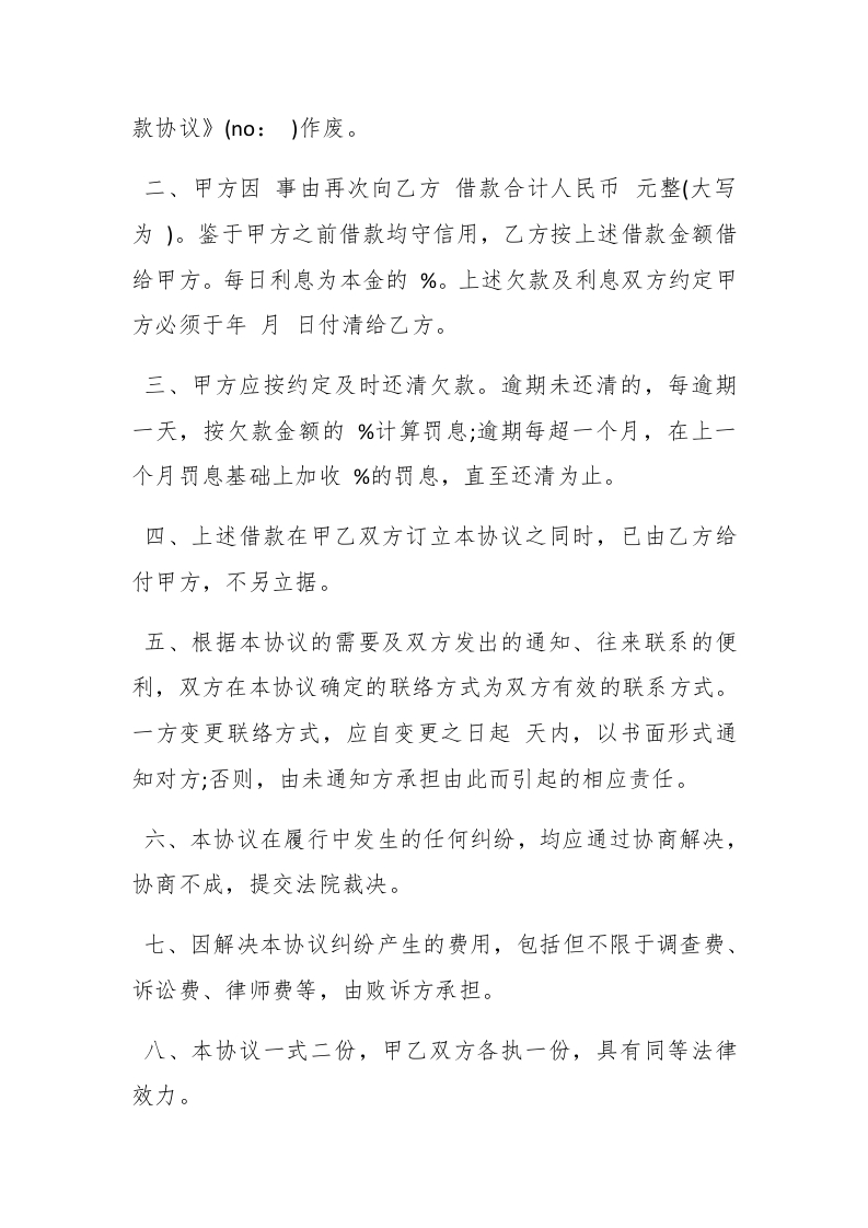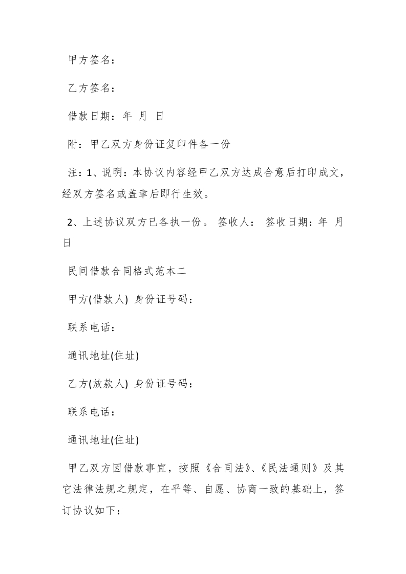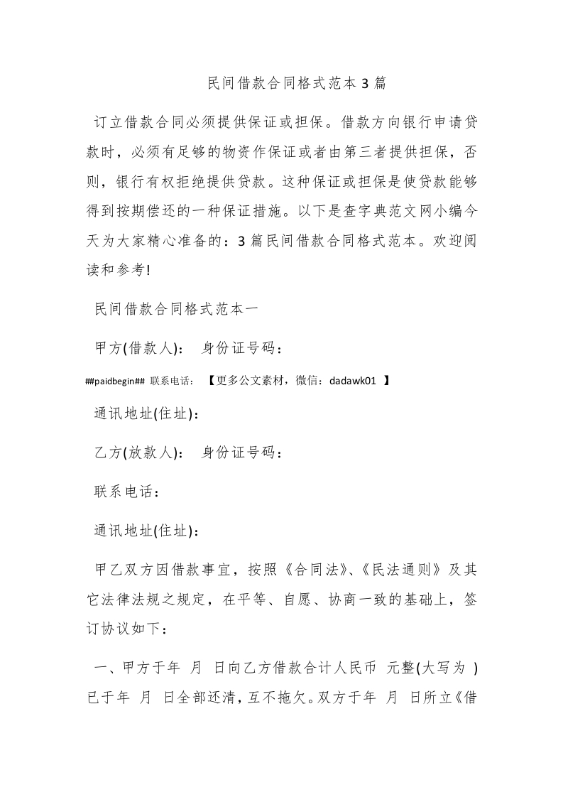 民间借款合同格式范本3篇订立借款合同必须提供保证或担保。借款方向银行申请贷款时,必须有足够的物资作保证或者由第三者提供担保,否则,银行有权拒绝提供贷款。这种保证或担保是使贷款能够得到按期偿还的一种保证措施。以下是查字典范文网小编今天为大家精心准备的:3篇民间借款合同格式范本。欢迎阅读和参考!民间借款合同格式范本一甲方(借款人):身份证号码:榭paidbegin#联系电话:【更多公文素材,微信:dadawko1】通讯地址(住址):乙方(放款人):身份证号码:联系电话:通讯地址(住址):甲乙双方因借款事宜,按照《合同法》、《民法通则》及其它法律法规之规定,在平等、自愿、协商一致的基础上,签订协议如下:一、甲方于年月日向乙方借款合计人民币元整(大写为)已于年月日全部还清,互不拖欠。双方于年月日所立《借