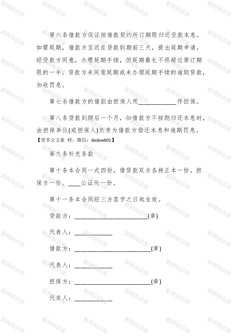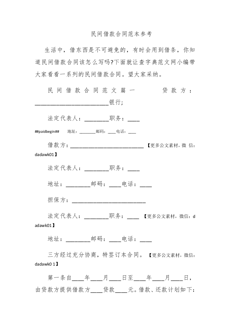 民间借款合同范本参考生活中,借东西是不可避免的,有时会用到借条,你知道民间借款合同该怎么写吗?下面就让查字典范文网小编带大家看看一系列的民间借款合同。望大家采纳。民间借款合同范文篇一贷款方:银行;法定代表人:职务:#paidbegin##地址:邮码:电话:借款方:【更多公文素材,微信:dadawk01:】法定代表人:职务:地址:邮码:电话:担保方:法定代表人:职务:【更多公文素材,微信:dadawk01】地址:邮码:电话:三方经过充分协商,特签订本合同。【更多公文素材,微信:dadawk01】第一条自年月日至年月日,由贷款方提供借款方贷款一元。借款、还款计划如下: