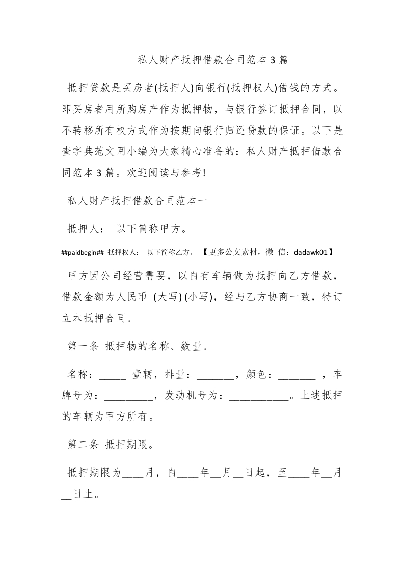 私人财产抵押借款合同范本3篇此内容为付费资源,请付费后查看