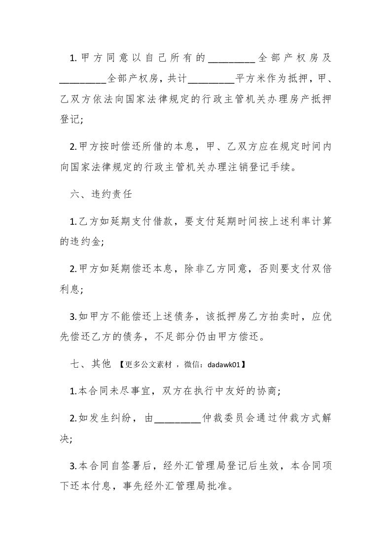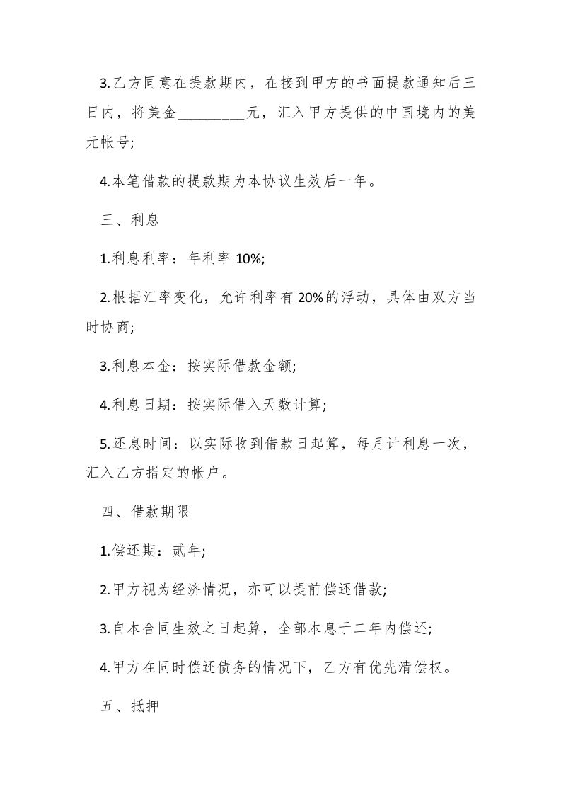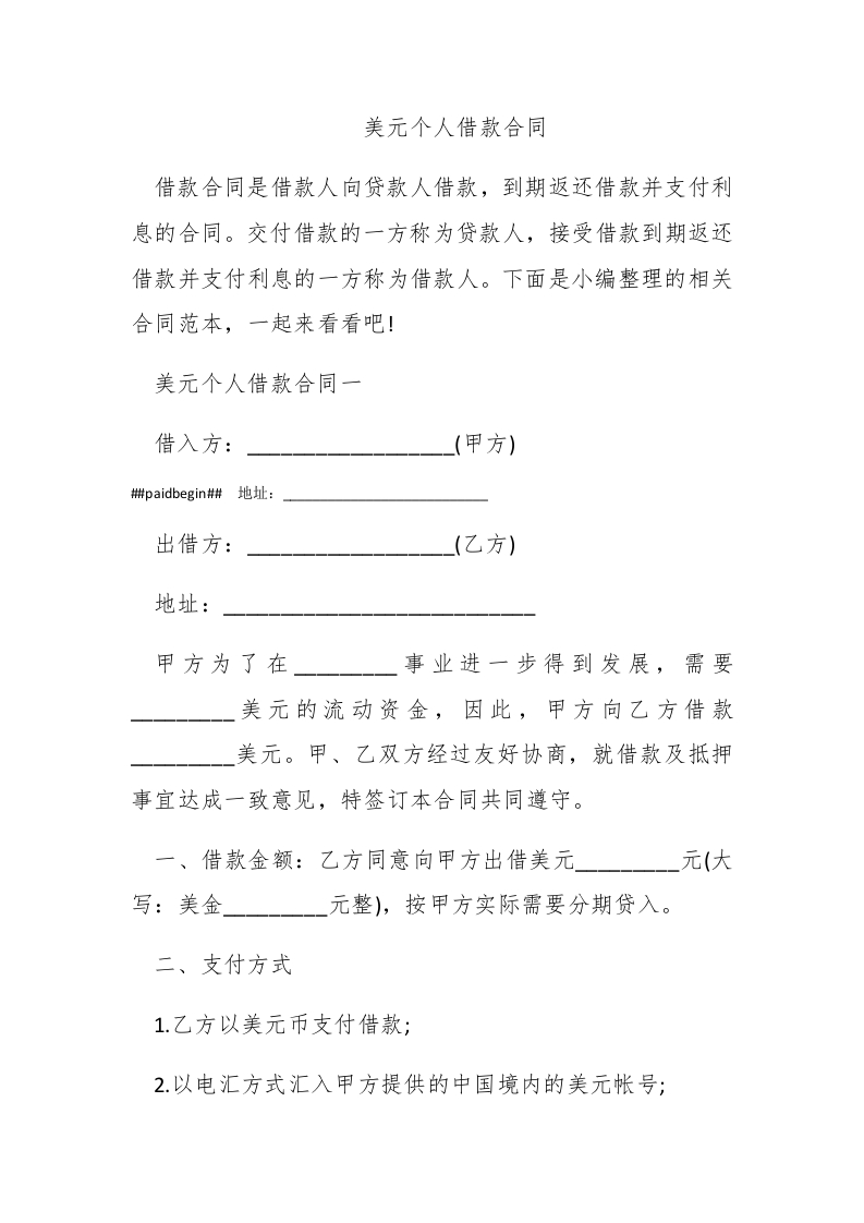 美元个人借款合同借款合同是借款人向贷款人借款,到期返还借款并支付利息的合同。交付借款的一方称为贷款人,接受借款到期返还借款并支付利息的一方称为借款人。下面是小编整理的相关合同范本,一起来看看吧!美元个人借款合同一借入方:(甲方)#paidbegin##地址:出借方:(乙方)地址:甲方为了在事业进一步得到发展,需要美元的流动资金,因此,甲方向乙方借款美元。甲、乙双方经过友好协商,就借款及抵押事宜达成一致意见,特签订本合同共同遵守。一、借款金额:乙方同意向甲方出借美元元(大写:美金元整),按甲方实际需要分期贷入。二、支付方式1.乙方以美元币支付借款;2以电汇方式汇入甲方提供的中国境内的美元帐号;