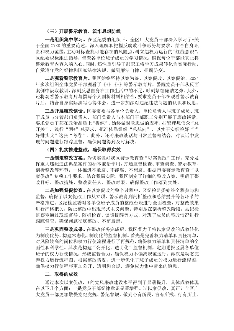 为深入贯彻落实中央和省市县纪检监察要求,区以违纪案件为典型警示,全面推进“以案促改”工作。此次以案促改活动聚焦全体班子成员,严格遵循“问题导向、点面结合、分步实施、务实重效”的原则,通过警示教育、剖析整改、总结提升等阶段工作,着力解决权力运行中的顽疾和短板,努力构建风清气正的政治生态。一、工作开展情况(一)加强组织领导,精心安排部署一是成立领导小组。自从我区启动以案促改专项工作以来,这项工作已成为重要的战略部署,其意义重大且影响深远。我们局在*迅速组织召开了开展案件剖析的专项工作会议。为确保专项工作的顺利进行,我们成立了领导小组并制定了详细的工作方案。这次会议不仅为我们的工作指明了方向,还明确要求全局党员干部提高政治站位,深化思想认识,营造风清气正的政治生态。二是制定工作方案。在推进以案促改工作中,我们特别重视工作的系统性和连贯性。将“开展案例剖析做好以案促改”专项工作视为一项重大的政治任务,并列入了重要议事日程。为确保各项任务的顺利执行,我区制定了《2024年“以案促改”工作实施方案》。建立了工作台账,并规定了分月组织实施的具体措施。此外,我们定期进行工作交流和汇报,这不仅增强了工作的透明度,还加强了各级之间的沟通和协调。三是召开动员大会。组织召开“以案促改”工作动员大会,传达学习上级有关文件精神,安排部署“以案促改”工作。强调了统一思想和行动到中央和市委的总体工作部署,同时注重把握关键节点和紧盯重点领域。通过结合我区年初设定的目标责任,我们聚焦当前的重点项目、工作和任务,要求全体干部职工深刻认识违纪违法的严重后果,切实增强廉洁自律意识和拒腐防变能力,围绕经济社会发展的目标任务,积极担当作为。(二)深入剖析案例,查找问题根源一是选取典型案例。聚焦于我区近期发生的三起典型案例开展警示教育,强调了以“坚持标本兼治,推进以案促改”为抓手的重要性,提升了全区干部对反腐倡廉面临的严峻挑战的认识。同时,还要求全区党员干部时刻注重查找廉政风险点,牢固筑好财政资金的安全网。通过警示教育,全区党员干部都能切实增强廉洁自律意识,提高防腐拒变的能力,确保各项工作的健康发展。二是深入剖析案例。通过深入分析这些违法违纪的新特点、新规律以及深层次原因,引导全体党员干部从思想认识、党性修养、工作作风、廉洁自律等方面查找问题根源,深刻反思教训。在剖析案例的过程中,采用了多种方式方法,如召开专题研讨会、组织个人反思等。通过深入剖析案例,全体干部职工深刻认识到了违纪违法的严重后果,进一步增强了廉洁自律意识和拒腐防变能力。三是撰写剖析材料。自以案促改工作开展以来,我们坚持做到思想认识到位、宣传发动到位、工作推进到位,采取‘个人找、单位查、群众提、领导点’等方式,全区各单位撰写剖析整改材料*份,梳理出各类意见建议*余条.通过撰写个人剖析材料,广大党员干部更加深入地认识到自身存在的问题和不足,明确整改方向和措施,为今后的工作和生活提供了指导。营造了风清气正、正气充盈、人心齐聚的干事环境。