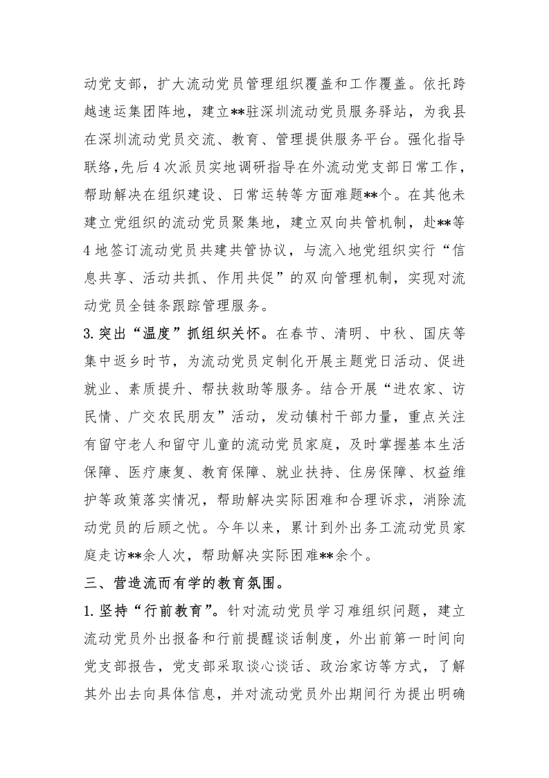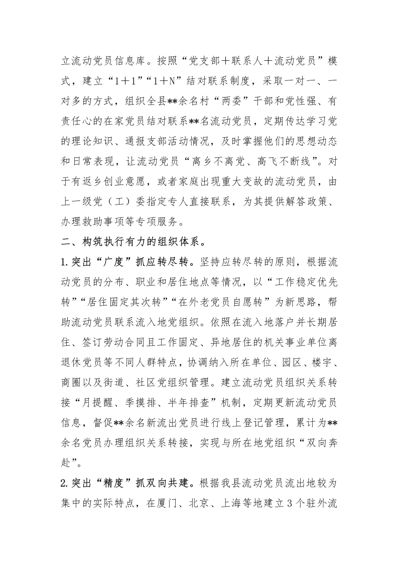 近年来,*县严格贯彻上级部署要求,将加强和改进流动党员管理作为党员队伍建设的重要内容,聚焦流动党员管理难到位、学习难组织、服务难跟进、作用难发挥等问题,探索有利于党组织管理、流动党员发挥作用的工作方式,压实工作责任,强化工作举措。一、搭建一贯到底的工作链条。1.三级联动强领导。建立“县委统一领导、组织部门牵头调度、乡镇属地统筹管理、村级具体兜底落实”的工作机制,确保流动党员教育管理工作有人抓、有人管、能落实。先后4次召开县委常委会、党建工作领导小组会,研究流动党员工作。将流动党员教育管理工作纳入年度党的建设制度专项改革项目和基层党建重点任务清单,为各乡镇明确主要任务与完成时限,推动工作干有目标、行有参照、量有准绳。2.“双找”行动摸底数。部署开展组织找党员、党员找组织“双找”行动,通过各级微信公众号、微信群等媒介发放《致全县流动党员的一封信》,同步在线下通过入户走访、座谈交流等方式,督促流动党员主动向党组织报到,做到知现状、知想法、知去向,实现“外出时间、工作地址、流出党组织、从事职业、联系方式、组织覆盖”全掌握。通过开展“双找”行动,精准摸排全县流动党员底数:全县共有*名流动党员,*%以上为村(社区)外出务工人员,其余部分为非公企业、自由职业人员、离退休人员、高校毕业生等。3.结对联系全覆盖。按照一村一册、一乡镇一库的要求,建