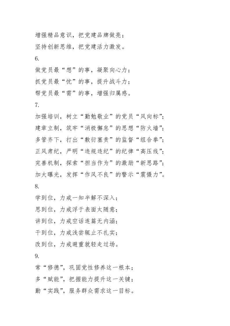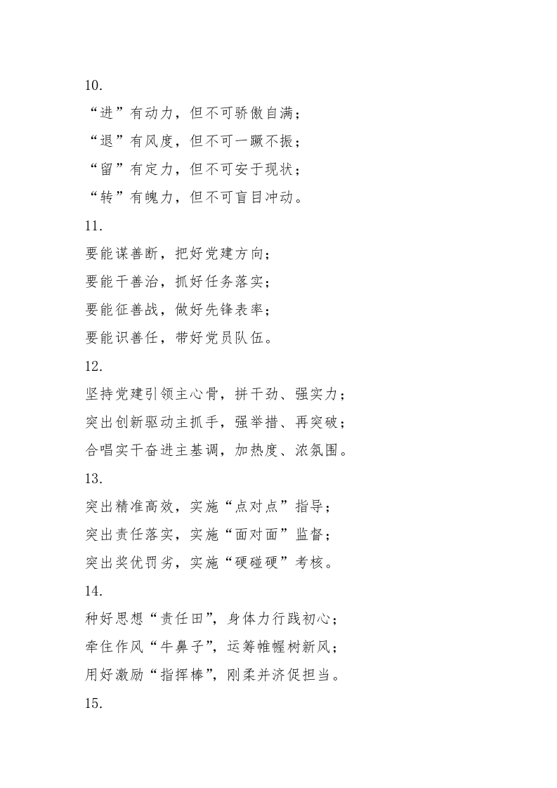 1.打好“信念牌”,始终保持对党忠诚的赤心:打好“学习牌”,始终保持求知若渴的虚心:打好“服务牌”,始终保持为民解忧的真心:打好“作风牌”,始终保持廉洁奉公的恒心。2.激活红色教育资源,着力培育新党员;提升红色理论内涵,着力开拓新视野:推进红色社区共建,着力搭建新平台:健全红色激励机制,着力激发新作为。3.从党员队伍来看,“优”的结构在形成;从组织建设来看,“强”的根基在筑牢;从党建创新来看,“活”的模式在涌现:从作用发挥来看,“大”的成效在累积。4.依托阵地美,让党建“活”起来;打造队伍美,让服务“强”起来;注重活动美,让氛围“热”起来:构筑品牌美,让影响“广”起来。5.带着赤诚之心,把党建实事干好;强化责任意识,把党建任务压实: