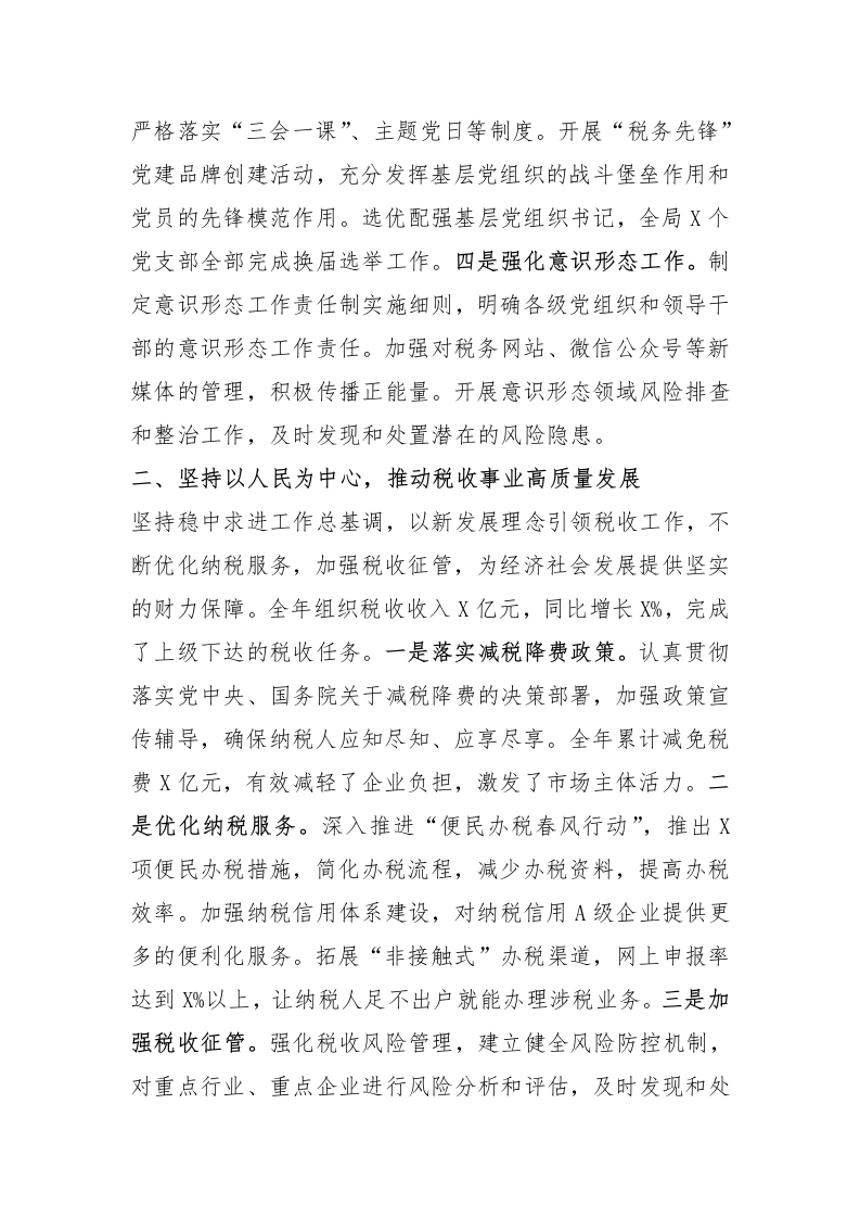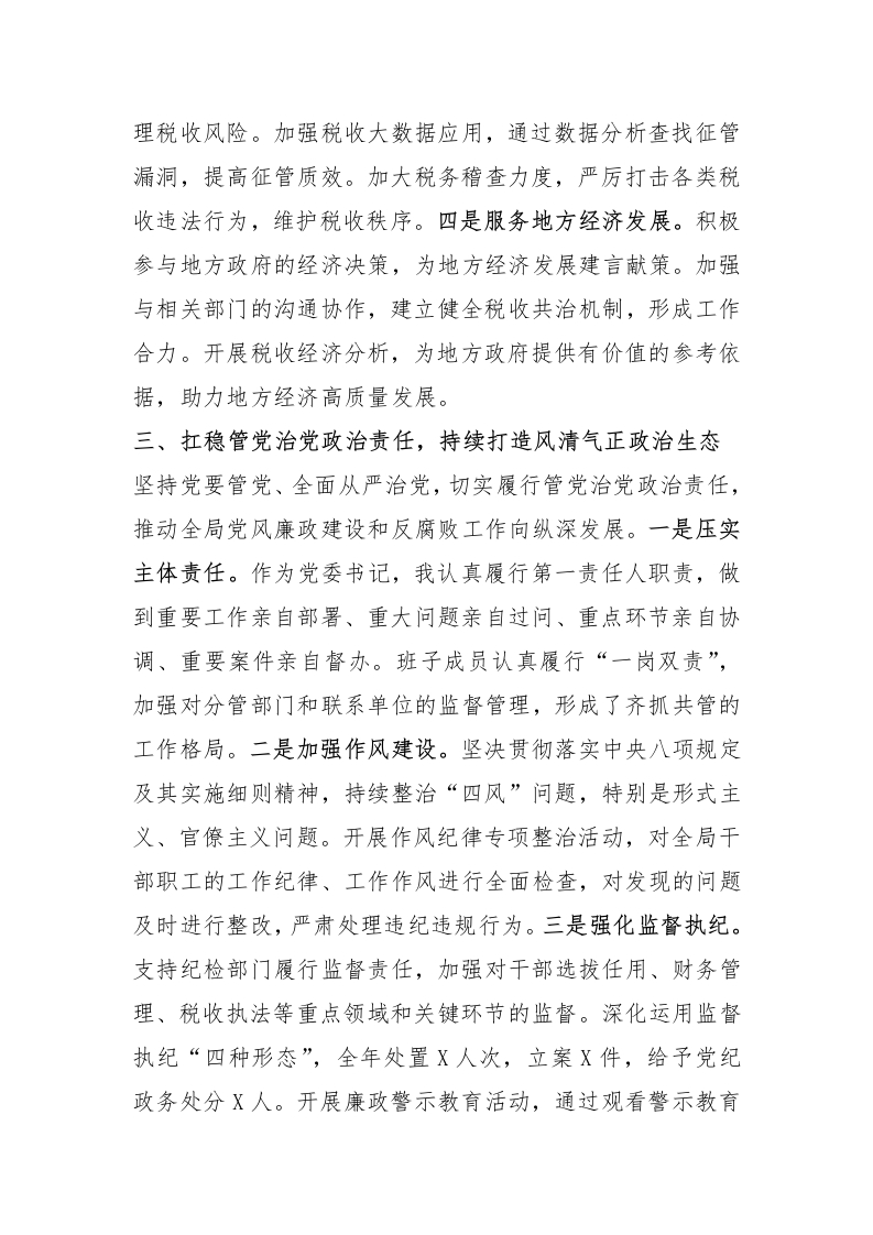 税务局党委书记2024年度个人述职述廉述学述法报告2024年是我在税务系统工作中具有重要意义的一年。在这一年里,面对复杂多变的税收形势和艰巨繁重的改革任务,我带领全局干部职工深入学习贯彻习近平总书记系列重要讲话精神和党中央决策部署,认真落实国家税务总局和省、市税务局的各项工作要求,以坚定的信心、务实的举措推动税收事业高质量发展。现将一年来的学习、履职、廉政等情况汇报如下:一、持续抓好理论武装,不断增强政治定力作为税务局党委书记,我始终把对党忠诚、政治坚定作为立身之本、为政之基,不断加强理论学习,提高政治素养,坚定政治立场。一是坚决贯彻“两个维护”。深入学习习近平新时代中国特色社会主义思想和党的二十大及二十届三中全会精神,组织“第一议题”学习共X次,理论中心组集体学习共X次,确保全局干部职工在思想上、政治上、行动上同以习近平同志为核心的党中央保持高度一致。二是加强干部队伍建设。坚持正确的选人用人导向,按照德才兼备、以德为先的原则,选拔任用了一批政治素质高、业务能力强、工作作风实的干部。全年调整干部X批次,涉及科级干部X名,其中提拔正科级领导干部X名,副科级领导干部X名。同时,加强干部教育培训,举办各类培训班X期,培训干部X人次,提高了干部队伍的整体素质。三是夯实基层党建基础。持续推进党支部标准化规范化建设,加强党员教育管理,