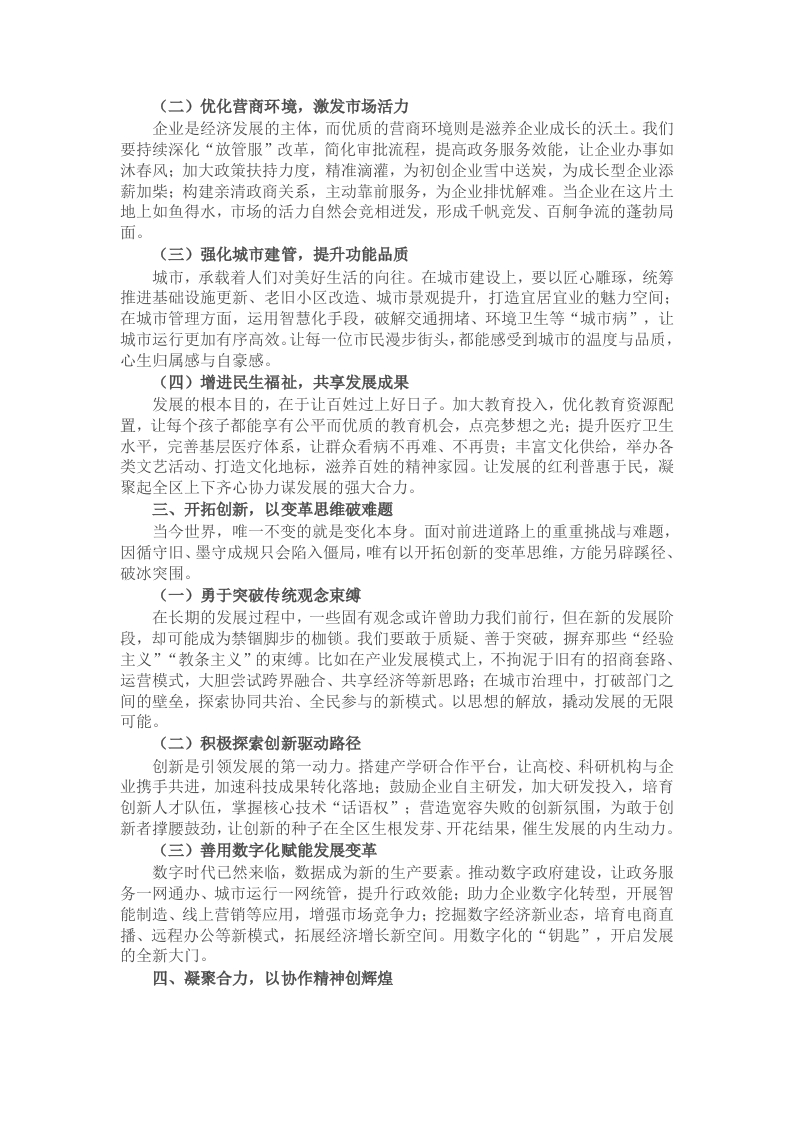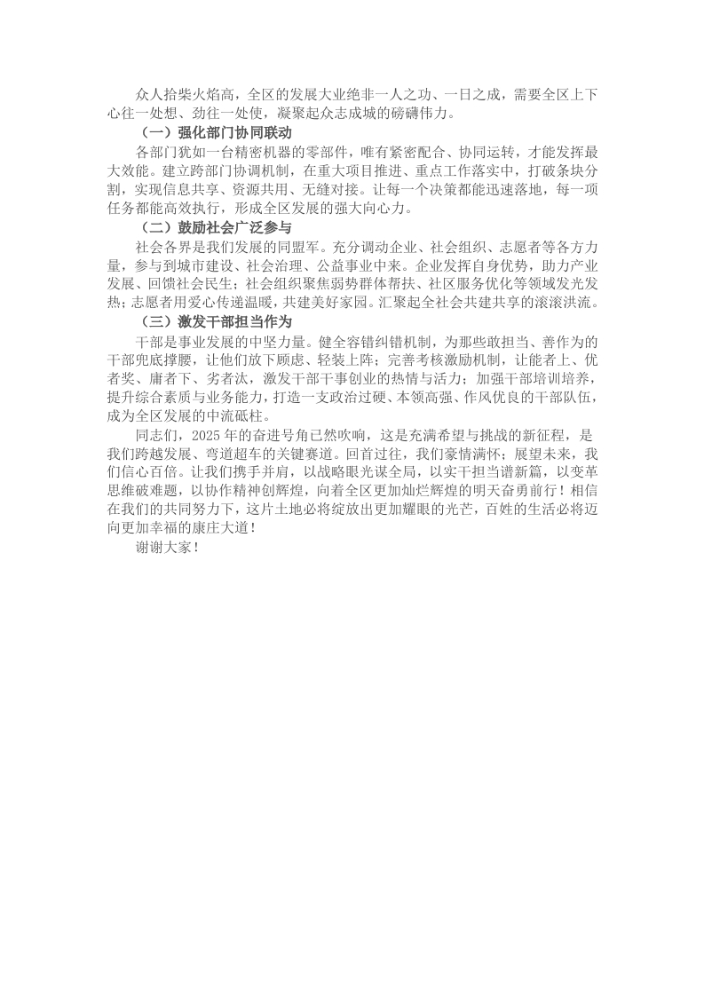 同志们:岁序常易,华章日新。在这辞旧迎新、继往开来的关键时刻,我们满怀豪情相聚于此,召开这场意义非凡的务虚会。回首过往,一路栉风沐雨,我们在发展的征途上披荆斩棘,用汗水浇灌收获,以实干笃定前行,各项事业取得了不俗的成绩,城市风貌日新月异,百姓生活持续改善,综合实力稳步攀升。然而,我们必须清醒地认识到,当今时代,区域竞争的浪潮汹涌澎湃,发展的浪潮瞬息万变,不进则退,慢进亦退。站在2025年的新起点上,唯有以高瞻远瞩的布局、敢为人先的气魄、务实笃行的作为,方能在新征程上扬帆远航,铸就新的辉煌。在此,我谈几点意见,与大家共勉。一、登高望远,以战略眼光谋全局古人云:“不谋万世者,不足谋一时:不谋全局者,不足谋一域。”在新时代的宏大棋局中,我们想要落子有声、步步为赢,就必须要有登高望远的战略眼光,跳出一时、一事、一地的局限,全方位、深层次、宽领域地谋划全区发展大局。(一)立足高远,精准锚定发展坐标我们所在的区域,虽已初显峥嵘,但切不可固步自封。要将视野拓展至全国乃至全球的版图之上,对标先进地区,探寻发展规律。研究那些在科技创新、产业升级、城市治理等方面领跑的范例,从中汲取智慧,找准我们与之的差距与契合点。明晰自身在产业分工、资源互补、区域协同中的独特角色,让我们的每一步发展都踏准时代的节拍,朝着更高的目标奋勇攀登。(二)洞察大势,敏锐捕捉机遇窗口当下,科技革命与产业变革深度交融,数字化、智能化、绿色化浪潮席卷而来,新的商业模式、业态如雨后春笋般破土而出。我们要练就一双慧眼,在这纷繁复杂的变革中洞察先机。无论是新兴技术赋能传统产业的转型契机,还是消费升级催生的市场蓝海,亦或是区域协调发展带来的政策红利,都不容错过。顺势而为,乘势而上,将每一个机遇都转化为发展的强大引擎。(三)统筹兼顾,协调推进多元发展一个地区的繁荣昌盛,恰似一场气势恢宏的交响乐,经济、社会、文化、生态等各个领域都是其中不可或缺的乐章。我们既要聚焦经济发展的主旋律,全力做大做强产业根基,提升区域竞争力:又要关注民生福祉的和谐音,让教育、医疗、养老等公共服务更加优质均衡,百姓安居乐业:更要奏响生态保护的清新曲,守护好绿水青山,让蓝天白云、繁星闪烁成为常态。以系统思维促进多元协同,方能奏响发展的最强音。二、砥砺奋进,以实干担当谱新篇蓝图已然绘就,但若没有真抓实干的有力笔触,终究只是纸上谈兵。迈向2025,我们必须鼓足干劲、砥砺奋进,用拼搏与汗水将美好愿景变为现实画卷。(一)聚焦产业升级,筑牢发展根基产业是地区发展的脊梁。一方面,要深耕传统优势产业,以科技创新为利刃,为其注入新的活力。引入大数据、人工智能等前沿技术,推动制造业向高端化、智能化、绿色化迈进,让传统产业老树发新芽:另一方面,要高瞻远瞩布局新兴产业,围绕生物医药、新能源、数字经济等潜力赛道,加大招商引资力度,培育壮大本土企业,打造产业集群新高地。用“两条腿走路”,夯实产业根基,方能在未来的竞争中立于不败之地。