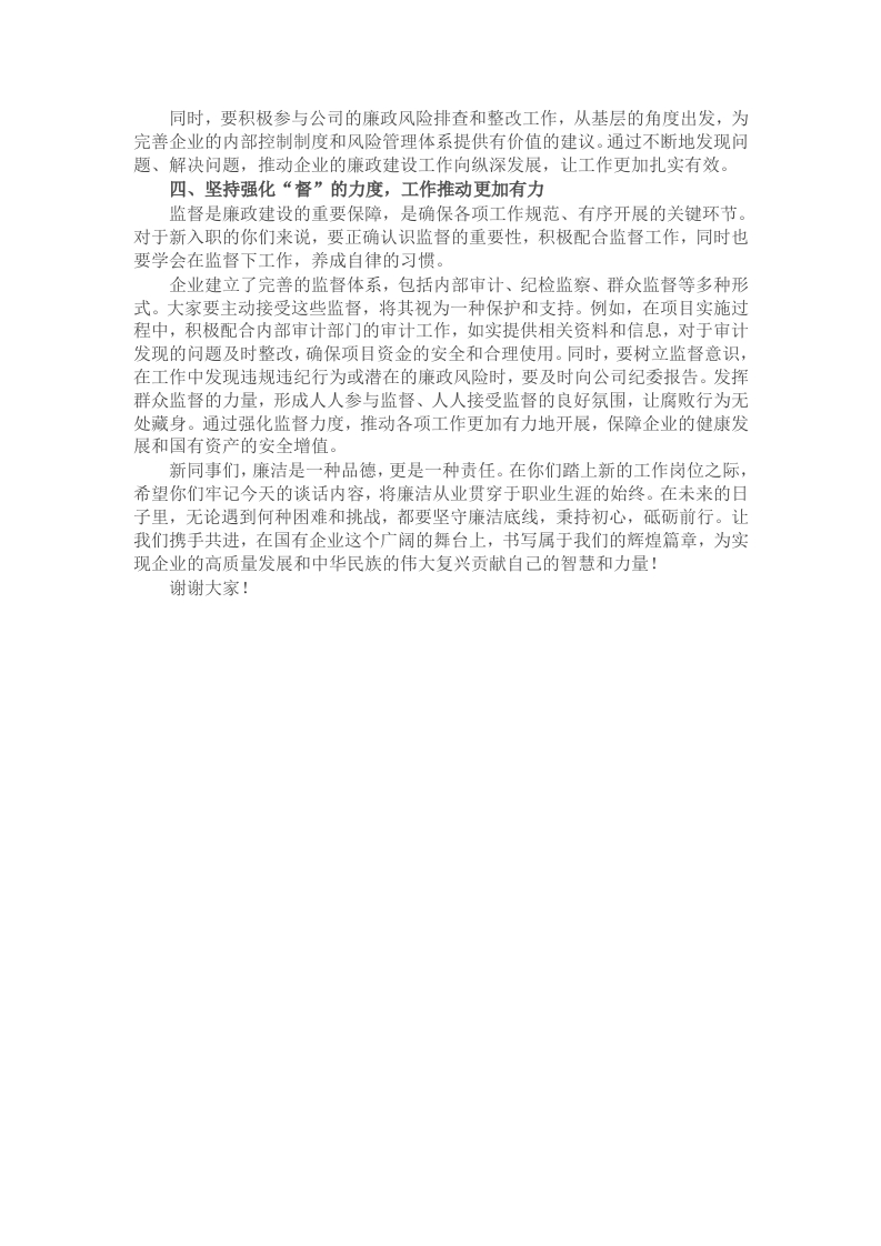 亲爱的新同事们:大家好!在这个充满希望与活力的时刻,欢迎你们加入我们国有企业这个大家庭,开启人生新的篇章。作为纪委部门的代表,今天与大家进行这次廉政谈话,目的就是为大家敲响廉洁从业的警钟,助力大家在职业生涯的起点上树立正确的价值观和职业观,系好人生的第一粒扣子。接下来,我将从以下四个关键方面与大家深入交流。一、坚持夯实“学”的基础,思想基础更加牢固古人云:“学如逆水行舟,不进则退。”在廉政建设的道路上,学习是筑牢思想防线的基石,是我们前行的指明灯。对于新入职的你们来说,深入学习廉政知识、法律法规以及企业的规章制度,是快速适应新环境、融入新集体的重要一课。我们身处一个信息快速更迭的时代,廉政知识也在不断更新和完善。因此,大家要养成持续学习的良好习惯,利用业余时间研读党纪国法,关注国家廉政建设的最新动态和政策法规的调整变化,积极参加公司组织的各类廉政培训、讲座和研讨活动。例如,我们定期邀请专家学者进行案例分析讲座,通过剖析真实发生的违纪违法案例,深入学习背后的法律条文和廉政风险点,让大家更加直观地认识到腐败行为的严重后果。同时,要将学习融入到日常工作中,向身边的优秀同事学习,学习他们严谨的工作作风、廉洁的职业操守和高效的工作方法。通过不断学习,丰富自己的知识储备,提升自己的思想境界,让廉洁意识深深扎根于内心,成为一种自觉的行为准则,从而在面对各种诱惑时,能够坚守底线,不为所动。二、坚持拓宽“做”的途径,队伍活力更加强劲“纸上得来终觉浅,绝知此事要躬行。”学习的目的在于实践,只有将廉政理念转化为实际行动,才能真正发挥其价值,为企业的发展注入强劲的活力。在工作中,要积极参与公司的廉政文化建设活动,发挥自己的聪明才智和创新精神,为丰富廉政文化的内涵和形式贡献力量。比如,参与策划组织廉政主题的演讲比赛、征文活动、文艺演出等,通过这些活动,不仅能够传播廉政知识,营造浓厚的廉政氛围,还能增强自身的责任感和使命感,同时,要在日常业务中践行廉洁自律的要求,在工作中,要严格遵守公司的廉政规定,坚决杜绝吃拿卡要、利益输送等违规行为。以严谨的工作态度、扎实的工作作风和廉洁的职业形象,赢得同事的尊重和信任,成为企业廉政建设的积极践行者和推动者,带动身边的人共同营造风清气正的工作环境,让廉政之花在企业中绽放得更加绚烂多彩。三、坚持抓住“改”的重点,基层党建更加扎实“人非圣贤,孰能无过。”在工作中,我们难免会出现一些失误和不足,关键在于能否及时发现并加以改正。对于新入职的大家来说,要树立正确的错误观,将错误视为成长的机遇,通过整改不断提升自己,同时也为企业贡献力量。在廉政建设方面,要善于自我反思和自我批评,定期对自己的工作行为进行梳理和检查,查找是否存在潜在的廉政风险点。例如,在处理涉及资金、物资等敏感事务时,是否严格按照规定的流程操作:在与外部单位的交往中,是否保持了恰当的距离和廉洁的关系。一旦发现问题,要立即制定整改措施,明确整改方向和时间节点,确保问题得到彻底解决。