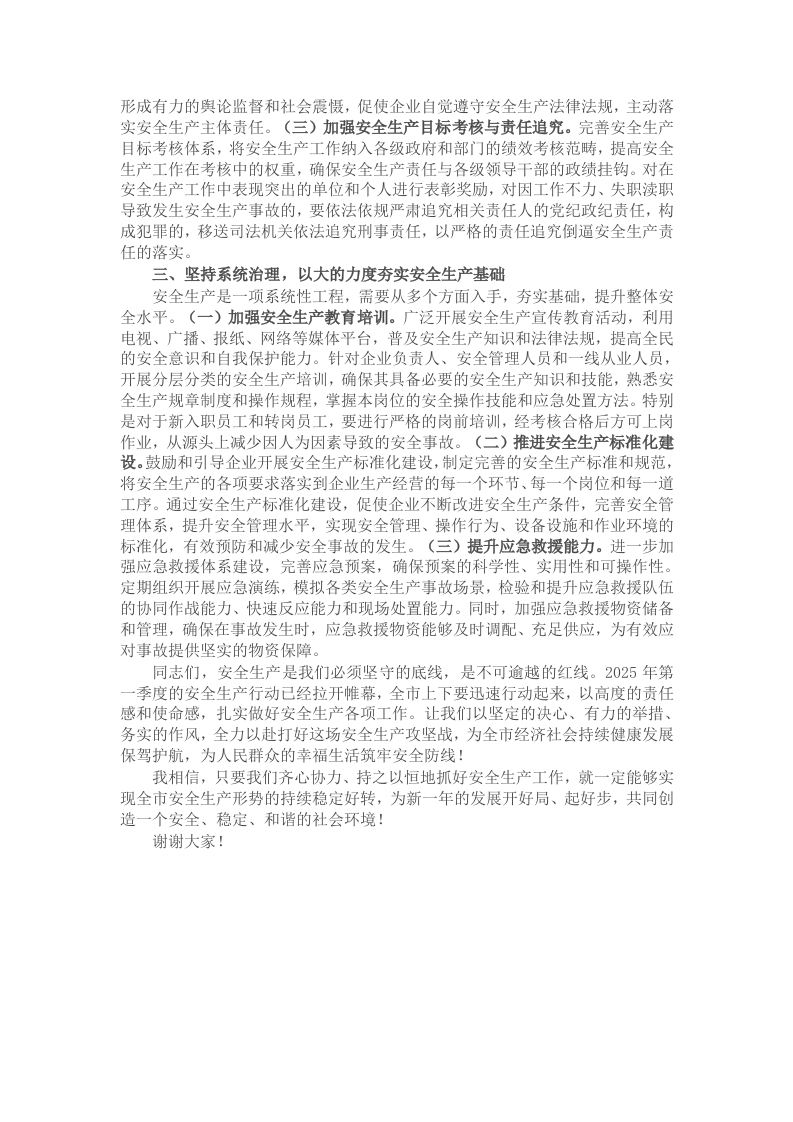 同志们:安全生产,重于泰山,关乎人民福祉,关系到全市经济社会发展的稳定大局在2025年的新起点上,我们召开这次全市安全生产行动动员大会,意义非凡。新的一年,我们承载着人民的期望,肩负着发展的重任,而安全生产就是我们前行道路上的基石与保障。回首过去,我们在安全生产方面取得了一定成绩,但也绝不能忽视仍然存在的问题与挑战。安全生产工作犹如逆水行舟,不进则退。当下,各类生产经营活动逐步进入活跃期,加之第一季度往往伴随着复杂多变的气候条件和节日期间人员流动、生产活动的特殊情况,我们面临的安全生产形势依然严峻复杂,容不得半点松懈与麻痹。在此,我就扎实推进2025年第一季度全市安全生产行动,讲以下几点意见:一、坚持源头治理,以实的举措排查整治风险隐患源头治理是安全生产的关键环节,只有将隐患扼杀在萌芽状态,才能从根本上保障安全。(一)全面开展安全隐患大排查。各行业主管部门要迅速行动起来,组织专业力量,对全市范围内的各类企业、场所进行拉网式排查。尤其是对危险化学品生产储存企业,要详细检查其生产工艺、设备设施、储存条件以及安全管理制度的落实情况,确保每一个环节都符合安全标准。对于建筑施工场地,要对脚手架搭建、塔吊运行、深基坑支护等关键部位进行重点排查,不放过任何一处可能存在的安全漏洞。同时,对人员密集场所如商场、影院、车站等,要检查消防设施是否完备、疏散通道是否畅通,及时消除火灾隐患等各类潜在风险。(二)强化风险评估与预警机制。引入先进的风险评估技术和模型,对不同行业、不同领域的安全风险进行精准评估,确定风险等级,并实施分类分级管理。建立健全安全风险预警系统,通过大数据分析、实时监测等手段,对可能出现的安全风险提前发出预警信号,为企业和相关部门留出足够的应对时间。例如,在气象灾害可能影响安全生产的情况下,提前向相关企业推送预警信息,指导其做好防范措施,如加固户外设施、调整生产计划等,有效降低风险发生的可能性和危害性。(三)推动企业自查自纠常态化。企业作为安全生产的责任主体,必须建立常态化的自查自纠机制。督促企业定期组织专业人员对生产经营过程中的安全隐患进行自查,建立详细的隐患排查台账,明确整改责任人、整改措施和整改期限。同时,鼓励企业员工积极参与安全隐患举报,对发现的安全问题及时报告,形成全员参与、全方位排查的良好氛围,将安全隐患消除在企业内部。二、坚持综合治理,以严的监管落实安全生产责任安全生产责任的落实需要各方协同发力,通过严格的监管手段,确保各项安全措施落到实处。(一)明确各部门监管职责。进一步厘清各行业主管部门在安全生产中的职责边界,避免出现监管空白和交叉重叠的现象。各部门要按照“管行业必须管安全、管业务必须管安全、管生产经营必须管安全”的原则,制定详细的安全生产监管计划和工作方案,将监管责任细化到具体岗位和人员。例如,应急管理部门要加强对危险化学品、矿山等高危行业的监管:住建部门要负责建筑施工领域的安全监管:市场监管部门要对特种设备的安全运行进行监督检查等,确保每个行业、每个领域都有明确的监管主体和监管标准。(二)加大执法力度,严厉打击违法违规行为。建立健全安全生产联合执法机制,加强各部门之间的协作配合,形成执法合力。对存在重大安全隐患、拒不整改或整改不到位的企业,要依法采取停产停业整顿、吊销相关证照等严厉措施,顶格处罚,绝不手软。同时,要加大对安全生产违法行为的曝光力度,通过媒体平台公开曝光典型案例,