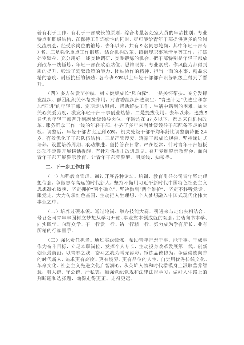 市委编办2024年青年干部培养工作总结2024年,市委编办坚持以习近平新时代中国特色社会主义思想为指导,深入学习贯彻习近平总书记关于年轻干部工作的重要论述,建立健全年轻干部常态化系统化培养机制,促进年轻干部健康成长,认真落实市委“青苗干部启航工程“部署要求,在选苗、育苗、墩苗、爱苗四个方面持续发力,着力打造政治强、业务精、作风优的高素质、专业化机构编制年轻干部队伍。一、主要工作情况(一)多渠道选苗固本,筑牢年轻干部“培养基”。一是扩充“青苗”蓄水池。按照“青苗干部起航工程”有关要求,结合干部队伍结构现状,将40岁以下干部全部纳入年轻干部培养范围,出台一系列政策“组合拳”,以点及面推动全办年轻干部队伍建设。通过组织公务员基层遴选、事业单位基层遴选、录用省委组织部选调生等方式,拓宽进人渠道,有针对性地选拔、补充年轻力量,优化整体干部队伍结构。二是建立“青苗”专项库。制定年轻干部专项培养、考核措施,不断发掘、培养优秀年轻干部。出台培养办法,有计划的把青年干部放到改革攻坚一线沉浸式历练、实战化磨练:创新考核举措,建立青年干部成长档案,运用大数据分析青年干部的特长和存在的不足,实时记录、更新轨迹,实现年轻干部成长全周期管理:优化评价指标,精准考察青年干部公文写作、语言表达、组织协调、执行协作、调研创新等方面,赋能年轻干部快速成长。三是抓好“青苗”传帮带。建立青年理论学习小组,创建原原本本研学、班子成员带学、支部组团联学、主题党日促学、青年干部竞学“五学”联动模式,充分发挥理论学习中心组辐射带动作用,采用“班子成员+支部书记+青年理论学习小组成员”的模式,多维度带动青年干部提升政治能力、理论素养。(二)多形式育苗提能,锻造年轻干部“生力军”。一是提升站位强素质。组织党员集体过政治生日,引导党员、尤其是年轻党员,强化党的机关政治机关意识,对标对表提升站位,坚定扛牢“走在前、挑大梁”的使命担当:开展新任职干部任职(廉政)谈话,办主要领导和派驻二组领导一起,对年轻干部在提高政治站位、提升能力素质、提振精神状态、严实纪律作风等方面提出要求,有效提升年轻干部政治站位和精神状态,促进青年干部队伍成长。二是业务培训强本领。在全市机构编制系统举办“双基”公务员业务骨干专题培训班,通过专题辅导、现场教学、处长讲堂、青年沙龙等方式,提升青年干部的政治站位、理论素养、务实作风和专业能力:举办业务专题述讲,全市机构编制系统青年干部共同参训,全面、系统梳理机构编制政策,提升业务水平。三是搭建平台展风采。搭建“精编通政大讲堂”、“青年说”、“青年沙龙”等青年干部展示平台,推动青年干部上讲台、展风采。组织全办青年党员积极参加“公道正派树形象”主题征文活动,坚定青年干部理想信念,做公道正派的形象“代言人”。去年以来,组织青年干部活动8期,组织“精编通政先锋”典型选树4期,将青年干部的学习和工作成果在全系统进行展示,提振机构编制干部的精气神。(三)多维度墩苗砺行,搭建一线实干“练兵场”。一是强化过硬作风锤炼。印发《关于开展“树标杆强能力锤炼过硬作风”行动的通知》,开展“树标杆强能力锤炼过硬作风”"行动,强化“打头阵、当先锋”的责任担当,在着力提升“七种能力”的基础上,持续锤炼“六种作风”,将青年干部的培养充分融入中心工作,在锤炼作风的各项活动中,提升青年干部能力水平。二是强化多个岗位历练。本