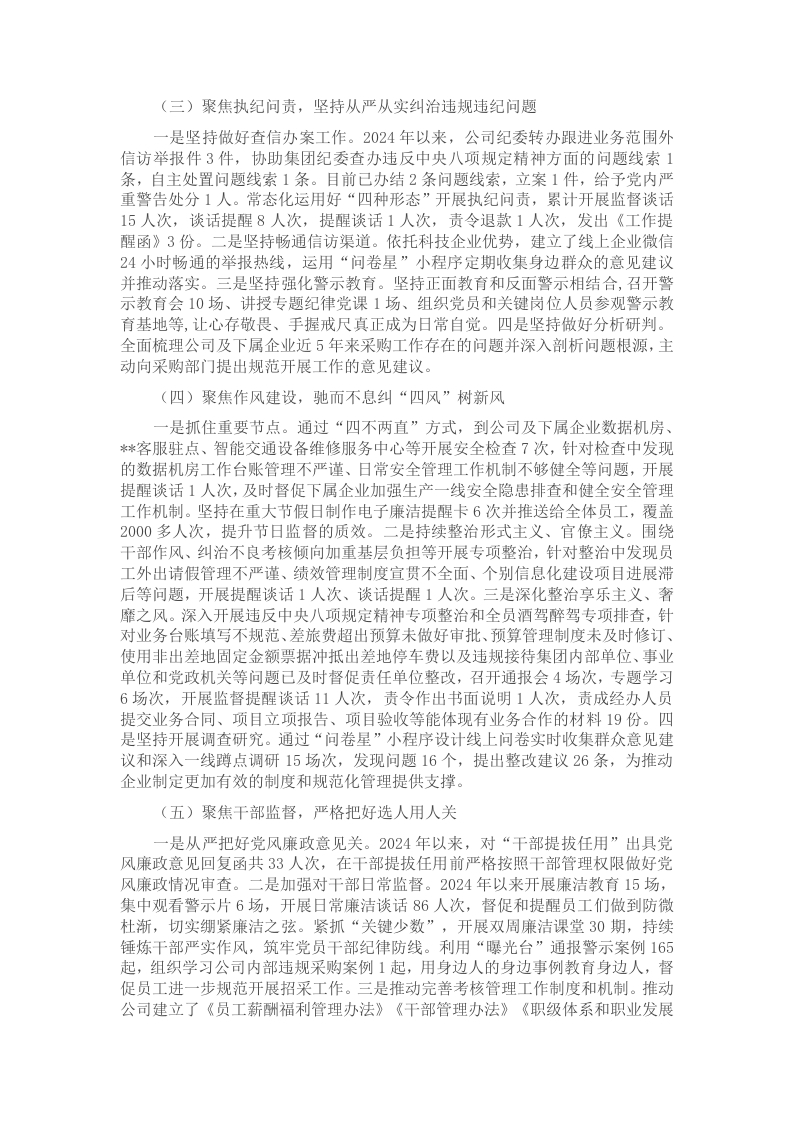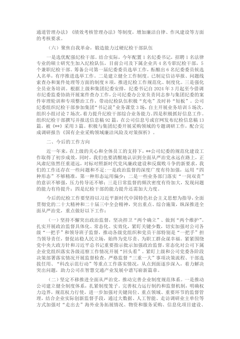 中共*有限公司纪律检查委员会(以下简称“*公司纪委”)于2024年1月成立,在上级纪委和公司党委的坚强领导下,*公司纪委逐步推进纪检机构规范化建设,聚焦主责主业,强化监督执纪问责,扎实有序推进落实工作任务,坚持用实际行动为企业改革和高质量发展提供坚强的纪律保障和营造风清气正的政治生态。现将*公司纪委2024年1月成立以来的工作情况和今后工作方向向大会报告。一、*公司纪委成立以来工作开展情况(一)聚焦政治监督,推动上级和公司决策部署落地见效紧密围绕习近平总书记重要指示批示精神、上级和公司各时期的重大决策部署加强监督检查,持续推进政治监督具体化、精准化、常态化。一是抓实政治监督检查。通过列席会议、“四不两直”实地检查、蹲点调研等方式开展政治监督13场,针对发现的问题及时督办责任部门落实整改。将“落实巡视巡察整改工作情况”列为政治监督重点,督促公司下属*公司党总支部在2024年6月完成市国资委党委巡察反馈意见15个问题整改,督促公司下属*公司党总支部集中力量抓好2021年市国资委党委巡察指出“发展战略与实际脱节”问题的持续整改工作。今年以来共开展巡察整改“回头看”6场次,发现个别部门未及时规范整理整改工作台账、开展检查的重点不够聚焦等问题,已督办责任部门抓好整改。二是抓牢理论武装。与公司党委联合开展党的二十届三中全会专题学习会,举办党纪学习教育读书班3期,召开主题党课16场次,向党员发放《条例》口袋书142本,推动党纪学习教育常态化长效化。三是推动重点任务落地。列席14次会议对公司承办首届(*)国际公共交通新能源和数字科技产业博览会工作进行督办:推动公司积极布局数字化转型工作,在*公司试点数字化转型与业财融合分析业务,计划成熟后推广到集团体系使用。(二)聚焦日常监督,在发现和推动解决问题上下功夫结合公司及下属企业业态开展21场监督检查,发现问题19个,提出监督意见17条并推动整改落实。一是瞄准重点项目强监督。通过列席22次例会和日常谈心谈话,对“走出去”海外市场拓展项目进展情况开展督办和开展廉政提醒,督促业务部门通过ITS世界大会平台,成功推出智慧公交大脑海外版,同沙特达成数字化系统建设合作协议,积极争取阿联酋智能公交项目,成功落地**车载设备集成项目,并成功拓展新加坡新增项目。二是瞄准“三重一大”决策事项强监督。坚持列席公司党委会及下属公司支委会43场,提出监督意见13条。抽查下属企业“三重一大”电子监察系统填报事项77项,发现未及时填报18项并督促责任单位落实整改,推动重要事项决策制度化合规化。三是瞄准异地企业人员强监督。运用线上腾讯会议等通信软件向异地企业党员和关键岗位人员开展线上廉洁教育活动16场。将异地企业的“三公经费”统一实现数字化监督,通过采集和比对费用报销数据,发现10组业务接待使用固定手撕连号发票报销,经办人员比实际费用多报销68.9元,目前已督办清退并给予谈话提醒1人次,同时督办财务部门和办公室进一步规范报销固定发票的明确要求。四是瞄准重点领域强监督。对公司及下属企业2021年至今的采购项目开展情况开展专项监督检查,针对采购项目归档资料问题整改不彻底、未按规定向中选单位发出《成交通知书》、采购文件制定不严谨、评审工作不规范等共性问题6个,督促采购部门落实整改,给予谈话提醒2人。