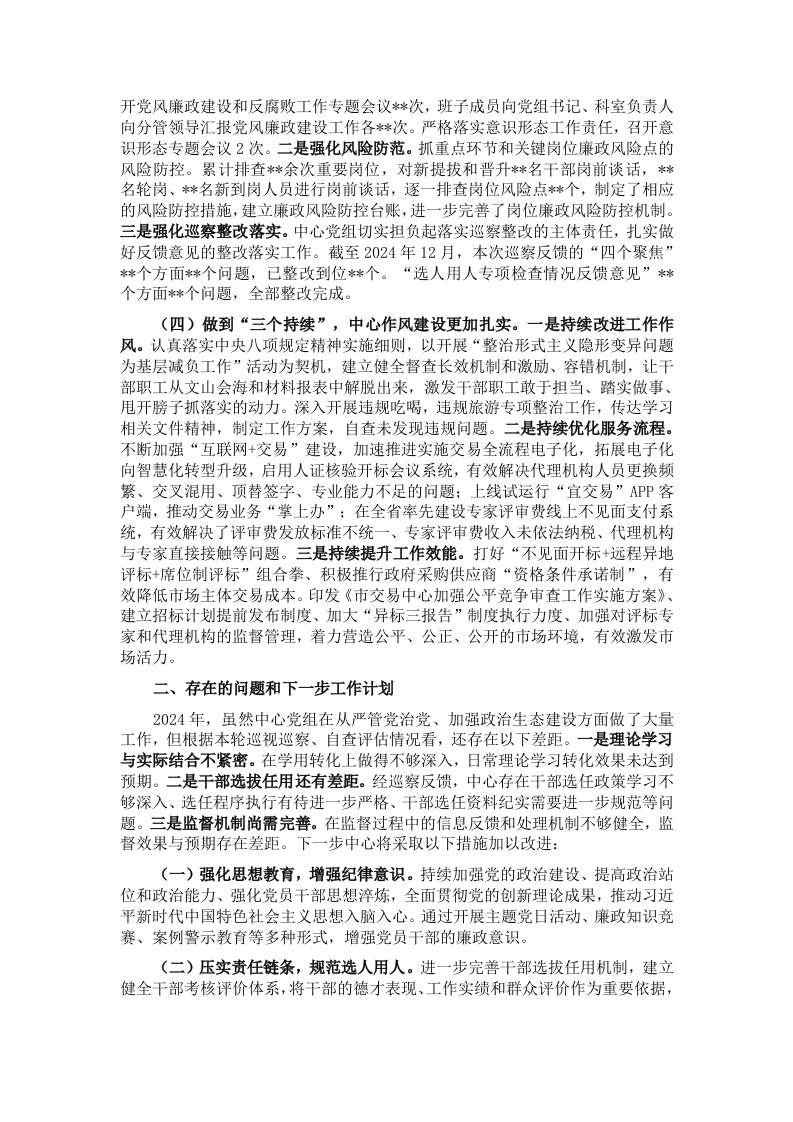 今年以来,中心党组坚持以习近平新时代中国特色社会主义思想为指导,认真学习贯彻党的二十大、二十届三中全会、二十届中央纪委三次全会精神以及习近平总书记视察重要讲话精神,坚持严的主基调不动摇,强化管党治党政治责任,不断推进全面从严治党党风廉政建设和反腐败工作向纵深发展,为高质量做好交易工作提供了坚强的政治和纪律保障。一、总体情况(一)做到“三个深化”,政治理论学习更加深入。一是深化创新理论武装。严格落实“第一议题”制度,坚持把学习贯彻习近平新时代中国特色社会主义思想、党的二十大、二十届二中全会精神和全国两会精神作为理论学习的首要内容和组织生活的必修课,及时跟进学习贯彻习近平总书记最新重要讲话和上级有关文件精神。今年共召开党组理论学习中心组学习*次,研讨交流*次*人(次),开展青年学习小组“书香机关悦读赋能”活动*次,有效引导全体党员干部领会新思想、新精神,掌握新形势、新任务,明晰新部署、新要求。二是深化党纪学习教育。扎实开展党纪学习教育,成立党纪学习教育专班。组织开展党纪学习教育读书班暨理论学习中心组专题学习会,党组成员逐条逐句、原原本本领学《条例》,并进行辅导讲解,围绕“六大纪律”进行了研讨交流,组织观看廉政警示教育片《变质的一线总指挥》,全体党员赴市纪委监委警示教育基地开展现场廉政警示教育。党组书记做了题为《行于可行,止于当止,以严守党纪的坚定执着,营造营造公平公正交易环境》的纪律党课,促使党员干部学纪、知纪、明纪、守纪。理论学习中心组学习会议专题党纪学习教育*次、“三会一课”、青年学习小组分别学习*次。三是深化制度机制建设。强化制度学习,完善学习议程,确保制度落实。党组书记作为“第一议题”学习制度第一责任人,带头领学督学、及时跟踪指导,对学习主题、学习内容、学习过程和学习效果负总责,确保理论学习不流于形式、不走过场。持续加强党的政治建设、提高政治站位和政治能力、强化党员干部思想淬炼,推动习近平新时代中国特色社会主义思想入脑入心。(二)做到“三个坚持”,党内政治生活更加严肃。一是坚持民主集中制原则。严格落实民主集中制、“三重一大”等决策制度和党支部议事规则等规章制度,对涉及重大问题和事关全体干部切身利益的重大事项,切实做到该上会的一律上会,必须决策的集体研究。“三重一大”研究事项及时向市纪委监委派驻市发展改革委纪检监察组报告或备案,中心“三重一大”事项决策会议召开前主动邀请所在派驻纪检监察组参加。2024年累计召开中心党组会*次。二是坚持批评与自我批评。年初召开2023年度民主生活会,11月召开中心党组巡察整改专题民主生活会,均能做到从严从实开展批评和自我批评,问题找得准、根源挖得深、相互批评有辣味、整改措施提得实,达到了统一思想、提升境界、增进团结、推动工作的预期效果。三是坚持抓党建引领。充分发挥“党建领航清白交易”党建品牌引领作用,持续完善交易见证管理制度、拓展系统功能、优化交易模式、提升服务质效,不断提高市场主体满意度。(三)做到“三个强化”,党内监督检查更加有力。一是强化责任落实。坚持党组统一领导,“一把手”负总责,分管领导各负其责的原则,形成“书记亲自抓、分管主任具体抓、班子成员配合抓”的领导机制和工作格局。印发《中心2024年党风廉政建设工作要点》,层层签订《2024年目标责任书》12份,召