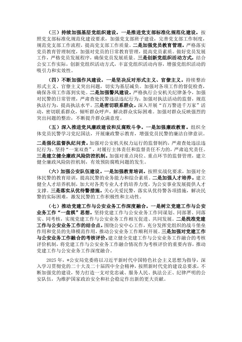 2024年,*公安局党委坚持以习近平新时代中国特色社会主义思想为指导,深入学习贯彻党的二十大及二十届三中全会精神,紧紧围绕新时代党的建设总要求,以党的政治建设为统领,全面推进党的政治建设、思想建设、组织建设、作风建设、纪律建设,把制度建设贯穿其中,深入推进反腐败斗争,不断提高党的建设质量,为公安工作提供了坚强的政治保证和组织保证。现将2024年党建工作总结及2025年党建工作计划汇报如下:一、2024年党建工作总结(一)聚焦政治建警,在加强党的政治建设上狠下功夫。一是强化政治引领。始终把党的政治建设摆在首位,教育引导全体党员民警深刻领悟“两个确立”的决定性意义,增强“四个意识”、坚定“四个自信”、做到“两个维护”。深入学习贯彻习近平新时代中国特色社会主义思想和习近平总书记关于公安工作的重要论述,严格执行“第一议题”制度,确保党中央决策部署在公安机关得到不折不扣贯彻落实。二是严肃党内政治生活。严格执行《关于新形势下党内政治生活的若干准则》,认真落实“三会一课”、主题党日、民主生活会、组织生活会等制度,提高党内政治生活质量。加强对党内政治生活的监督检查,及时发现和纠正存在的问题,增强党内政治生活的政治性、时代性、原则性、战斗性。三是加强党纪学习教育。组织党员民警深入学习党章党规党纪,教育引导党员民警严守政治纪律和政治规矩,自觉做到“五个必须”,坚决防止“七个有之”。加强对党员民警遵守政治纪律和政治规矩情况的监督检查,严肃查处违反政治纪律和政治规矩的行为。(二)聚焦思想铸魂,在强化党的思想建设上狠下功夫。一是持续深入开展主题教育。扎实常态化开展学习贯彻习近平新时代中国特色社会主义思想主题教育,坚持学思用贯通、知信行统一,把习近平新时代中国特色社会主义思想转化为坚定理想、锤炼党性和指导实践、推动工作的强大力量。二是加强理论武装。坚持用习近平新时代中国特色社会主义思想武装头脑,组织党员民警认真学习党的二十大精神,学习习近平总书记关于公安工作的重要论述,不断提高党员民警的政治理论水平。加强对党员民警的教育培训,举办各类培训班、专题讲座,推动理论学习走深走实。三是加强意识形态工作。严格落实意识形态工作责任制,加强对公安机关意识形态领域的分析研判和管控,坚决维护公安机关意识形态安全。加强对公安宣传工作的领导,弘扬主旋律,传播正能量,树立公安机关良好形象。(三)聚焦组织强基,在加强党的组织建设上狠下功夫。一是加强基层党组织建设。以提升组织力为重点,突出政治功能,加强党支部标准化规范化建设。选优配强党支部书记,加强党支部班子建设,提高党支部的凝聚力和战斗力。加强对党支部工作的指导和监督,定期开展党支部书记述职评议,推动党支部工作落实。二是加强党员队伍建设。严格党员发展标准和程序,提高党员发展质量。加强对党员的教育管理,严格执行党的组织生活制度,加强对党员的日常监督,及时处置不合格党员。发挥党员先锋模范作用,开展“党员先锋岗”创建活动,激励党员民警在工作中当先锋、作表率。三是加强党务干部队伍建设。加强对党务干部的教育培训,提高党务干部的政治素质和业务能力。关心关爱党务干部,为党务干部开展工作创造良好条件。