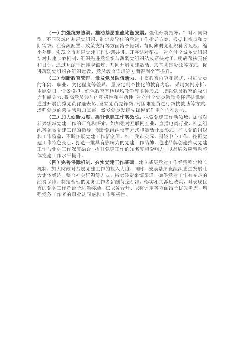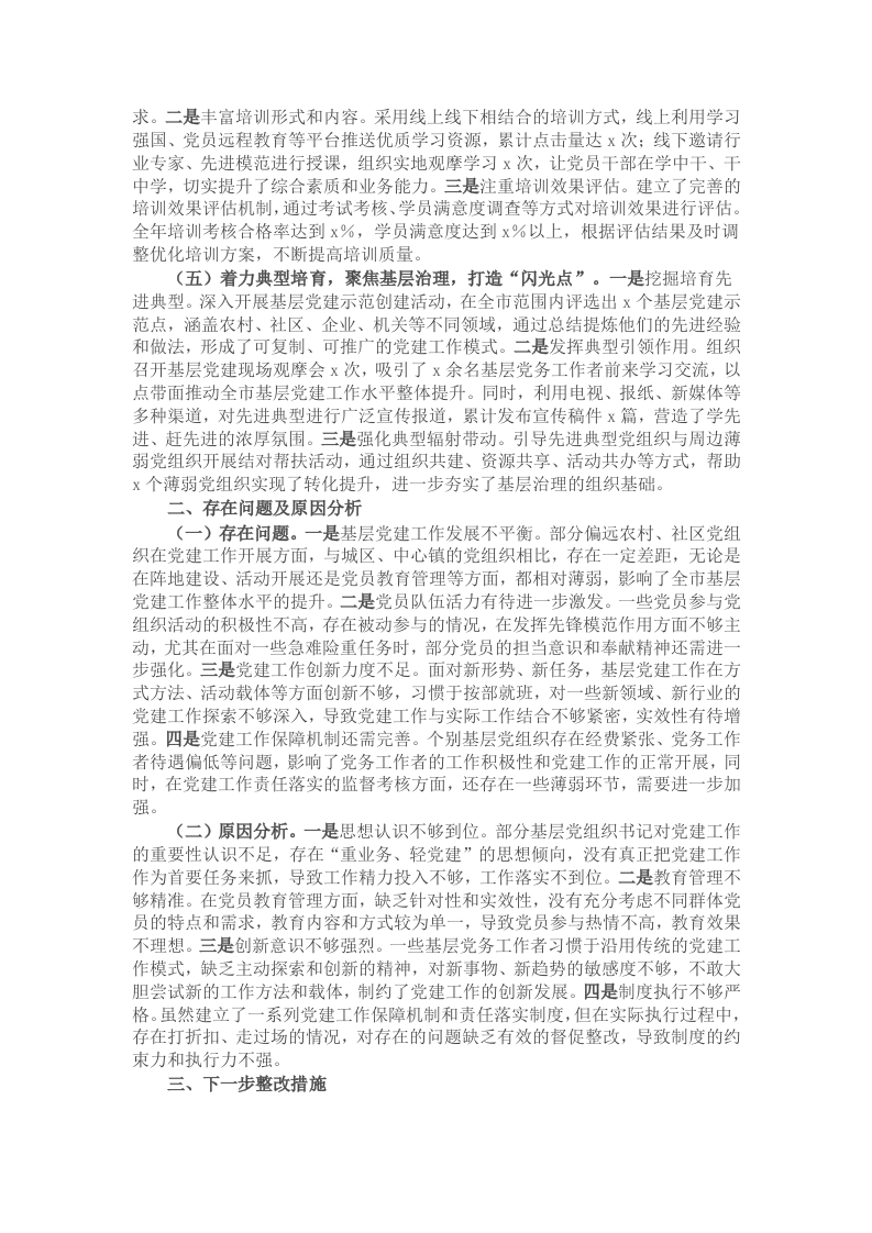 2024年,在自治区党委的坚强领导下,我市始终坚持以党建引领为核心,扎实推进基层党建各项工作,聚焦关键环节,不断夯实基层基础,努力提升基层党组织的凝聚力和战斗力,为全市经济社会高质量发展提供了坚实的组织保障。现将本年度抓基层党建工作情况汇报如下:一、工作开展情况(一)着力党建引领、聚焦固本强基,找准“切入点”。一是强化组织建设,持续优化基层党组织设置,全年共新成立x个社区党委、x个农村党总支,通过合理划分党组织架构,进一步提升了党组织覆盖的广度和深度,确保党的工作能延伸到基层各个角落。同时,严格落实“三会一课”制度,全市各基层党组织累计开展“三会一课”活动达x次,参与党员人数超过x人次,切实增强了党员的党性修养和组织纪律性。二是加强队伍建设。选优配强基层党组织带头人,通过公开选拔、竞争上岗等方式,选拔了x名政治素质高、工作能力强、群众基础好的党员担任村(社区)党组织书记。并且加大对基层党务工作者的培训力度,举办各类党务培训x期,培训人数达x余人次。二是夯实阵地建设。投入资金x万元,对全市x个老旧村(社区)党群服务中心进行升级改造,新建x个标准化的党群服务阵地,目前全市村(社区)党群服务中心面积达标率达到x%,为党员群众提供了更加便捷、舒适的活动场所,增强了党组织的吸引力和凝聚力。(二)着力共治共享、聚焦平台建设,构筑“暖新点”。一是打造多元共治平台。积极整合各方资源,搭建了涵盖社区党组织、社会组织、驻区单位、志愿者等多方参与的共治共享平台,全年共吸引了x家社会组织、x家驻区单位参与到社区治理工作中来。通过平台累计开展各类社区服务活动x次,受益群众达x人次,有效解决了社区环境整治、矛盾调解等诸多问题。二是建设“暖新驿站”服务网络。聚焦新业态新就业群体,在全市范围内建设了x个“暖新驿站”,分布在快递网点、外卖配送站点、物流园区等地,为快递员、外卖骑手、货车司机等群体提供了临时休息、充电、饮水、热饭等暖心服务。据统计,累计服务新就业群体超过x人次,进一步增强了他们的归属感和认同感,引导他们积极融入城市基层治理。三是推进线上线下融合互动。开发了“共治共享家”线上平台,注册用户达到x人,通过平台发布社区治理需求、服务项目等信息,实现线上线下资源的高效对接,累计解决群众反馈的问题x个,推动了基层治理的智能化、便捷化。(三)着力思政引路、聚焦进企入心,把握“关键点”。一是强化思想政治教育。组织企业党员开展专题学习x场次,覆盖企业党员x余人次。同时,邀请专家学者进企业举办思政讲座x场,通过深入浅出的讲解,让党的创新理论更好地走进企业、深入人心。二是推动党建与企业文化融合。指导x家重点企业将党建元素融入企业文化建设,打造了具有企业特色的党建文化长廊、党员活动室等阵地,通过开展红色主题企业文化活动x次,将党的政治优势转化为企业的发展优势,增强了企业的凝聚力和竞争力。三是助力企业发展服务。选派了x名党建指导员深入企业,帮助企业解决生产经营中遇到的实际问题,如协调解决融资难题x起,涉及金额x万元,助力企业突破发展瓶颈,实现党建工作与企业发展同频共振。(四)着力培训学习、聚焦精神提升,瞄准“需求点”。一是精准对接培训需求。通过问卷调查、实地走访等方式,收集党员干部的培训需求信息,制定了涵盖党性修养、乡村振兴、基层治理、科技创新等多个领域的个性化培训菜单。全年共举办各类专题培训班x期,满足了不同岗位、不同层次党员干部的学习需