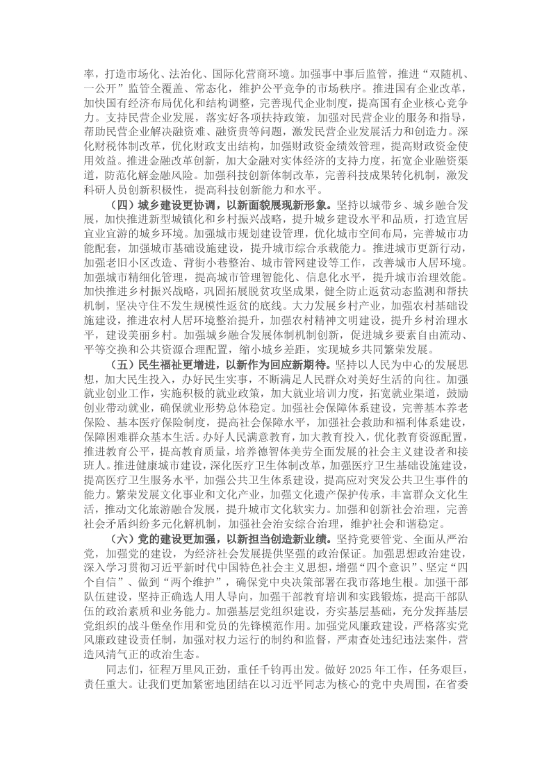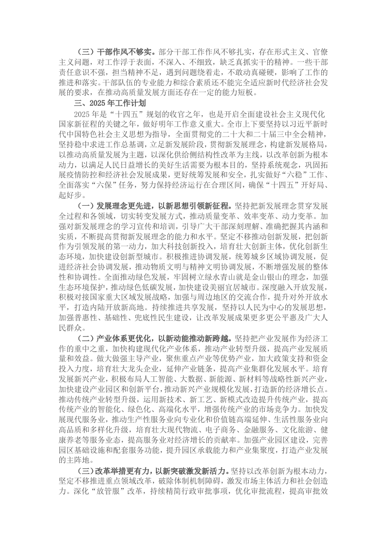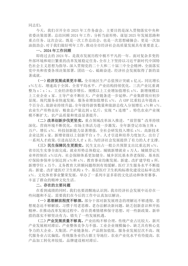 同志们:今天,我们召开全市2025年工作务虚会,主要目的是深入贯彻落实中央和省委决策部署,总结回顾2024年工作,分析当前形势,谋划2025年发展思路和重点任务。这次会议,既是一次工作总结会,也是一次思想碰撞会,更是一次加油鼓劲会,对于我们做好明年工作、推动全市经济社会高质量发展具有重要意义。一、2024年工作回顾即将过去的2024年,是我市发展历程中极不平凡的一年。面对复杂多变的外部环境和艰巨繁重的改革发展稳定任务,全市上下坚持以习近平新时代中国特色社会主义思想为指导,深入贯彻党的二十大和二十届三中全会精神,全面落实党中央和省委各项决策部署,团结一心、砥砺奋进,经济社会发展取得了新的显著成就。(一)经济发展成果更丰硕。全市地区生产总值预计突破x亿元,同比增长x%左右,增速高于全国、全省平均水平。产业结构持续优化,三次产业比重调整为x:x:X。工业经济稳步增长,规模以上工业增加值增长x%,新增规模以上工业企业x家。主导产业不断壮大,产业链条进一步延伸,产业集群效应初步显现。现代服务业快速发展,服务业增加值增长x%,占GDP比重较去年提高x个百分点。旅游业持续升温,全年接待游客数量和旅游总收入分别增长x%和x%。农业生产形势良好,粮食总产量达到x亿斤,实现“x连增”,特色农业产业规模不断扩大,农产品质量和效益显著提升。(二)改革创新步伐更坚实。重点领域改革深入推进,“放管服”改革持续深化,营商环境不断优化,市场主体活力进一步激发,全年新登记市场主体x万户,增长x%。科技创新能力显著增强,全社会研发投入增长x%,高新技术企业达到x家,新增省级以上创新平台x个。人才引进和培养力度加大,出台了一系列人才政策,引进高层次人才x名,为经济社会发展提供了有力的人才支撑。(三)民生保障民生更殷实。民生支出占一般公共预算支出比重达到x%,省市民生实事全面完成。就业形势总体稳定,城镇新增就业x万人,城镇登记失业率控制在x%以内。社会保障体系更加健全,城乡居民基本养老保险、基本医疗保险参保率分别达到x%和x%。教育事业均衡发展,新建、改扩建学校x所,新增学位x万个,义务教育大班额问题得到有效缓解。医疗卫生服务水平不断提高,新建、改扩建医疗卫生机构x个,基层医疗卫生机构标准化建设达标率达到x%。文化体育事业繁荣发展,举办了一系列丰富多彩的文化活动和体育赛事,丰富了群众的精神文化生活。二、存在的主要问题在看到成绩的同时,我们也要清醒地认识到,我市经济社会发展中还存在一些问题和不足,需要我们在今后的工作中认真加以解决。(一)思想解放程度不够深。部分干部对新发展理念的理解还不够透彻,思想观念还不够解放,习惯于用老思维、老办法解决新问题,缺乏创新意识和开拓精神。在推动改革发展过程中,存在畏难情绪和保守思想,对一些新政策、新举措的落实不够坚决有力,错失了一些发展机遇。(二)产业发展质量不够高。产业结构不够合理,传统产业占比较大,新兴产业发展相对滞后,产业整体竞争力不强。工业企业规模偏小,缺乏具有核心竞争力的大企业、大集团,产业链条短,产品附加值低。服务业发展层次不高,现代服务业占比偏低,传统服务业仍占据主导地位。农业产业化水平有待提高,农产品加工转化率较低,品牌建设相对滞后。