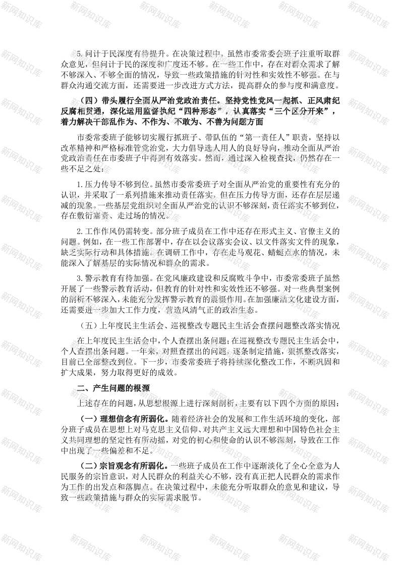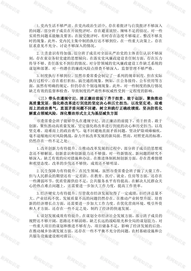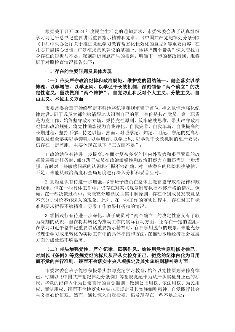根据关于召开2024年度民主生活会的通知要求,市委常委会班子认真组织学习习近平总书记重要讲话重要指示精神和党章、《中国共产党纪律处分条例》《中共中央办公厅关于推进党纪学习教育常态化长效化的意见》等重要内容,在扎实开展谈心谈话、广泛征求意见建议的基础上,围绕“四个带头”深入查找自身存在的短板与不足,深刻剖析问题产生的根源,明确下一步的整改措施。现将班子对照检查情况报告如下:一、存在的主要问题及具体表现(一)带头严守政治纪律和政治规矩,维护党的团结统一。健全落实以学铸魂、以学增智、以学正风、以学促干长效机制,深刻领悟“两个确立”的决定性意义,坚决做到“两个维护”,自觉防止和反对个人主义、分散主义、自由主义、本位主义方面市委常委会班子始终坚定不移地将纪律和规矩置于首位,持之以恒地强化纪律建设。班子成员大都能够清醒地认识到自己的第一身份是共产党员,第一职责是为党工作,始终坚守政治立场、秉持党性原则、筑牢底线思维,带头严守政治纪律和政治规矩,将党性锤炼视为自我净化、自我完善、自我革新、自我提高的长期过程,坚持不懈、持之以恒。然而,对照学纪、知纪、明纪、守纪的更高标准以及健全落实以学铸魂、以学增智、以学正风、以学促干长效机制的更严要求,仍存在一定差距,主要体现在以下“三方面不足”:1.政治站位有待进一步提高。在面对复杂多变的国内外形势和艰巨繁重的改革发展稳定任务时,部分班子成员在政治敏锐性和政治洞察力方面还需进一步增强。有时对一些敏感问题的认识和把握不够准确,对一些潜在的风险和挑战估计不足,未能从政治高度和全局角度进行深入分析和妥善应对。2.规矩意识有待进一步增强。尽管班子成员在总体上能够遵守政治纪律和政治规矩,但在一些具体工作中,仍存在对某些规章制度执行不够严格的情况。例如,在一些决策过程中,未能充分遵循民主集中制原则,存在个别成员发表意见不充分、讨论不够深入的现象。此外,在一些工作的落实过程中,存在对工作标准和要求把握不够精准,导致工作效果打折扣的情况。3.领悟践行有待进一步深化。班子成员对“两个确立”的决定性意义有了较为深刻的认识,但在将其转化为推动工作的实际行动方面,还存在一定的差距。在学习习近平总书记重要讲话重要指示精神时,存在学用脱节的现象,未能充分将理论学习成果转化为实际工作中的具体举措和方法,在推动本地经济社会发展方面的成效还不够显著。(二)带头增强党性、严守纪律、砥砺作风。始终用党性原则修身律己,时刻以《条例》等党规党纪为标尺从严从实检身正己,把党的纪律内化为日用而不觉的言行准则,锲而不舍落实中央八项规定及其实施细则精神等方面市委常委会班子能够积极带头参与党纪学习教育,始终以党性原则来修身律己,时刻以《中国共产党纪律处分条例》等党规党纪作为从严从实检身正己的标尺,将党的纪律内化为日常言行的自觉准则,做到公正用权、依法用权、为民用权、廉洁用权,锲而不舍地落实中央八项规定及其实施细则精神,自觉践行社会主义核心价值观。然而,通过深入自我检视,仍发现存在一些不足之处:
