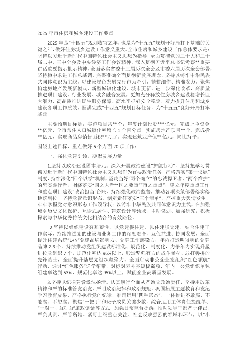 2025年市住房和城乡建设工作要点2025年是“十四五”规划收官之年,也是为“十五五”规划开好局打下基础的关键之年,做好住房城乡建设工作意义重大。全市住房和城乡建设工作总体要求是:坚持以习近平新时代中国特色社会主义思想为指导,全面贯彻党的二十大和二十届二中、三中全会及中央经济工作会议精神,深入贯彻习近平总书记考察*重要讲话重要指示批示精神,全面落实省委十三届历次全会及市委六届历次全会部署,坚持稳中求进工作总基调,完整准确全面贯彻新发展理念,坚持以铸牢中华民族共同体意识为主线,以建设绿色发展先行市为牵引,精耕细作、精准发力,聚焦构建房地产发展新模式、新型城镇化建设、城市更新,进一步深化改革,高质量推进项目建设、行业发展、城乡融合发展,更加充分释放住房城乡建设稳增长巨大潜力,高品质推进民生服务保障、高水平抓好安全稳定,着力提升住房和城乡建设各项工作质效,圆满完成“十四五”规划目标任务,为“十五五”良好开局打牢基础。主要预期目标是:实施项目共*个,年度计划投资**亿元,完成上争资金*亿元,全市常住人口城镇化率增长1个百分点。实施房地产项目*个,完成投*亿元,实现商品房销售面积*万。实现建筑业产值*亿元,同比持平。围绕上述目标,重点做好6个方面20项工作:一、强化党建引领,凝聚发展力量1.坚持以政治建设固本培元。深入开展政治建设“护航行动”,坚持把学习贯彻习近平新时代中国特色社会主义思想作为首要政治任务,严格落实“第一议题”制度,持续深化“四个以学”机制,坚决当好“两个确立”的忠诚捍卫者、“两个维护”的忠实践行者。围绕落实“国之大者“区之要事”“市之重点”,建立年度重点工作和重点项目建设“政治担当”台账,持续强化政治监督,推动各项决策部署落实落地落到位。坚持党管意识形态,制定责任落实“三个清单”,严控重大舆情发生,牢牢掌握党对意识形态工作领导权:以铸牢中华民族共同体意识为主线,在加强城乡历史文化保护、互嵌式居住、建筑设计等领域,主动谋划、加强研究,积极探索与中华优秀传统文化相结合的有效路径。2.坚持以组织建设夯基塑性。以党建促住建,以住建强党建,结合住建工作实际,持续推进党的建设与业务工作的深度融合、互促共进、协同发展,全面提升住建系统“1+N"党建品牌影响力、党建工作感染力,年内打造叫得响的党建品牌23个。持续推动党组织建设标准化、规范化、制度化,力争年内实现升星进位党组织7个,规范化率达96%以上,锻造坚强有力的战斗堡垒、敢打善拼的先锋战士,全面提升基层党组织凝聚力。全面启动非公企业党组织“红色领航”行动,通过“红色服务”送学帮带,对标对表补齐短板弱项,年内非公党组织单独组建率达到53%,规范化率达95%以上,赋能企业高质量发展。3.坚持以纪律建设激浊扬清。认真履行全面从严治党政治责任,坚持用改革精神和严的标准管党治党,严明政治纪律和政治规矩,巩固拓展主题教育和党纪学习教育成果,严格执行党的纪律,准确运用“四种形态”,一体推进不敢腐、不能腐、不想腐。聚焦“一把手”和班子成员关键少数,综合运用主体责任提醒单、“一对一、面对面”廉政谈话等方式,加强日常监督提醒,推动领导干部严于律己严负其责、严管所辖。紧盯上级重点关注、社会反映强烈的领域和环节,以“小
