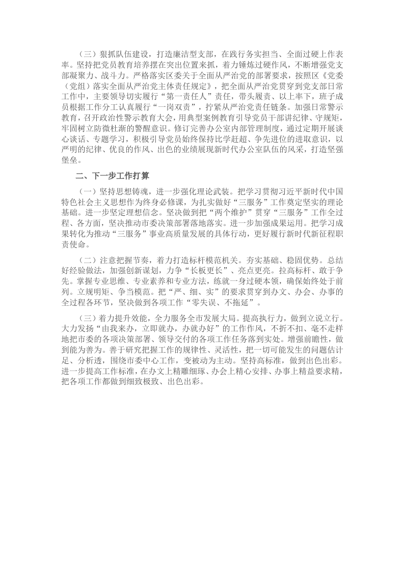 今年以来,我始终坚持以习近平新时代中国特色社会主义思想为指导,认真贯彻落实新时代党的建设总要求,以习近平总书记关于办公厅工作“五个坚持的重要指示为根本遵循,以深化“四强”党支部建设为目标,紧紧围绕区委中心工作,强化党建引领,服务发展大局,不断提升“三服务”水平,擦亮“服务型机关”党建品牌,以高质量党建打造全区第一政治机关。一、主要工作情况(一)深化政治引领,建设学习型支部,在打造政治机关、模范机关上作表率。一是坚持政治引领。坚守政治机关定位,坚决落实“第一议题”学习制度,把学习贯彻习近平新时代中国特色社会主义思想和党的二十大及二十届三中全会精神作为重要政治任务,今年以来组织召开集中学习17次,积极开展交流研讨、座谈畅聊等活动,教育引导党员干部忠诚捍卫“两个确立”,坚决做到“两个维护”。二是发挥战斗堡垒作用。深入挂钩社区践行初心,弘扬“四下基层”优良作风,落实在职党员到挂钩社区报到制度,推动党的工作联建、政策宣传联动、文明新风联树、环境卫生联创、治安维稳联防、便民服务联办、帮扶济困联做等工作同向发力,助力“党建+”邻里中心建设。三是深化党风廉政建设。扎实开展党纪学习教育,严肃党内政治生活,区委领导自觉以普通党员身份参加支部“三会一课”、组织生活会,办公室主要负责同志带头讲授党纪学习教育专题党课,持续营造风清气正良好政治生态。(二)坚持守正创新,建设效能型支部,在做好参谋助手、服务大局上作表率。坚持推动机关党建与业务工作深度融合,紧紧围绕大局、时时聚焦大局、处处服务大局,使各项工作和服务紧贴区委需要、适应区委要求,坚决当好区委的参谋助手和前哨后院。一是坚持统筹协调抓保障。充分发挥党办综合协调作用,高标准做好会务、接待工作,今年以来承担重要会议组织33次,协调部门会议20余次,完成接待任务18次。严格落实24小时值班机制,做好紧急信息上报,保障机关高效运转。做好国家安全和机要保密工作,常态化开展失密泄密风险隐患排查提醒。扎实开展整治形式主义为基层减负,发文数量、会议时长均明显下降。二是坚持以文辅政促发展。抓好文稿写作工作,重于出思路、出观点、出真招,力求与区委部署同频共振,使文稿成为服务区委决策、推动工作落实的“直通车”。全年完成领导讲话、汇报等综合性文稿200余篇。围绕网格化、廊道绿化等进行调查研究,为区委开展工作提供决策依据和参考。围绕全区重点工作及市委信息处采编重点,紧盯党中央、省委、市委重大决策部署,积极向省委、市委上报信息、约稿,展示全区形象,反映民生热点,信息工作进入全省、全市优秀行列。三是坚持深化改革提质效。创新区委常委会每周听取重点改革项目汇报制度,谋划年度重点改革项目,推动改革突破见效。围绕区委中心工作和全区改革发展大局,打造“世遗典范”文旅深度融合发展机制等被列入全省“一县一特色”专项改革项目。今年以来新争取国家级、省级改革试点示范区6个,在省、市刊登我区改革调研信息13篇。区委办公室被评为“全区党史系统2024年度信息工作先进单位”。四是坚持督查督办抓落实。用心用情解决好群众急难愁盼问题,今年以来,共办理民生事项6617件,办理人民网留言340件。紧紧围绕区委重点工作和群众关注的热点、难点问题真督实查,制发了《全区区2024年重点工作分解立项表》,每季度盯办工作进展,及时发现协调解决工作落实中的难点问题,推动全区各项重点工作落实。扎实开展月点评落后工作整改,将落后事项分解至责任单位,对存在问题逐项研究整改措施,限时办结。