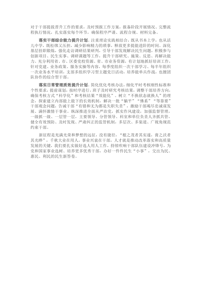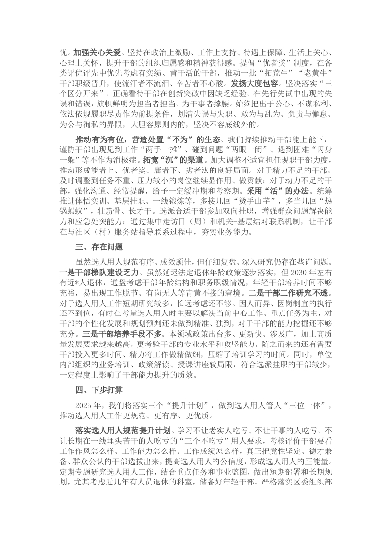 2024年是实现“十四五”规划目标任务的关键一年,是中国式现代化高质量发展的重要一年。高质量落实,靠的是千千万万勇于担当、本领高强的好干部,习近平总书记强调,“用一贤人,则群贤毕至,见贤思齐就会蔚然成风”。我局党委始终坚持党管干部、党管人才原则,牢牢抓住正确选人用人导向,注重人才培养、选拔、管理,确保选树担当作为“出彩型”好干部,为新征程上事业高质量发展提供坚强人才支撑。一、基本情况根据三定规定,我局机关内设科室*个,核定行政编制*名,科级领导职数*名,其中,正科长(主任)*名,副科长(副主任)*名。目前,实有行政编制*人,正科级*人、副科级*人。2024年根据机构改革,现我局下属事业单位*个,均为全额拨款事业单位。共计核定全额拨款事业编制*人,目前,实有编制*人。2024年通过规范的程序,共晋升一级主任科员*名,选拔任用副科级以上干部*名,以上人员提拔程序均依法依规,规范有序、公开公正。二、主要做法一年来,我们坚持在选人用人导向树立上明重点,在年轻干部培养选拔上花力气,在干部队伍教育管理上重实效,重视“善为”、鼓励“敢为”、处置“不为”、防范“乱为”,激发干部奋斗热情,形成“干部想着事业、组织想着干部”的常态。树立正确导向,筑牢防范“乱为”的堤坝。我们强调选人用人正确导向,持续加大选人用人规范化力度,确保公平、公正、公开。用好考核的“尺子”全面落实新时代好干部标准,完善干部考核指标体系,用好每季度平时考核和年度考核,综合民主测评和个人自评,注重听取工作对象、服务对象等相关人员意见,全面掌握、客观评价干部,将真抓实干、成绩突出的干部选拔出来、使用起来。迈好规范的“步子”。专题研究单位干部队伍情况,根据年龄结构、能力水平、工作需要等合理制定干部提拔晋升工作方案并严格落实,有序、合规、严谨做好每个环节,充分发扬民主集中制,全体人员推荐、党委班子讨论、上级部门审批等逐一落实,确保不漏项、不出错、不违规。锻造过硬本领,不断增添“普为”的底气。干部干事创小业,既要有担当之心,也要有担当之能。聚焦干部“本领恐慌”、能力不足等问题,拿出具体措施,引导党员干部练就硬脊梁、铁肩膀。加强政治历练。始终将政治建设摆在首位,常态化组织党委中心组学习、“三会一课”,严格落实“第一议题”制度,巩固拓展主题教育成果,扎实开展党纪学习教育,锤炼坚强党性,引导党员干部加强斗争精神和斗争本领养成,不断提高政治判断力、政治领悟力、政治执行力。加强专业训练。针对党员干部履职知识空白、经验盲区和能力弱项,综合运用案例教学、经验交流、实地调研等多种方式,邀请党校专家教授现场授课、组织党务、信息宣传、发展党员、意识形态等专题培训,加强干部源头培养、跟踪培养、全程培养。突出撑腰鼓劲,有效增强“敢为”的魄力。坚持严管厚爱结合、激励约束并重,打消干部“洗碗越多摔碗越多”“动辄被追责问责”的思想顾虑和现实担