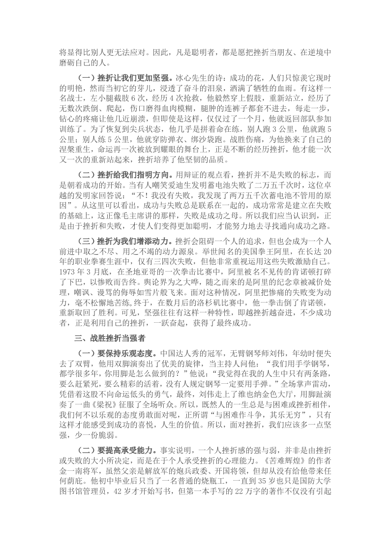 上课之前,我们通过一分钟的视频,带大家认识一个人。视频中的主人公叫力克胡哲,命运决定了他的一生必将充满坎坷、历经绝望,但即使这样,他从未放弃对命运的抗争,顽强的活出了生命的光彩。前几天,我就“什么是收获”这个问题在部分同志中搞了个小讨论,大家七嘴八舌畅所欲言,道出了自己对“收获”的认识。有的说收获就是自己想要的东西得到了;有的说收获是工作取得了成绩,受到了肯定和表彰:有的说收获是自己得到了锻炼,变得成熟了:还有的说收获就是成功,不成功就谈不到收获。不错,同志们谈的这些都是对的,但还有一种收获往往被人们所忽视,那就是一一挫折。一、挫折常伴你我他俗话说:家家有本难念的经,人人都有难唱的曲。这“难念的经”“难唱的曲”,大多是指困难和挫折。那么,我们应该怎样看待困难和挫折呢?(一)要认识到挫折不可避免。在现实生活中,谁都不希望自己经历失败,饱受挫折,但我们每个人还是不可避免地要遇到这样或那样的挫折,品味这样或那样的失败,并从中接受这样或那样的教训,这是客观现象,并不是凭我们意志决定得了的。比如:在我们单位,有的同志想要休假,但因工作任务重,条件不具备,一时不能满足;有的想学点换个岗位处室,但因条件限制不能达成:有的想晋升职级,但因名额条件等的限制不能如愿:还有的因工作失误或违纪而受到批评,等等。这些都是发生在我们身边形形色色的挫折。正如陈毅元帅在一首诗中写的:“因知天地宽,何处无风云:因知山水远,到处有不平”。这就告诉我们这样一个现实:不管你愿不愿意,挫折无时不在,无处不有。我们所处的世界就是一个充满矛盾的世界,生活中遇到一些挫折,得到一些教训是难免的,只不过各人所遇挫折的形式、内容、程度不同罢了。(二)要认识到挫折并不可怕。事实证明,遇到挫折,如果处理得好,就能成为我们迈向成功的阶梯。果农在种苹果时,如果遇到许多年只开花不结果的树,就会在树干上砍几刀,第二年就会结出累累硕果。这几刀虽然减缓、削弱了树的长势,但却有效促进了花芽形成,提高了着果率。这几刀,虽然是痛苦的,但无疑给了树实现自我的契机。我们的生活和事业,何尝不是如此呢?古往今来,无数的能人志士正是因为经历了挫折,幡然醒悟,才大有作为。司马迁在《报任安书》中写道:屈原放逐,乃赋《离骚》:左丘失明,厥有《国语》:孙子膑脚,《兵法》修列。而司马迁本人,也是因遭受李陵之祸,所以才会“述往事,思来着”,发奋著成《史记》。所以当挫折和失败来临时,以坦然、无畏的态度去迎接,把挫折和失败变成激励我们前进的动力。(三)要认识到挫折并非命中注定。生活中,有些同志遇到挫折常常哀叹命运不济,时运不佳,把挫折简单地归结为命运不好。把挫折和失败归结到命运上,只能是一时平衡心理。只有认真地正视受挫的原因,总结失败的教训,才能找到成功的方法。二、挫折是块磨刀石有这样一个故事:一个乞丐和一个富商同时迷路走进一片森林。数天之后,富商饿死了,但乞丐却依然活着。后来有人问乞丐其中的奥妙,他说:“我对饥饿已经习惯了,况且草根也可充饥:可那富商平日大鱼大肉,哪能承受这般苦,故他早我而亡。”同理,假如一个人生活中总是一帆风顺,那么他一旦遇到逆境,