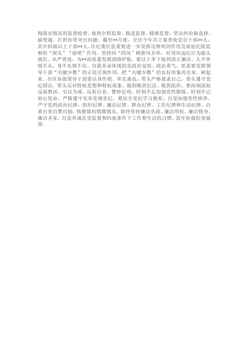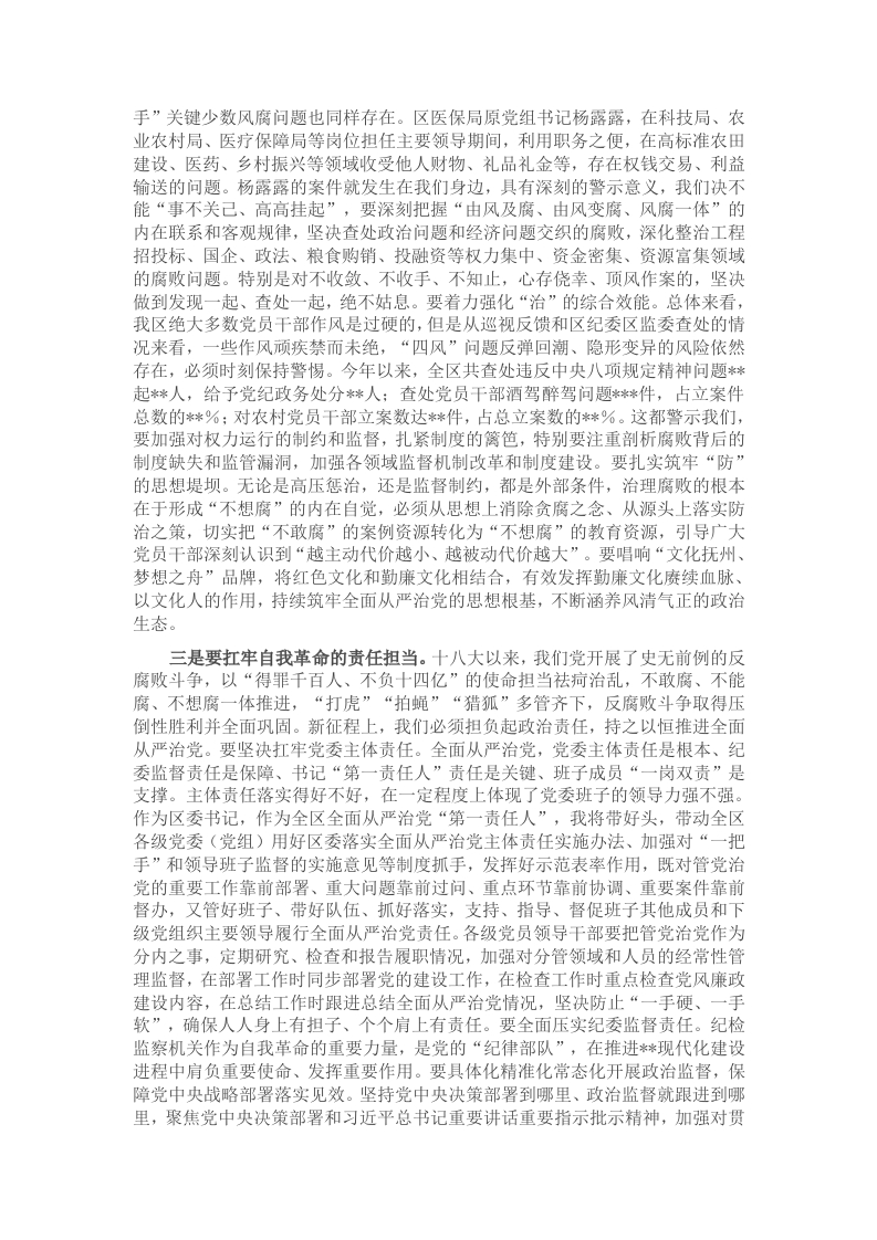 同志们:习近平总书记1月6日在中国共产党第二十届中央纪律检查委员会第四次全体会议上发表重要讲话。他强调,新时代以来,推进全面从严治党和反腐败斗争力度之大前所未有,成效有目共睹。要始终保持反腐败永远在路上的坚执着,保持战略定力和高压态势,一步不停歇、半步不退让,一体推进不敢腐、不能腐、不想腐,坚决打好这场攻坚战、持久战、总体战。为让同志们更加深刻把握党的自我革命的重要意义,结合学习习近平总书记关于党的自我革命的重要论述,有必要再次给大家强调一下党的自我革命以及加强党员干部党风廉政建设的有关问题。一是要永葆自我革命的清醒认知。勇于自我革命是我们党最鲜明的品格,是我们党最大的优势,是我们党跳出治乱兴衰历史周期率的第二个答案。党的十八大以来,以习近平同志为核心的党中央,在对新时代如何坚持和加强党的全面领导、如何深入推进新时代党的建设新的伟大工程、如何跳出治乱兴衰历史周期率的系统回答中,创造性地提出党的自我革命重大命题。这一思想内涵丰富,主要体现为“六个必须”的原则性要求和“九个坚持”的规律性认识。(“六个必须”即:必须坚持以党的政治建设为统领,坚守自我革命根本政治方向:必须坚持把思想建设作为党的基础性建设,淬炼自我革命锐利思想武器:必须坚决落实中央八项规定精神、以严明纪律整饬作风,丰富自我革命有效途径:必须坚持以雷霆之势反腐惩恶,打好自我革命攻坚战、持久战:必须坚持增强党组织政治功能和组织力凝聚力,锻造敢于善于斗争、勇于自我革命的干部队伍:必须坚持构建自我净化、自我完善、自我革新、自我提高的制度规范体系,为推进伟大自我革命提供制度保障。“九个坚持”即:坚持党中央集中统一领导,坚持党要管党、全面从严治党,坚持以党的政治建设为统领,坚持严的主基调不动摇,坚持发扬钉钉子精神加强作风建设,坚持以零容忍态度惩治腐败,坚持纠正一切损害群众利益的腐败和不正之风,坚持抓住“关键少数”以上率下,坚持完善党和国家监督制度,形成全面覆盖、常态长效的监督合力。)我们要全面把握自我革命的战略考量、核心要义,始终保持“永远在路上”的清醒和坚定。近年来,查处的肖毅、方百春、罗富杨、邱建国、高连珠等案件反映出,一些领导干部精神空虚、意志消沉、心为物役,政治上变质、经济上贪婪、道德上堕落、生活上腐化,严重污染地方政治生态,严重背离了党的优良传统。我们要传承红色基因,明白红色江山来之不易,守好江山责任重大,自觉用习近平新时代中国特色社会主义思想改造主观世界。要坚持用党的创新理论武装头脑,在新时代应对重大挑战、抵御重大风险、克服重大阻力、化解重大矛盾、解决重大问题上保持高度的战略清醒和战略定力。要严格遵守党的政治纪律和政治规矩,锤炼不踩红线、不越底线、不碰高压线的政治品格,做到心有所畏、言有所戒、行有所止。二是要贯彻自我革命的实践要求。我们要清醒地认识到,当前反腐败斗争形势依然严峻复杂,决不能有歇歇脚、松口气、差不多的思想,必须以零容忍态度反腐惩恶不动摇,一体推进“三不腐”的基本方针,全面打赢反腐败斗争攻坚战持久战。要始终保持“惩”的高压态势。惩处是遏制震慑的必要手段,必须雷霆万钧、持续加压、力量常在。比如,魏晓奎书记在廉政党课中指出,全市有的领导干部政治上离心离德、思想上蜕化变质、组织上拉帮结派、行动上阳奉阴违,对党不忠诚、不老实,当“两面人”:有的三五成群,吃吃喝喝,套近乎、攀交情、扯关系:有的怀着私心杂念搞亲疏远近、你来我往、人身依附。我区“一把