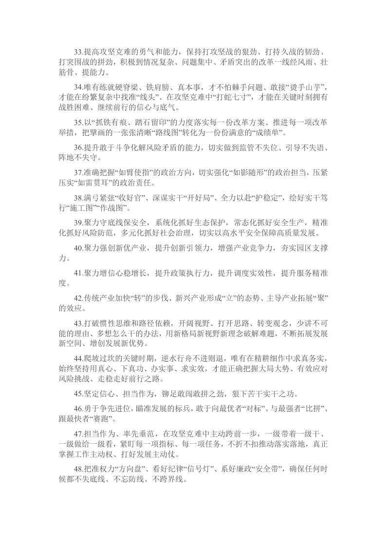 1.以逢山开路、遇水架桥的精神,义无反顾、亮剑前行,就没有挑不动的千钧担”,就没有过不去的“火焰山”,就没有攻不下的“娄山关”。2.在攻坚克难中担当作为,要敢于直面问题,把逆水行舟、滚石上山作为工作常态、工作习惯,时刻秉持一股韧劲冲劲干劲,在困难面前不怕苦不畏难,在挑战面前不退缩不言败。3.以抢的意识抓机遇、争政策、引项目,以拼的劲头提速度、提质量、提效益,争取行动快人一拍、落子先人一步、发展胜人一筹。4树牢系统思维,坚持从全局谋划一域、以一域服务全局,把各方面联系起来分析、统筹起来谋划,协调推进各领域工作,增强工作取向的一致性、工作举措的耦合性。5.坚持干字当头、实干为要,树立和践行正确政绩观,不慕虚荣、不务虚功,练就担当作为的硬脊梁、铁肩膀、真本事,在精耕细作中求真务实,在真抓实干中砥砺前行。6志不求易者成,事不避难者进。攻坚克难、迎难而上,彰显的是政治勇气,考验的是能力本领,反映的是担当作为。7有信心、有决心、有恒心,出思路、出办法、出成绩,不折不扣抓好贯彻落实,坚定信心不动摇、咬定目标不放松、落实责任不松劲、转变作风不懈怠,步一个脚印抓出成效。8准确把握形势、坚定发展信心、保持战略定力,把工作任务扛起来,把贯彻执行抓起来,把工作作风树起来。9扛起主动作为的责任,保持清正廉洁的本色,凝聚团结协作的合力。10.“点”上稳企业,“线”上抓行业,“面”上优环境,多措并举强动能、增活力,努力巩固扩大向上向好的发展势头。11.牢记嘱托忠诚实干,提高本领攻坚实干,精耕细作争先实干,担当作为真抓实干,上下同心团结实干。12.坚持用创新思维、改革办法,解决发展中遇到的瓶颈和难题。敢于涉险滩、破坚冰,真正以知难而进的“硬劲”、迎难而上的冲劲”、攻坚克难的“拼劲”,抓实改革,推动发展。13.保持赶考的心态、奋斗的姿态和答卷的状态,务实重行、积极作为,始终坚持“少开会、上一线,懂专业、亲自干”,在谋事中促发展、干事中树形象、成事中赢民心。14.干出了稳健向好、进中提质的大好局面,交出了一份领跑提劲、振奋人心的精彩答卷15.在“大党建”中领航奋进。坚持工作中找问题、党建上找原因、改革中找办法。16.在“大开放”中高歌猛进。树牢大开放思维、构筑大开放通道、建强大开放载体,“走出去,世界就在眼前:走不出去,眼前就是世界理念深入人心。