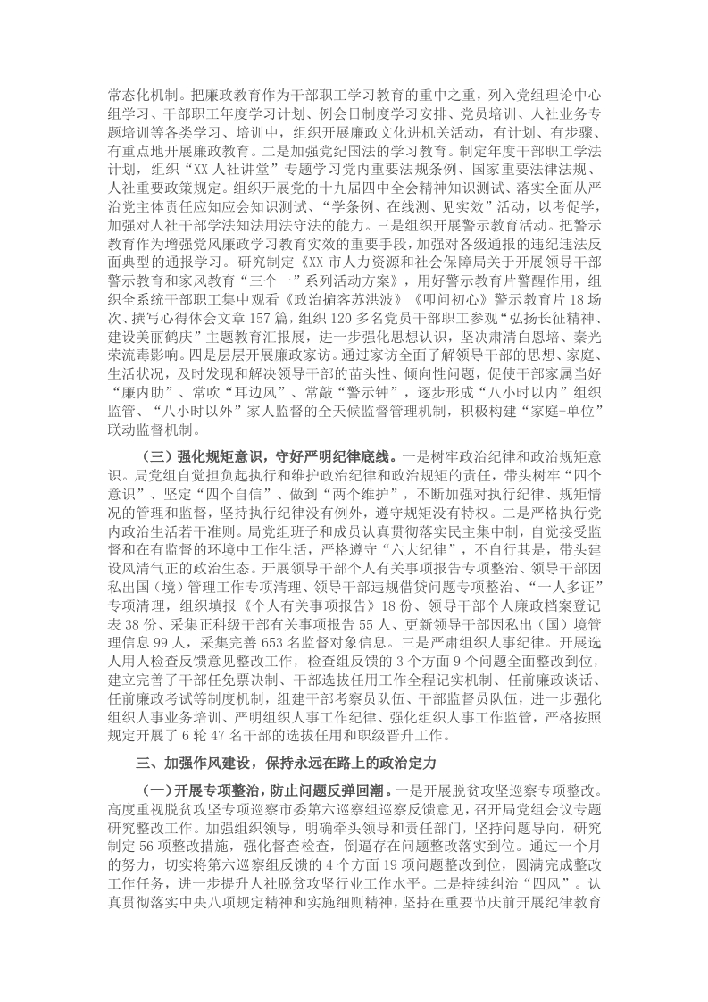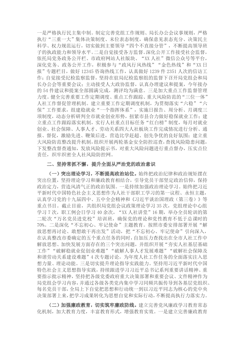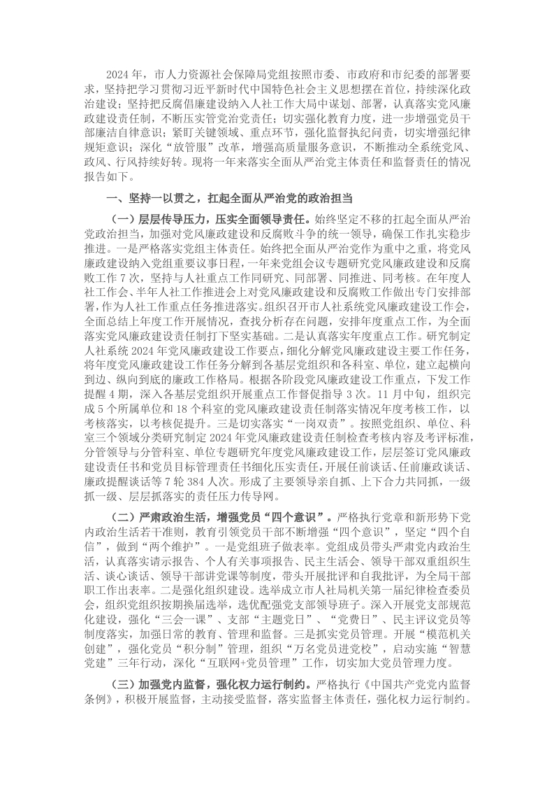2024年,市人力资源社会保障局党组按照市委、市政府和市纪委的部署要求,坚持把学习贯彻习近平新时代中国特色社会主义思想摆在首位,持续深化政治建设:坚持把反腐倡廉建设纳入人社工作大局中谋划、部署,认真落实党风廉政建设责任制,不断压实管党治党责任:切实强化教育力度,进一步增强党员干部廉洁自律意识:紧盯关键领域、重点环节,强化监督执纪问责,切实增强纪律规矩意识:深化“放管服”改革,增强高质量服务意识,不断推动全系统党风、政风、行风持续好转。现将一年来落实全面从严治党主体责任和监督责任的情况报告如下。一、坚持一以贯之,扛起全面从严治党的政治担当(一)层层传导压力,压实全面领导责任。始终坚定不移的扛起全面从严治党政治担当,加强对党风廉政建设和反腐败斗争的统一领导,确保工作扎实稳步推进。一是严格落实党组主体责任。始终把全面从严治党作为重中之重,将党风廉政建设纳入党组重要议事日程,一年来党组会议专题研究党风廉政建设和反腐败工作7次,坚持与人社重点工作同研究、同部署、同推进、同考核。在年度人社工作会、半年人社工作推进会上对党风廉政建设和反腐败工作做出专门安排部署,作为人社工作重点任务推进落实。组织召开市人社系统党风廉政建设工作会,全面总结上年度工作开展情况,查找分析存在问题,安排年度重点工作,为全面落实党风廉政建设责任制打下坚实基础。二是认真落实年度重点工作。研究制定人社系统2024年党风廉政建设工作要点,细化分解党风廉政建设主要工作任务,将年度党风廉政建设工作任务分解到各基层党组织和各科室、单位,建立起横向到边、纵向到底的廉政工作格局。根据各阶段党风廉政建设工作重点,下发工作提醒4期,深入各基层党组织开展重点工作督促指导3次。11月中旬,组织完成5个所属单位和18个科室的党风廉政建设责任制落实情况年度考核工作,以考核落实,以考核促提升。三是切实落实“一岗双责”。按照党组织、单位、科室三个领域分类研究制定2024年党风廉政建设责任制检查考核内容及考评标准,分管领导与分管科室、单位专题研究年度党风廉政建设工作,层层签订党风廉政建设责任书和党员目标管理责任书细化压实责任,开展任前谈话、任前廉政谈话、廉政提醒谈话等7轮384人次。形成了主要领导亲自抓、上下合力共同抓,一级抓一级、层层抓落实的责任压力传导网。(二)严肃政治生活,增强党员“四个意识”。严格执行党章和新形势下党内政治生活若干准则,教育引领党员干部不断增强“四个意识”,坚定“四个自信”,做到“两个维护”。一是党组班子做表率。党组成员带头严肃党内政治生活,认真落实请示报告、个人有关事项报告、民主生活会、领导干部双重组织生活、谈心谈话、领导干部讲党课等制度,带头开展批评和自我批评,为全局干部职工作出表率。二是强化组织建设。选举成立市人社局机关第一届纪律检查委员会,组织党组织按期换届选举,选优配强党支部领导班子。深入开展党支部规范化建设,强化“三会一课”、支部“主题党日”、“党费日”、民主评议党员等制度落实,加强日常的教育、管理和监督。三是抓实党员管理。开展“模范机关创建”,强化党员“积分制”管理,组织“万名党员进党校”,启动实施“智慧党建”三年行动,深化“互联网+党员管理”工作,切实加大党员管理力度。(三)加强党内监督,强化权力运行制约。严格执行《中国共产党党内监督条例》,积极开展监督,主动接受监督,落实监督主体责任,强化权力运行制约。