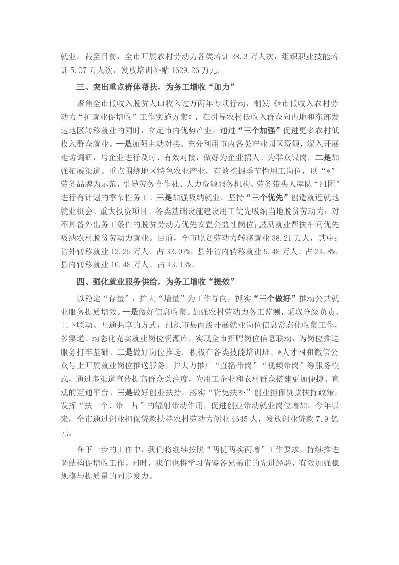按照此次培训计划安排,我围绕农村劳动力转移就业调结构促增收工作作如下简要交流发言。今年以来,*市人社系统牢牢把握“稳存量、调结构、提质量、促增收”的工作主线,以就业促进和技能提升为着力点,不断推动全市农村劳动力转移就业在稳定规模的基础上,进一步实现更充分更高质量就业,切实回应基层群众“盼就业”“富口袋”的实际需要。截至10月底,全市实现农村劳动力转移就业146.89万人,转移率为72.68%,其中省外转移就业29.53万人。农村劳动力转移就业规模实现总体稳定、稳中有进」一、拓展区域就业空间,为务工增收“搭台”持续深化东西部劳务协作机制,广泛开展跨区域协调对接,今年与江苏无锡市、南京国家经济开发区、昆山、如皋等地签订省际劳务协作协议,同*市签订余缺调剂联盟协议,积极动员劳务经纪人、人力资源中介机构和用工企业参与有组织转移就业,收集和发布市外、省外企业招用工信息,引导农村劳动力跨市、跨省务工增加收入。今年以来,全市农村劳动力转移就业“两增”结构变化明显,省外务工、县外省内务工人数均较上一年增加1.4万人和0.76万人。同时,我市制定出台《*市促进南北对口帮扶工作实施方案(2022一2025年)》,明确要求北部县市为产业基础薄弱的南部对口帮扶县每年提供不少于500个的就业岗位,重点引导农村劳动力就近就业促增收,截至10月底,南部地区实现县外市内转移就业10.59万人。目前,珠三角、长三角等经济发达地区成为我市跨省务工的主要流向地。此外,*省及市内北部县市成为了主要外出务工地区,就业选择集中为建筑业、制造业、服务业等行业,呈现出从低收入欠稳定岗位向稳定性强、收入更高岗位转移的趋势。二、改善就业要素质量,为务工增收“蓄能”围绕“培训促就业、强技助增收”,以深入实施“技能*”行动为抓手,持续发挥职业技能培训、创业培训补贴标准目录的指导作用,广泛动员农村劳动力积极参与职业技能培训,进村入户,送技上门,入乡办班,根据农村劳动力就业需求和培训意愿,科学设置培训的项目、理论知识与实践操作时间,提升培训项目的针对性,确保有培训需求人员实现“应培尽培”。同时,充分调动技工院校、民办职业培训机构和用人单位的积极性,积极开展就业技能培训、岗位技能提升培训和创业培训。有效结合本地重点企业用工要求、高原特色农业及农业产业化发展实际,采取订单、定向、定岗培训方式,增强农村劳动力自身发展能力。比如:*结合*县*产业建设规划,针对性培养*方面技能人才500人,实现以技能促