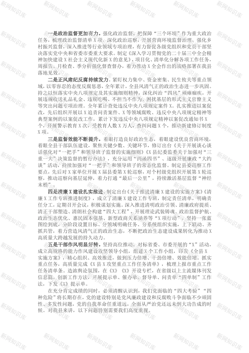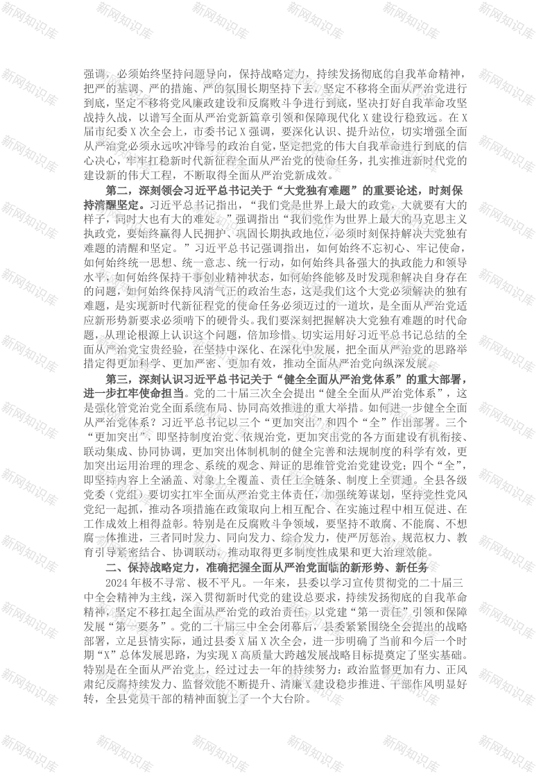 同志们:经县委常委会研究,今天我们召开县纪委全会,主要任务是坚持以习近平新时代中国特色社会主义思想为指导,全面贯彻二十届中央纪委四次全会精神,认真落实省纪委全会和市纪委全会部署,回顾总结2024年纪检监察工作,安排部署2025年主要任务,动员全县上下坚持和加强党的全面领导,持续发扬彻底的自我革命精神,以永远在路上的坚韧和执着,持之以恒推进全面从严治党向纵深发展,坚决打好反腐败斗争攻坚战、持久战、总体战,为圆满实现X“十四五”高质量大跨越发展战略目标提供坚强保障。在稍后的第二阶段会议上,X同志还要代表县纪委常委会作工作报告,这个报告已经县委常委会会议审议,大家要认真学习领会,抓好贯彻落实。下面,我先讲四个方面意见。一、提升政治站位,坚决贯彻中央和省市全面从严治党最新部署党的二十大对坚定不移全面从严治党作出了一系列重要部署,明确提出坚持以严的基调强化正风肃纪,坚决打赢反腐败斗争攻坚战持久战。在二十届中央纪委四次全会上,习近平总书记从实现新时代新征程党的使命任务的战略高度,以高远的历史眼光深刻把握反腐败斗争基本规律,深刻分析当前反腐败斗争形势,旗帜鲜明澄清错误认识、廓清思想迷雾,对坚决打好反腐败斗争攻坚战、持久战、总体战提出明确要求,对以全面从严治党新成效为推进中国式现代化提供坚强保障作出战略部署。特别是鲜明提出,要深入推进风腐同查同治,坚持以“同查”严惩风腐交织问题、以“同治”铲除风腐共性根源等一系列重要论述。习近平总书记的重要讲话,进一步深刻阐明了党的自我革命的内在规律,为我们深入推进全面从严治党、党风廉政建设和反腐败斗争指明了前进方向、提供了重要遵循。在省纪委全体会议上,省委X同志结合我省实际,围绕坚决打好反腐败斗争攻坚战、持久战、总体战作出全面安排部署。在市纪委X届X次全体会议上,市委*同志就落实中央和省纪委全会精神,以更加强有力的举措持续正风肃纪、惩治腐败提出具体要求。我们要深入学习领会、坚决贯彻落实上三级纪委全会战略部署,切实把思想和行动统一到习近平总书记重要讲话精神上来,统一到中央纪委和省纪委、市纪委全会精神上来,持续推动全面从严治党不断取得新成效。第一,深刻把握“全面从严治党十余年磨一剑”的历史性成就,进一步增强政治定力。全面从严治党是新时代党治国理政最为鲜明的特征,也是新时代伟大变革最为突出的一个方面。党的十八大以来,以习近平同志为核心的党中央以强烈的历史使命感和深沉的忧患意识深入推进全面从严治党,打出了一套自我革命“组合拳”,实现了全面从严治党领导体制重塑、战略目标重塑、组织机构重塑、工作力量重塑、责任体系重塑,推动新时代全面从严治党取得了历史性、开创性成就。习近平总书记深刻总结新时代十年全面从严治党取得的成就,强调“走过百年奋斗历程的中国共产党在革命性锻造中更加坚强有力”。经过“十年磨一剑”全面从严治党的锤炼,党找到了自我革命这一跳出治乱兴衰历史周期率的第二个答案。这次二十届中央纪委四次全会充分肯定了2024年党中央一以贯之推进全面从严治党取得的新成效,充分彰显了以党的自我革命引领社会革命的强大政治力量、真理力量和实践力量。我们要充分认识到,经历十多年的浴火淬炼,全面从严治党政治引领和政治保障作用充分发挥,我们党焕发出了新的强大生机活力,最根本的原因在于有以习近平同志为核心的党中央掌舵领航,有习近平新时代中国特色社会主义思想科学指引。我们要更加深刻领悟“两个确立”的决定性意义,增强“四个意识”、坚定“四个自信”、做到“两个维护”,在新的赶考之路上把党的伟大自我革命进行到底。在X届省纪委X次全会上,省委书记X