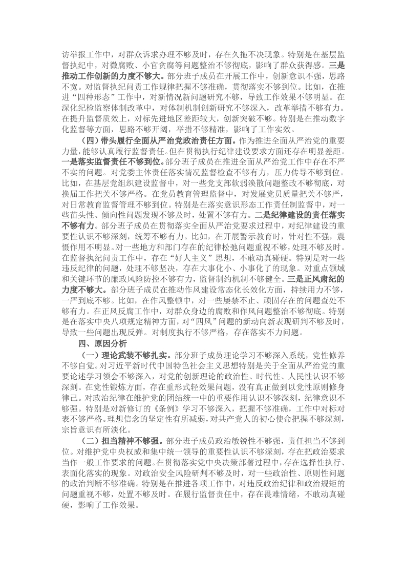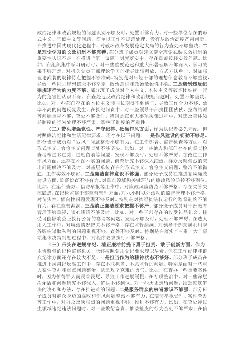 根据上级关于开好2024年度民主生活会的通知要求,结合本次民主生活会主题是“深入学习贯彻习近平新时代中国特色社会主义思想,巩固深化党纪学习教育成果,综合发挥党的纪律教育约束、保障激励作用,为进一步全面深化改革、推进中国式现代化提供坚强纪律保证”的具体要求,现将有关情况报告如下。一、2023年度民主生活会整改落实情况2023年度民主生活会上,班子共查摆出问题18个,制定整改措施32条。经过一年来的努力,整改工作取得明显成效。一是在政治建设方面,查摆出问题5个,提出整改措施9条,已完成整改8条,1条正在持续推进。二是在纪律建设方面,查摆出问题4个,提出整改措施7条,已全部完成整改。三是在作风建设方面,查摆出问题5个,提出整改措施8条,已完成整改7条,1条正在落实。四是在能力建设方面,查摆出问题4个,提出整改措施8条,已完成整改7条,1条需要长期坚持。经过一年来的努力,整改工作取得明显成效。一是理论武装进一步强化。坚持把理论学习作为首要任务,采取中心组学习、专题研讨等形式,深入学习贯彻习近平新时代中国特色社会主义思想,班子成员的政治判断力、政治领悟力、政治执行力得到明显提升。二是工作机制进一步完善。制定出台执纪监督、线索处置、案件查办等7项制度机制,进一步规范工作流程,推动监督执纪工作规范化法治化迈出新步伐。三是工作作风进一步改进。扎实开展“四下基层”“四联四问”活动,深入基层一线开展调查研究,建立了干部直接联系服务群众工作机制,群众满意度明显提升。四是能力水平进一步提高。组织开展业务培训15次,参训干部320人次,监督执纪问责能力得到显著提升,查办案件数量和质量实现“双提升”二、本次民主生活会筹备情况一是加强学习,提高认识。组织班子成员认真学习习近平新时代中国特色社会主义思想,深入学习贯彻党的二十届三中全会精神和二十届中纪委四次全会精神,认真学习新修订的《中国共产党纪律处分条例》等党规党纪,为开好民主生活会打牢思想基础。通过个人自学、集中研讨等多种形式,深化对党的纪律建设重要性和必要性的认识。二是广泛征求意见建议。采取座谈会、个别谈心、设置意见箱、发放征求意见表等多种方式,广泛征求党员干部群众对纪委领导班子和班子成员的意见建议。班子成员之间开展谈心谈话,交换意见,沟通思想。主要负责同志与班子成员逐一谈心谈话,了解实际情况,指出存在问题。三是认真撰写对照检查材料。领导班子对照党章党规找差距,对照初心使命找差距,认真梳理存在问题,深入剖析问题根源,提出整改措施。班子成员按照“三个摆进去”要求,把自己摆进去、把职责摆进去、把工作摆进去,认真撰写个人对照检查材料。四是做好相关准备工作。及时向上级党委和纪委请示报告,通报民主生活会准备情况。制定会议方案,明确会议程序和要求。做好会议记录、整改方案等相关材料准备工作。三、存在的主要问题(一)带头严守政治纪律和政治规矩方面。作为纪检监察机关,能够把维护党中央权威和集中统一领导作为根本政治任务,但对照党中央要求和新修订的《条例》规定,在严守政治纪律和政治规矩方面还存在明显不足。一是对政治监督的要求把握不够精准。部分班子成员对政治监督的内涵理解不够深入,工作标准不够高。特别是在贯彻落实党中央重大决策部署情况的监督检查中,存在重具体业务轻政治要求的问题。比如,在监督检查改革发展稳定各项工作时,对违反