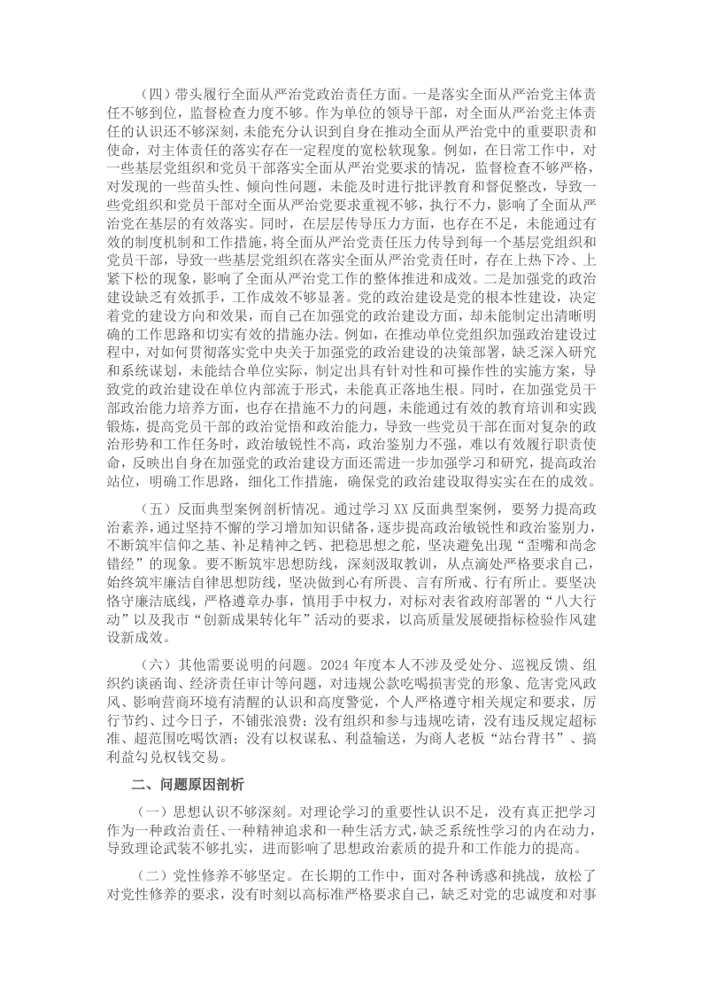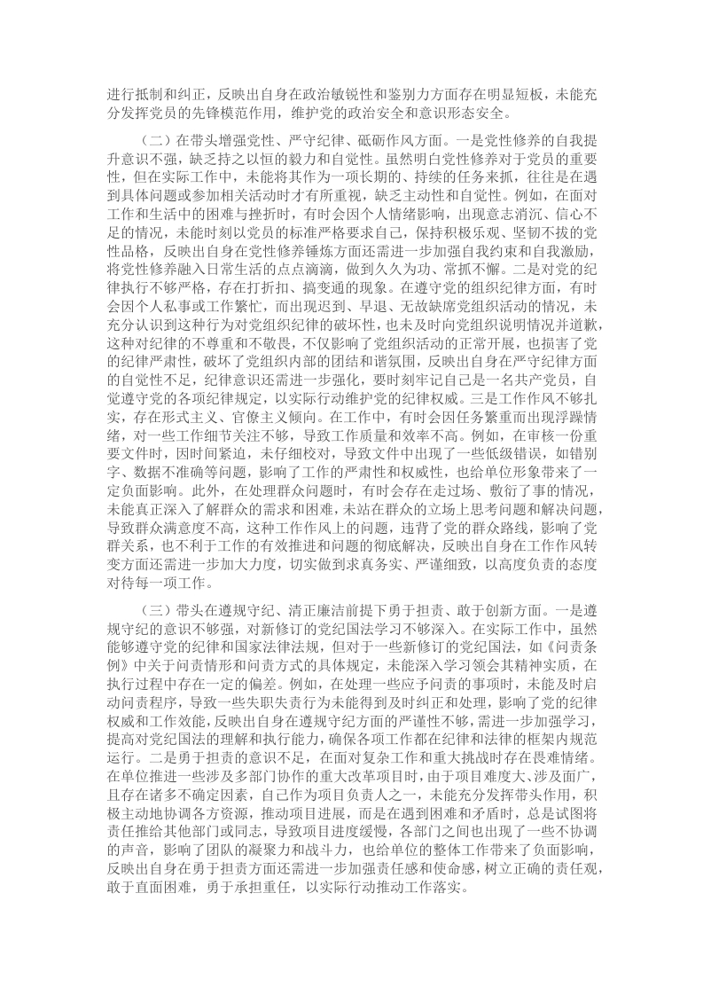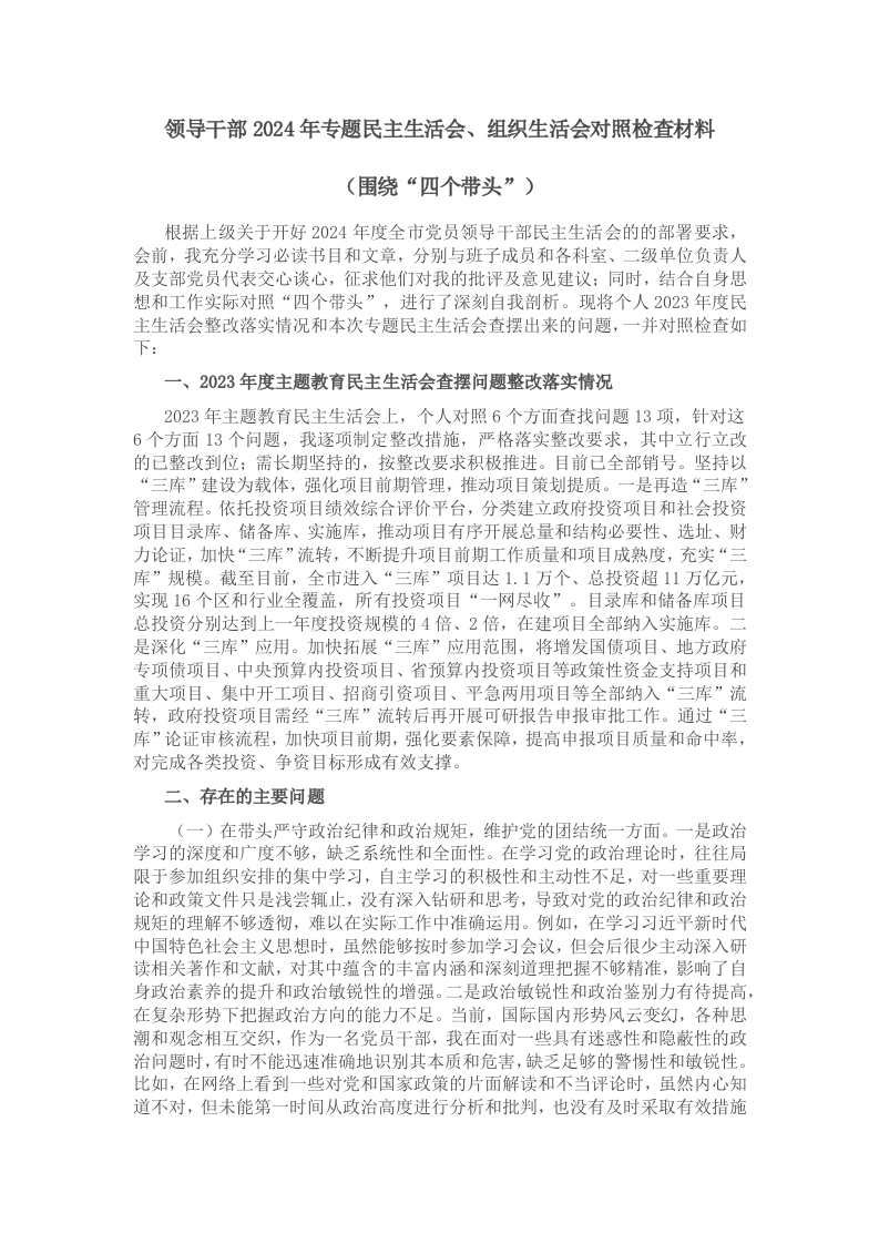 领导干部2024年专题民主生活会、组织生活会对照检查材料(围绕“四个带头”)根据上级关于开好2024年度全市党员领导干部民主生活会的的部署要求,会前,我充分学习必读书目和文章,分别与班子成员和各科室、二级单位负责人及支部党员代表交心谈心,征求他们对我的批评及意见建议:同时,结合自身思想和工作实际对照“四个带头”,进行了深刻自我剖析。现将个人2023年度民主生活会整改落实情况和本次专题民主生活会查摆出来的问题,一并对照检查如下:一、2023年度主题教育民主生活会查摆问题整改落实情况2023年主题教育民主生活会上,个人对照6个方面查找问题13项,针对这6个方面13个问题,我逐项制定整改措施,严格落实整改要求,其中立行立改的已整改到位:需长期坚持的,按整改要求积极推进。目前已全部销号。坚持以“三库”建设为载体,强化项目前期管理,推动项目策划提质。一是再造“三库”管理流程。依托投资项目绩效综合评价平台,分类建立政府投资项目和社会投资项目目录库、储备库、实施库,推动项目有序开展总量和结构必要性、选址、财力论证,加快“三库”流转,不断提升项目前期工作质量和项目成熟度,充实“三库”规模。截至目前,全市进入“三库”项目达1.1万个、总投资超11万亿元,实现16个区和行业全覆盖,所有投资项目“一网尽收”。目录库和储备库项目总投资分别达到上一年度投资规模的4倍、2倍,在建项目全部纳入实施库。二是深化“三库”应用。加快拓展“三库”应用范围,将增发国债项目、地方政府专项债项目、中央预算内投资项目、省预算内投资项目等政策性资金支持项目和重大项目、集中开工项目、招商引资项目、平急两用项目等全部纳入“三库”流转,政府投资项目需经“三库”流转后再开展可研报告申报审批工作。通过“三库”论证审核流程,加快项目前期,强化要素保障,提高申报项目质量和命中率,对完成各类投资、争资目标形成有效支撑。二、存在的主要问题(一)在带头严守政治纪律和政治规矩,维护党的团结统一方面。一是政治学习的深度和广度不够,缺乏系统性和全面性。在学习党的政治理论时,往往局限于参加组织安排的集中学习,自主学习的积极性和主动性不足,对一些重要理论和政策文件只是浅尝辄止,没有深入钻研和思考,导致对党的政治纪律和政治规矩的理解不够透彻,难以在实际工作中准确运用。例如,在学习习近平新时代中国特色社会主义思想时,虽然能够按时参加学习会议,但会后很少主动深入研读相关著作和文献,对其中蕴含的丰富内涵和深刻道理把握不够精准,影响了自身政治素养的提升和政治敏锐性的增强。二是政治敏锐性和政治鉴别力有待提高,在复杂形势下把握政治方向的能力不足。当前,国际国内形势风云变幻,各种思潮和观念相互交织,作为一名党员干部,我在面对一些具有迷惑性和隐蔽性的政治问题时,有时不能迅速准确地识别其本质和危害,缺乏足够的警惕性和敏锐性。比如,在网络上看到一些对党和国家政策的片面解读和不当评论时,虽然内心知道不对,但未能第一时间从政治高度进行分析和批判,也没有及时采取有效措施