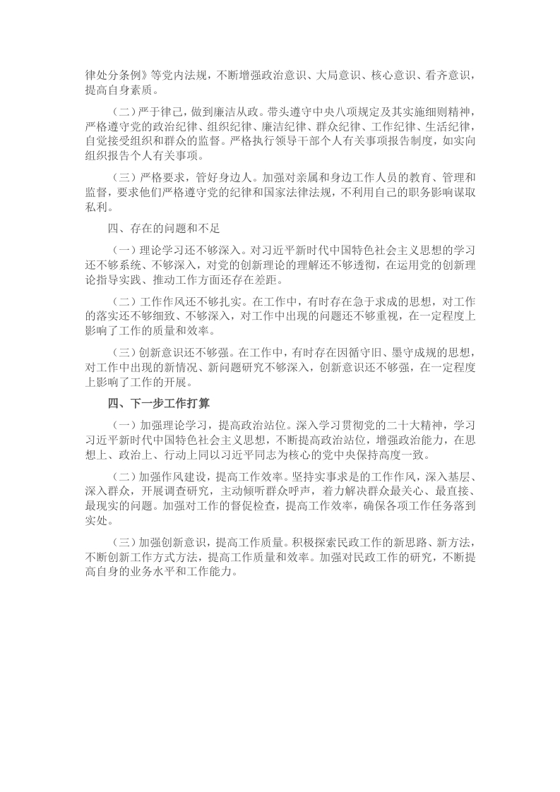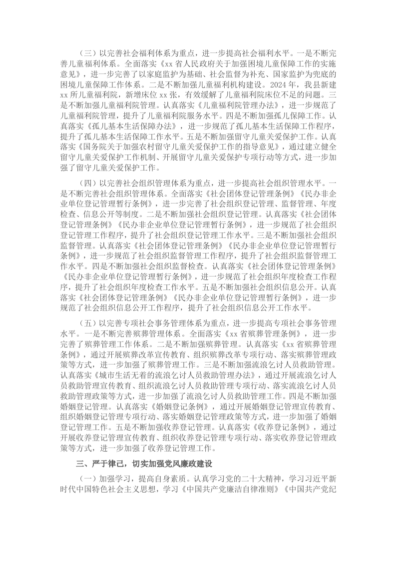 2024年,我在县委、县政府的正确领导下,在班子成员的支持配合下,在全局干部职工的共同努力下,紧紧围绕县委、县政府中心工作,以“五化”民政建设为抓手,认真履行“民政为民、民政爱民”工作宗旨,创新民政工作思路,强化工作措施,较好地完成了全年各项工作任务,现将有关情况汇报如下:一、注重学习,不断提高自身素养始终坚持把学习作为提高自身素质的有力武器,树立终身学习的理念,坚持学以致用、学用结合,不断增强学习的实效性。一是强化政治理论学习。认真学习了习近平新时代中国特色社会主义思想和党的二十大精神,切实增强了政治意识、大局意识、核心意识、看齐意识,在思想上、政治上、行动上始终同以习近平同志为核心的党中央保持高度一致。二是加强业务知识学习。认真学习了民政业务、民政法律法规、社会保障、社会救助等相关知识,坚持理论联系实际,做到了学有所思、学有所悟、学有所用。三是坚持学习与实践相结合。积极参与党纪习教育,通过学习、交流、调研、检查、督查等方式,对民政工作的新形势、新任务、新问题有了更深层次的思考,为做好新形势下民政工作奠定了坚实基础。二、履职尽责,全面推进民政事业发展(一)以完普社会救助体系为重点,进一步提高困难群众生活保障水平。一是不断完普社会救助体系。全面落实《xx省社会救助条例》,按照“应保尽保按标施保、分类施保、动态管理”的要求,进一步规范城乡低保审核审批程序,实现了低保工作的公开、公平、公正。二是不断提高城乡低保标准。2024年,我县城市低保标准提高到xx元/月,农村低保标准提高到xx元/月,分别较2023年提高了Xx%和xx%。三是全面落实临时救助制度。建立了临时救助备用金制度,进一步完善了临时救助申请审批程序,有效解决了困难群众突发性、临时性、紧迫性的基本生活因难。四是不断加强特困人员供养工作。2024年,我县特困人员供养标准提高到xx元/月,较2023年提高了xx%。五是全面落实残疾人两项补贴制度。2024年,我县困难残疾人生活补贴标准提高到xx元/月,重度残疾人护理补贴标准提高到xx元/月,分别较2023年提高了xx%和xx%。六是全面开展社会救助专项治理。认真落实省、市社会教助专项治理工作要求,通过自查自纠、专项检查、联合督查等方式,进一步规范了社会救助工作程序,提升了社会救助工作水平。(二)以完善养老服务体系为重点,进一步提升养老服务水平。一是不断完善养老服务体系。全面落实《xx省人民政府关于加快发展养老服务业的实施意见》,进一步完善了以居家为基础、社区为依托、机构为补充的多层次养老服务体系。二是不断加强养老机构建设。2024年,我县新建Xx所农村敬老院,新增床位xx张,有效缓解了农村敬老院床位不足的问题。三是不断加强养老机构管理。认真落实《养老机构管理办法》,进一步规范了养老机构管理,提升了养老机构服务水平。四是不断加强居家和社区养老服务。2024年,我县新建xx所社区老年人日间照料中心,新增床位xx张,有效缓解了居家和社区养老服务不足的问题。五是不断加强养老服务人才队伍建设。认真落实《养老服务人才培养提升行动计划》,通过举办培训班、组织外出考察学习等方式,进一步加强了养老服务人才队伍建设。