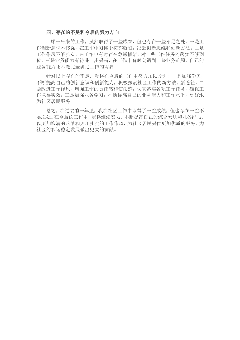 时光荏苒,岁月如梭,转眼间2024年即将过去。在过去的这一年里,作为名社区工作者,我在上级领导的正确带领下,在同事们的共同努力和支持下,以服务居民为宗旨,紧紧围绕社区的中心工作,积极履行自己的职责,努力为社区居民创造一个和谐、稳定、舒适的生活环境。现将一年来的工作情况总结如下:一、加强学习,提高自身素质作为一名社区工作者,我始终把学习作为提高自身素质的重要途径。在这一年里,我积极参加各种培训和学习活动,认真学习党的路线、方针、政策,学习习近平新时代中国特色社会主义思想,不断提高自己的政治理论水平。同时,我还学习了社区工作的相关法律法规和业务知识,不断提高自己的业务能力和工作水平。通过学习,我不仅丰富了自己的知识储备,还增强了自己的责任感和使命感,为更好地开展社区工作奠定了坚实的基础。二、扎实工作,履行岗位职责1.社区党建工作积极协助社区党支部做好党建工作,认真落实“三会一课”制度,组织党员开展学习教育活动,提高党员的思想政治素质。加强党员队伍建设,做好党员发展工作,严格按照党员发展程序,把好党员入口关。积极开展党员志愿服务活动,组织党员参与社区环境整治、扶贫帮困等活动,发挥党员的先锋模范作用。2.社区服务工作以服务居民为宗旨,积极开展社区服务工作。一是做好社区低保、特困人员等困难群体的救助工作,严格按照政策规定,认真审核申请材料,确保救助资金发放到真正需要的人手中。二是做好社区老年人等特殊群体的服务工作,定期走访慰问,了解他们的生活需求,为他们提供力所能及的帮助。三是做好社区就业创业服务工作,积极宣传就业创业政策,组织开展就业创业培训,为社区居民提供就业信息和创业指导。四是做好社区文化体育服务工作,组织开展丰富多彩的文化体育活动,丰富居民的业余生活,提高居民的文化素质。3.社区管理工作积极参与社区管理工作,维护社区的和谐稳定。一是做好社区环境卫生管理工作,组织社区居民开展环境卫生整治活动,清理垃圾杂物,改善社区环境。二是做好社区治安管理工作,加强社区巡逻,排查安全隐患,及时化解矛盾纠纷,维护社区的治安稳定。三是做好社区物业管理工作,协调物业公司做好小区的物业管理服务工作,提高小区的物业服务水平。四是做好社区安全生产管理工作,加强对社区企业、商户的安全生产检查,督促他们落实安全生产责任,确保社区的安全生产形势稳定。三、廉洁自律,树立良好形象作为一名社区工作者,我始终严格要求自己,遵守廉洁自律的各项规定,自觉抵制各种不正之风。在工作中,我坚持公平、公正、公开的原则,严格按照政策规定办事,不徇私情,不谋私利。在生活中,我注重自身修养,保持良好的生活作风,做到廉洁奉公,诚实守信。通过自己的努力,树立了良好的社区工作者形象。