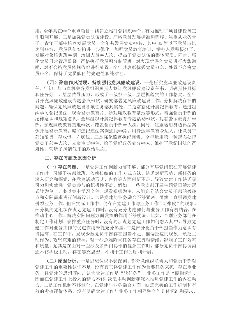 2024年,在市委的坚强领导下,我作为市直机关党组书记,始终坚持以习近平新时代中国特色社会主义思想为指导,认真履行抓基层党建工作第一责任人职责,扎实推进市直机关党建各项工作,努力提升机关党建工作质量,为市直机关各项事业发展提供了坚强有力的政治保障和组织保障。现将本人2024年抓基层党建工作情况述职如下:一、工作开展情况(一)聚焦政治过硬,持续加强政治机关建设。一是强化政治引领。全年组织开展各类政治学习活动*次,覆盖党员干部*人次,通过专题讲座、集中研讨等形式,深入学习贯彻习近平总书记重要讲话和重要指示批示精神,确保党中央决策部署在市直机关落地生根。二是严肃党内政治生活。全年市直机关各党支部累计召开“三会一课”*次,开展主题党日活动*次,高标准召开民主生活会和组织生活会**次,党内政治生活的政治性、时代性、原则性、战斗性不断增强。同时,加强对党内政治生活的监督检查,对发现的*个问题及时督促整改到位,确保党内政治生活严肃认真、规范有序。三是打造模范政治机关。积极开展模范机关创建活动,制定出台了《市直机关创建模范机关实施方案》,明确创建目标、任务和标准,引导市直机关各单位立足本职岗位,在服务中心工作、履行职责使命中争先进位。截至2024年底,共有*个市直机关单位被评为市级模范机关,通过示范引领,带动更多机关单位在政治建设等方面不断提升水平,营造了比学赶超的良好氛围。(二)聚焦思想过硬,持续强化政治理论武装。一是抓好理论学习中心组学习。围绕党的创新理论、重大方针政策等内容,组织开展集中学习共*次,邀请专家学者作专题辅导报告*次,中心组成员结合工作实际开展交流研讨*次,切实提高了领导班子的政治理论水平和决策能力。同时,加强对市直机关各单位理论学习中心组学习的督促指导,定期检查学习记录、学习心得等资料,确保学习取得实效。二是推动党员干部常态化学习。搭建多样化学习平台,通过线上线下相结合的方式,组织市直机关党员干部深入学习党的理论知识。线上利用学习强国、干部在线教育等平台,督促党员干部积极参与学习,机关党员干部学习强国日均积分达到**分以上,参与干部在线教育课程学习的达标率为**%。线下组织开展各类专题培训、读书分享会等活动,全年举办党员干部专题培训班*期,培训党员干部**人次,举办读书分享会**场,参与党员干部*人次,党员干部的理论素养得到有效提升。三是加强思想政治工作。全年累计开展谈心谈话*人次,收集意见建议*条,解决党员干部实际问题*个,增强了党员干部的归属感和凝聚力,营造了积极向上、团结和谐的工作氛围。(三)聚焦组织过硬,持续夯实基层战斗堡垒。一是加强基层党组织建设。全年新创建标准化规范化党支部**个,累计达标党支部占比达到*%,基层党组织的凝聚力和战斗力不断增强。同时,加强对软弱涣散党组织的整顿,对排查出的*个软弱涣散党支部,采取“一对一”帮扶、选派党建指导员等方式,帮助其找准问题、制定措施、限期整改,全部实现转化提升。二是优化党组织设置。结合市直机关机构改革和职能调整实际情况,及时优化党组织设置,确保党的组织和工作全覆盖。2024年,新成立党支部**个,撤销党支部**个,调整党支部隶属关系*个,进一步理顺了党组织管理体制,提高了党建工作效率。此外,注重在重点项目、工作一线建立临时党组织,发挥党组织在攻坚克难中的战斗堡垒作