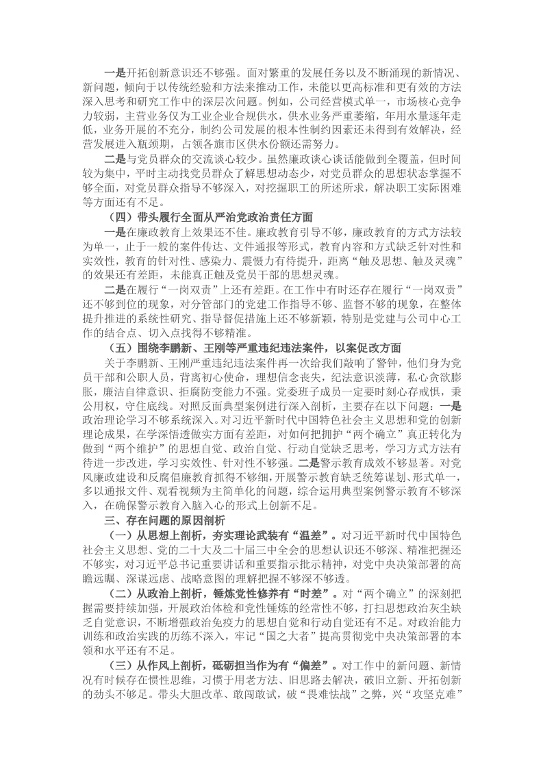 按照上级党委(X集团公司党委和市国资委)关于开好2024年度民主生活会的有关部署要求,党委班子紧紧围绕本次民主生活会主题,按照方案具体步骤,认真组织专题学习研讨,紧密联系工作实际,广泛征求意见、开展谈心谈话,重点围绕4个带头方面及李鹏新、王刚等严重违纪违法案件,以案促改方面认真查摆问题,深刻剖析问题产生的根源,明确了今后的努力方向和整改措施。现将对照检查情况报告如下。一、学习贯彻习近平新时代中国特色社会主义思想主题教育以来有关民主生活会整改落实情况学习贯彻习近平新时代中国特色社会主义思想主题教育民主生活会召开以来,党委班子紧紧围绕“理论学习、政治素质、能力本领、担当作为、工作作风廉洁自律、以学铸魂、以学增智、以学正风、以学促干,自治区两件大事、典型案例”等八个方面,共计查摆出10项问题,制定整改措施10条。党委班子高度重视整改工作,坚持把抓好问题整改作为检验民主生活会成效的重要标准,党委领导班子及成员坚持以上率下,把自己摆进去、把责任担起来,主动认领整改任务,带头落实整改措施,以更扎实的工作态度推动公司各项工作的开展,不断取得新的、更大的成绩。截至目前,党委班子查摆出的10项问题均已整改完成。二、存在问题(一)带头严守政治纪律和政治规矩、维护党的团结统一方面。一是在政治素养的锤炼上还需绵绵用力。在深刻认识和准确把握“两个确立”重大意义、实践要求时,往往注重将其体现在自身的言行之中,在如何把握好“两个确立”思想理论的抽象性和实际行动的实践性,缺少全面深入的思考,进一步统一思想、统一意志、统一行动,争做表率方面还有一定的差距。二是在政治品格的塑造上还需久久为功。在学思践悟中经受思想淬炼、精神洗礼不够,涵养忠诚干净担当的政治品格仍需强化,主题教育、党纪学习教育成果还未完全转化为政治品格、价值追求、精神境界、作风操守。例如,对于如何将党的创新理论融入贯彻本职工作之中,贯穿于深化改革、加快发展的全过程,方法还不够多、措施还不够实,还不能灵活地将方法论转化为破解疑难、化解问题的思路办法。(二)带头增强党性、严守纪律、砥砺作风方面一是党性修养有所松懈。随着工作经验的积累变化,部分班子成员在思想上对党性修养的重视程度有所下降,没有时刻以高标准严格要求自己,在面对工作中的困难和挑战时,有时会出现畏难情绪,缺乏攻坚克难的勇气和决心,对加强党性锻炼的重要性认识不够深刻,没有做到经常开展党性锻炼,没有做到将党性锻炼贯穿于工作的全过程。例如,学习领会习近平总书记关于党性的重要论述不够经常,学习领会这一思想对坚定理想信念、提升思想境界、加强党性锻炼方面的各项要求不够深刻,对新时代坚强党性的主旨要义、根本原则、实践要求缺乏掌握,导致公司两名同志出现了违纪现象。二是抓理论学习的深度不够到位。在开展党纪学习教育时,常停留于文件精神传达、阅读法规条文、听取报告等方法,缺乏互动和讨论,导致学习过程枯燥乏味,未能深入挖掘其内涵和本质。例如,因日常工作繁忙,没有足够时间和精力深入学习和思考党纪法规内容,缺乏从党纪法规中汲取营养的自觉,无法形成理论与实践的良好互动,在学思践悟上下功夫还不足。(三)带头在遵规守纪、清正廉洁前提下勇于担责、敢于创新方面