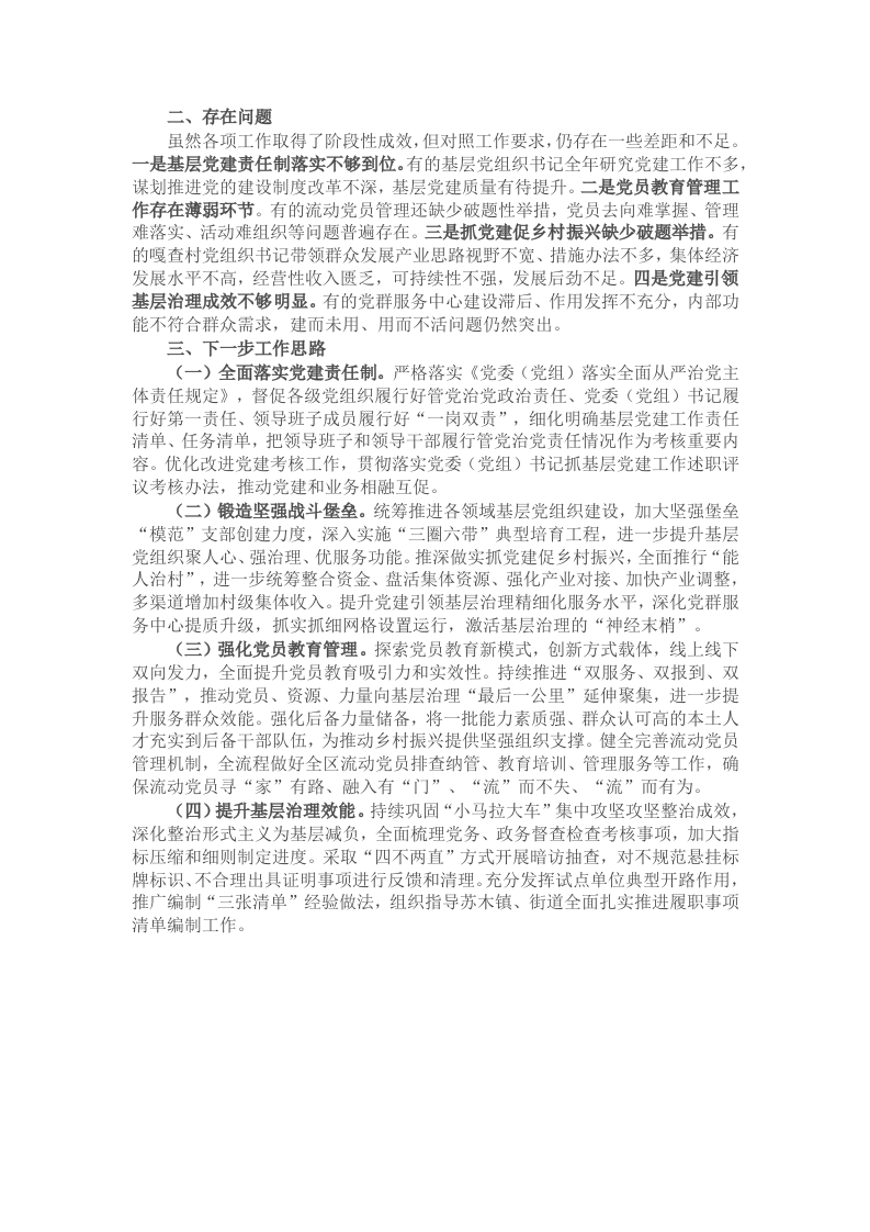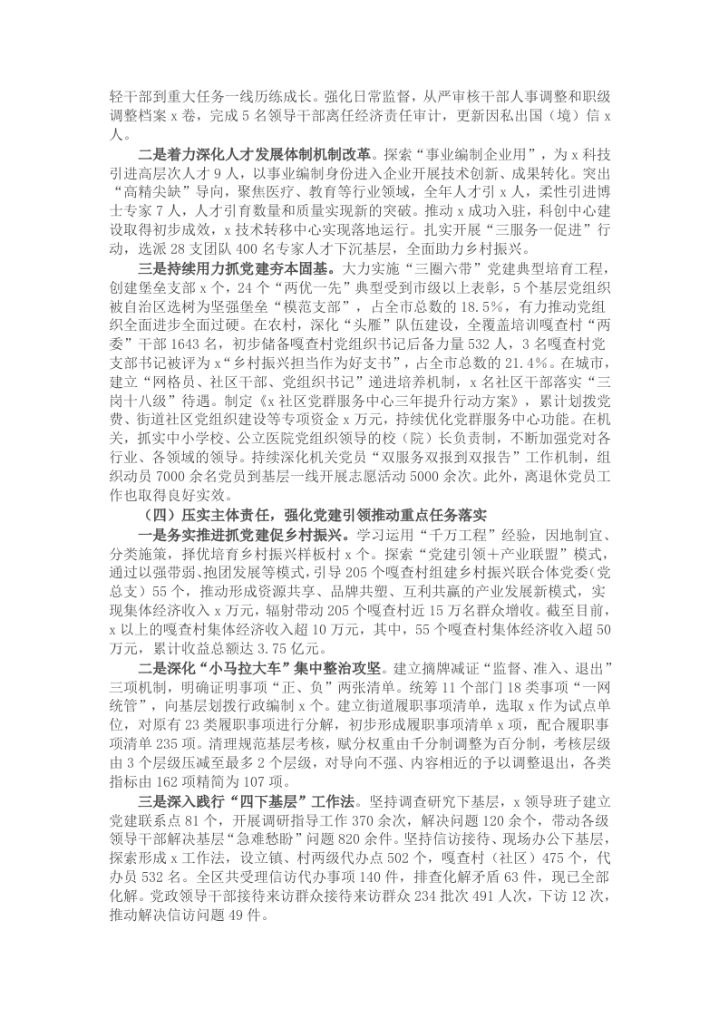 一、工作开展情况(一)把牢政治方向,以政治建设统领新时代党的各项建设一是坚决维护党的核心和党中央权威。坚定坚决维护以习近平同志为核心的党中央权威和集中统一领导,聚焦聚力落实习近平总书记对内蒙古重要讲话重要指示批示精神,对标对表统一思想认识、澄清模糊认识、纠正错误认识,坚决捍卫“两个确立”、坚决做到“两个维护”。召开区委十四次全会,全面落实上级党委部署要求,明确发展思路,确保各项事业始终沿着习近平总书记指引的方向向前推进。二是持续推动政治巡察督导见行见效。重点围绕“两件大事”、铸牢中华民族共同体意识、整治形式主义为基层减负等方面内容,开展督查检查9次。有序开展x届区委第x轮巡察,重点围绕“四个聚焦”,对18家部门单位党组织开展常规巡察,统筹推进对x个嘎查村、社区直接巡察x个嘎查村、社区镇村一体巡察,累计发现问题720个,督促立行立改问题5个,推动政治监督向基层延伸,向纵深发展。三是切实抓好巡视反馈意见整改落实。针对自治区巡视“回头看”反馈的X个方面x项重点问题,召开专题会议进行会商研判,研究制定整改措施x条,集中整改期内确定的整改任务可全部完成销号。2023年度市委党建述职会议点评的“落实全面从严治党主体责任、村干部队伍建设、基层治理”3方面问题,制定10项具体措施,目前已全部整改完成,政治生态持续修复净化,干部干事创业热情不断激发。(二)深化思想引领,推动党的创新理论学深悟透入脑入心一是巩固拓展主题教育成果。全面落实“四个以学”重要要求,召开区委常委会议28次,理论中心组集体学习15次,以上率下、示范带动党的理论武装及时跟进。深入实施习近平新时代中国特色社会主义思想教育培训计划,分层次分领域开展各类培训57期1.3万余人次。依托“三会一课”、主题党日等形式,各级党组织开展普通党员培训1500余场次,6万余人次。依托“空中课堂”“学习强国”等载体,发布党的最新理论成果及相关阐释文章51期。二是推深做实群众教育工作。印发《关于常态化开展感党恩听党话跟党走群众教育工作方案》,构建区委牵头、苏木镇街主导、嘎查村社区全面覆盖的“立体化”宣传学习架构,组建140余支专业宣讲队,通过“话十年发展变化”展演活动、设立“时代光影”展板等形式,开展各类宣讲6100余场次,有形有感有效讲清“六句话”的事实和道理。开展“书记讲给书记听”宣讲活动4000余场次,教育引导各族群众坚定不移感党恩、听党话、跟党走。三是扎实推进党纪学习教育。紧扣“六项重点”,建立示范带动、集中研讨、下沉旁听、课堂实训、个人自学“五学贯通”长效机制,抓实日常教育、警示教育和宣传教育,区委组织开展理论中心组学习3次,举办读书班79期,示范带动各级党组织开展专题讲座78场,研讨156次,集中学习4600余次,各级党组织书记讲纪律党课1200次。召开全区警示教育会1次,深刻剖析违纪典型案例,推动广大党员干部受警醒、明底线、知敬畏。(三)提升组织效能,推动基层组织建设融入中心服务大局一是全方位加强干部选育管用。树牢鲜明导向,组织开展干部提拔重用x批次x人、公务员职级调整x批次x人,其中,x名一线表现突出干部得到提拔重用,x名“担当作为好干部”得到提拔晋级。强化年轻干部选育,选拔x名优秀年轻干部入库培养,提拔重用x岁左右优秀年轻干部16名,选派x名优秀年