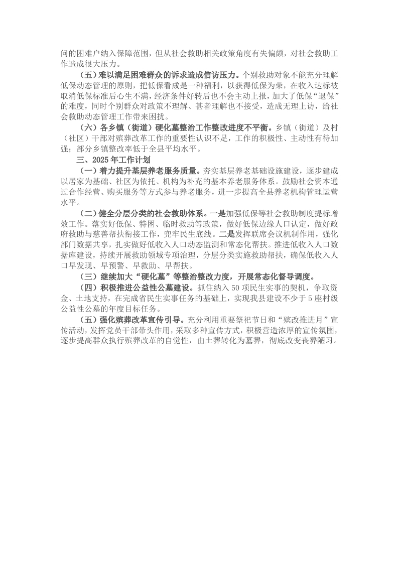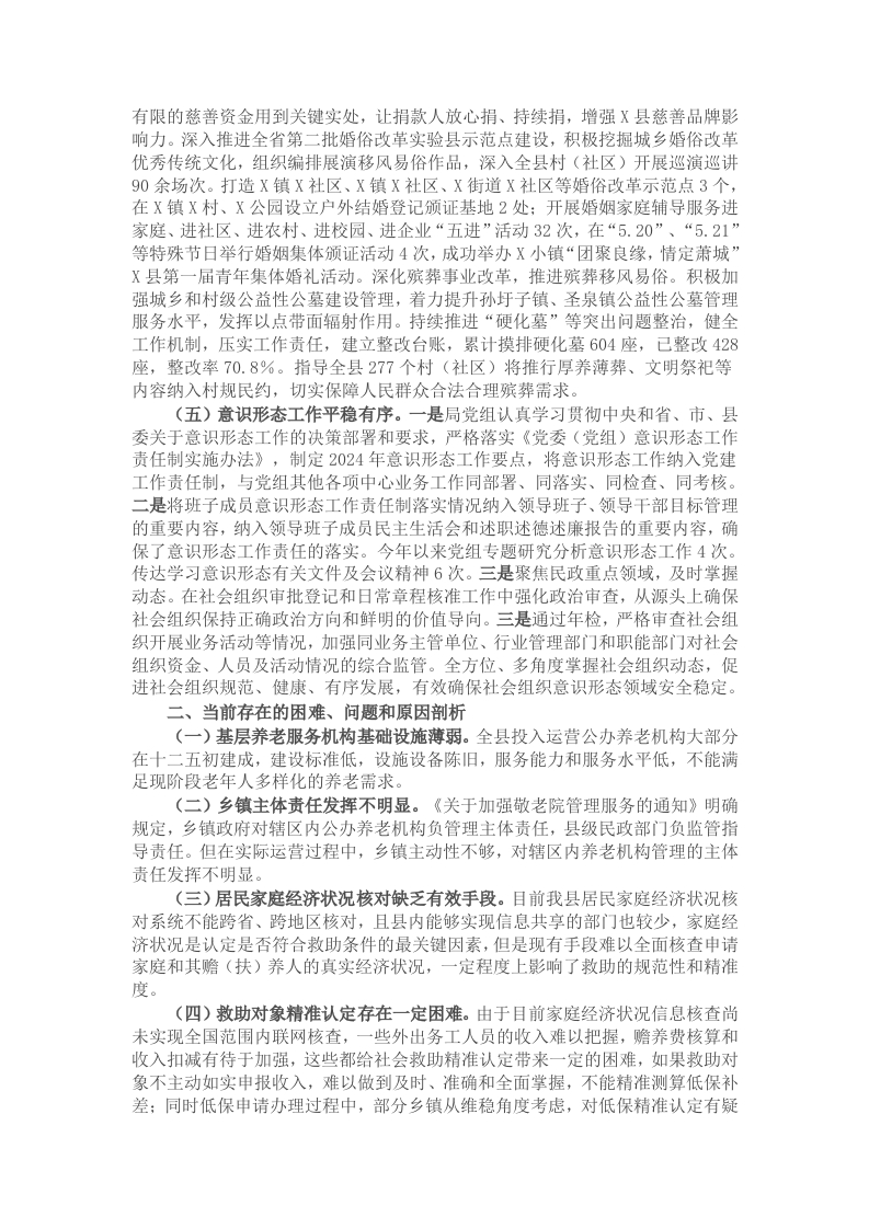 按照要求,现将X县民政局2024年全面工作情况报告如下。一、贯彻落实情况(一)履职尽责能力不断增强。民政局党组坚持以习近平新时代中国特色社会主义思想为指导,深入学习贯彻落实党的二十大精神,在县委、县政府的坚强领导下,扎实开展党纪学习教育、殡葬领域专项整治和15件群众身边具体实事,严格履行党风廉政建设主体责任,狠抓全面从严治党“两个责任”落实,常态化开展廉政谈话、提醒谈话,持之以恒正风肃纪,营造风清气正政治生态,推动全面从严治党向纵深发展。通过局党组理论学习中心组学习、“三会一课”、主题党日、专题党课等学习活动,强化学习贯彻习近平新时代中国特色社会主义思想、习近平总书记关于民政工作的重要论述、党的二十大和二十届三中全会精神,把学习融入日常、抓在经常,读原著、学原文、悟原理,在学习交流中深化认识、凝聚共识。今年以来我局党组成员到社会组织开展党的二十届三中全会宣讲2次,开展党组理论中心组学习12次、专题调研4次、党员干部带头讲党课4次、主题党日活动3场次、学习例会24次、理论知识测试4场次。(二)兜底保障工作扎实有力。全面贯彻落实习近平总书记关于扎实做好民生保障工作、着力保障困难群众基本生活的重要指示,扎实履行基本民生保障、基本社会服务等职责,进一步完善低保等社会救助制度,加强低收入人口动态监测,与教育、人社、住建、乡村振兴、残联等部门建立共享机制,将符合条件的脱贫人口纳入低保、特困供养等兜底保障范围,在实现稳定脱贫的基础上进一步巩固拓展脱贫攻坚兜底保障成果,有力保障城乡低保对象和特困人员基本生活,做到应保尽保、应救尽救,把基本民生兜底保障网织得更密、兜得更牢。目前,全县共救助城乡低保对象X人,累计发放低保金X亿元。保障特困人员X人。累计发放供养金X万元。不断健全完善分层分类的社会救助体系,将专项救助延伸至低保边缘家庭、刚性支出困难家庭等困难群众。印发《X县低收入人口认定及救助实施办法(暂行)》、《关于进一步加强低收入人口教育救助的工作举措》等相关文件,严格规范救助程序,实现救助工作公平、公正、公开。完善临时救助制度,落实“分级审批”“先行救助”等政策规定,逐步建成分层分类、精准高效的社会救助体系。实施临时救助X人次,累计发放资金X万元。(三)养老服务水平不断提升。积极应对人口老龄化国家战略,持续提升基本养老服务保障能力。健全完善县乡村三级养老服务网络,全县建成县级养老服务指导中心1个,乡镇养老院39个,社区日间照料中心和村级养老服务站267个,实现县域养老机构全覆盖。积极推进居家社区嵌入式养老,打造X镇后梅社区养老服务中心。落实经济困难高龄、失能等老年人补贴制度,保障高龄X人,累计发放高龄津贴X万元。保障失能失智老人X人,累计发放资金X万元。广泛开展老年助餐服务,倾力绘就安老、乐老、享老的幸福图景(四)社会事务工作稳步推进。全面落实残疾人福利保障政策,建立补贴标准动态调整机制。目前,两项残疾人补贴标准为86元/月,全县保障困难残疾人X人,累计发放资金X万元。保障重度残疾人X人,累计发放资金X万元。推动孤儿、事实无人抚养儿童精准保障工作走深走实,共有X名孤儿和X名事实无人抚养儿童纳入基本生活保障范围,累计发放资金X万元。加强困境儿童保障工作队伍建设,配备X名乡镇(街道)儿童督导员和X名村(社区)儿童主任,基本实现了全覆盖。鼓励支持壮大慈善力量,引导慈善力量积极参与扶弱济困、扶老救孤、恤病助残。组织开展2024年“慈善一日捐”活动,筹集善款X元,将善款用于“一老一小”及困难群体救助关爱和乡村振兴等慈善公益事业,坚持将