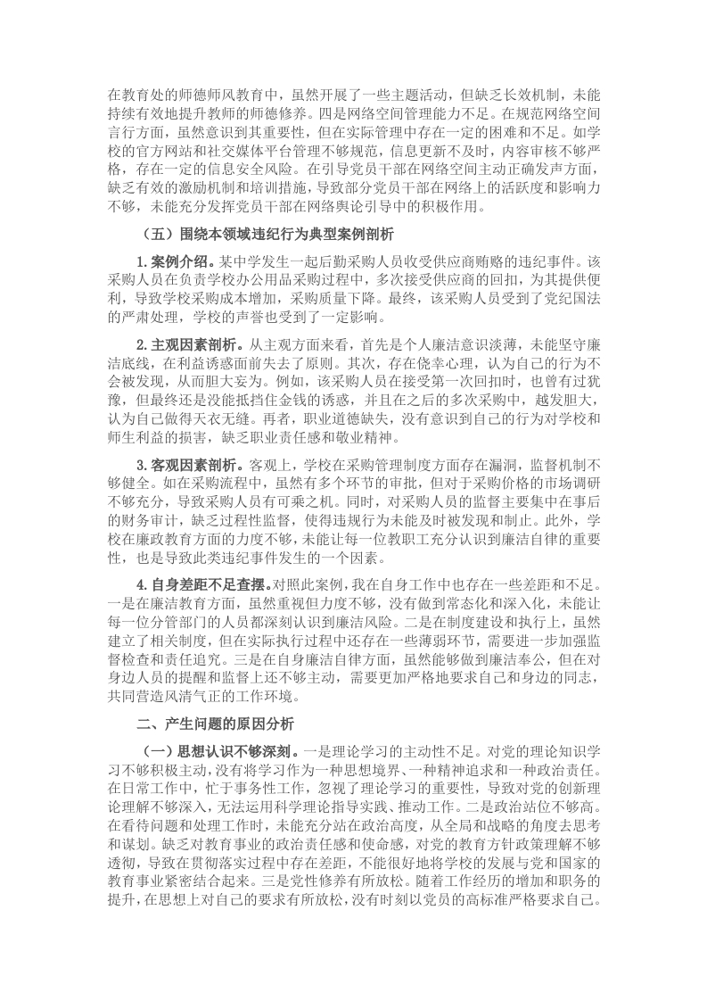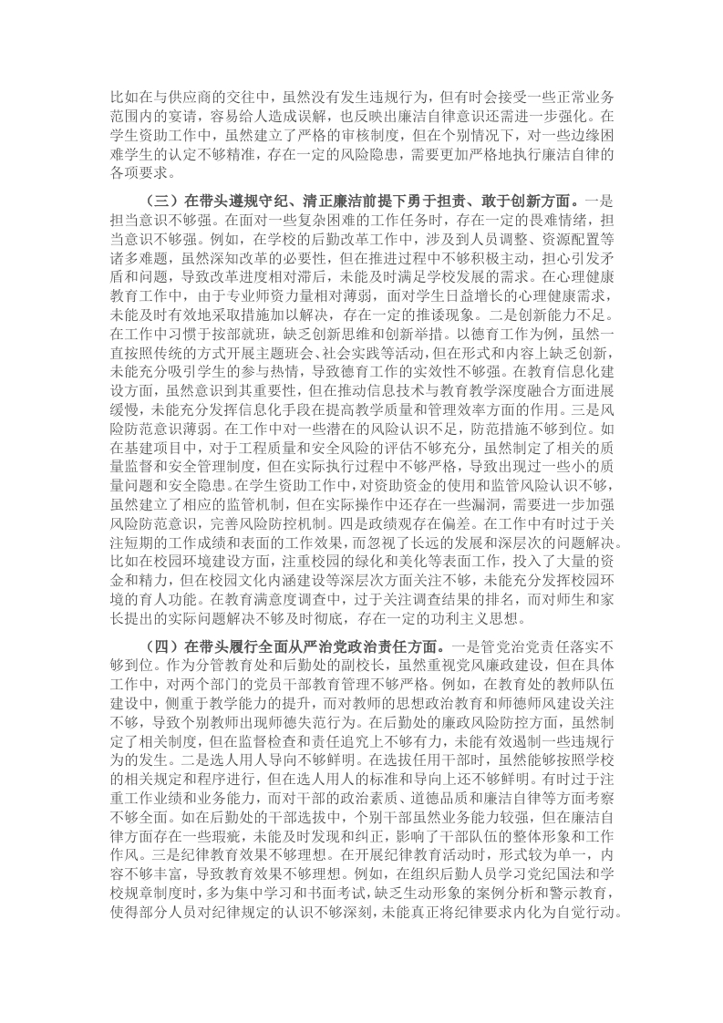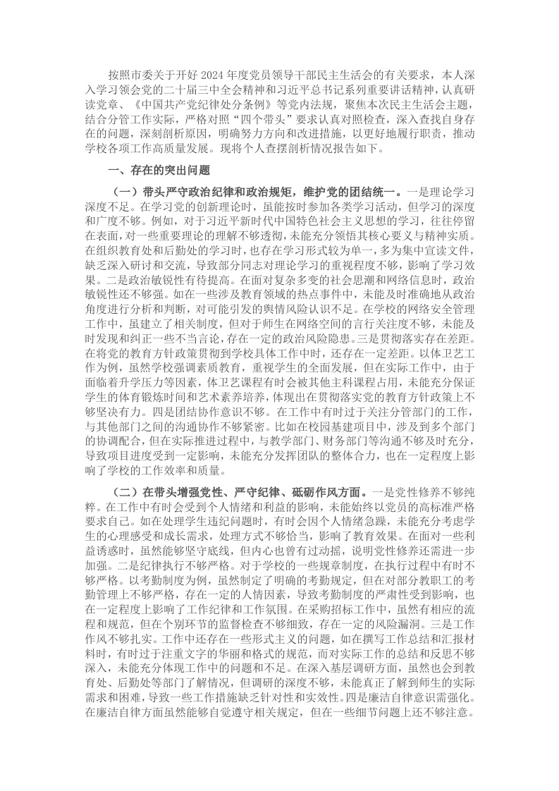 按照市委关于开好2024年度党员领导干部民主生活会的有关要求,本人深入学习领会党的二十届三中全会精神和习近平总书记系列重要讲话精神,认真研读党章、《中国共产党纪律处分条例》等党内法规,聚焦本次民主生活会主题,结合分管工作实际,严格对照“四个带头”要求认真对照检查,深入查找自身存在的问题,深刻剖析原因,明确努力方向和改进措施,以更好地履行职责,推动学校各项工作高质量发展。现将个人查摆剖析情况报告如下。一、存在的突出问题(一)带头严守政治纪律和政治规矩,维护党的团结统一。一是理论学习深度不足。在学习党的创新理论时,虽能按时参加各类学习活动,但学习的深度和广度不够。例如,对于习近平新时代中国特色社会主义思想的学习,往往停留在表面,对一些重要理论的理解不够透彻,未能充分领悟其核心要义与精神实质。在组织教育处和后勤处的学习时,也存在学习形式较为单一,多为集中宣读文件,缺乏深入研讨和交流,导致部分同志对理论学习的重视程度不够,影响了学习效果。二是政治敏锐性有待提高。在面对复杂多变的社会思潮和网络信息时,政治敏锐性还不够强。如在一些涉及教育领域的热点事件中,未能及时准确地从政治角度进行分析和判断,对可能引发的舆情风险认识不足。在学校的网络安全管理工作中,虽建立了相关制度,但对于师生在网络空间的言行关注度不够,未能及时发现和纠正一些不当言论,存在一定的政治风险隐患。三是贯彻落实存在差距。在将党的教育方针政策贯彻到学校具体工作中时,还存在一定差距。以体卫艺工作为例,虽然学校强调素质教育,重视学生的全面发展,但在实际工作中,由于面临着升学压力等因素,体卫艺课程有时会被其他主科课程占用,未能充分保证学生的体育锻炼时间和艺术素养培养,体现出在贯彻落实党的教育方针政策上不够坚决有力。四是团结协作意识不够。在工作中有时过于关注分管部门的工作,与其他部门之间的沟通协作不够紧密。比如在校园基建项目中,涉及到多个部门的协调配合,但在实际推进过程中,与教学部门、财务部门等沟通不够及时充分,导致项目进度受到一定影响,未能充分发挥团队的整体合力,也在一定程度上影响了学校的工作效率和质量。(二)在带头增强党性、严守纪律、砥砺作风方面。一是党性修养不够纯粹。在工作中有时会受到个人情绪和利益的影响,未能始终以党员的高标准严格要求自己。如在处理学生违纪问题时,有时会因个人情绪急躁,未能充分考虑学生的心理感受和成长需求,处理方式不够恰当,影响了教育效果。在面对一些利益诱惑时,虽然能够坚守底线,但内心也曾有过动摇,说明党性修养还需进一步加强。二是纪律执行不够严格。对于学校的一些规章制度,在执行过程中有时不够严格。以考勤制度为例,虽然制定了明确的考勤规定,但在对部分教职工的考勤管理上不够严格,存在一定的人情因素,导致考勤制度的严肃性受到影响,也在一定程度上影响了工作纪律和工作氛围。在采购招标工作中,虽然有相应的流程和规范,但在个别环节的监督检查不够细致,存在一定的风险漏洞。三是工作作风不够扎实。工作中还存在一些形式主义的问题,如在撰写工作总结和汇报材料时,有时过于注重文字的华丽和格式的规范,而对实际工作的总结和反思不够深入,未能充分体现工作中的问题和不足。在深入基层调研方面,虽然也会到教育处、后勤处等部门了解情况,但调研的深度不够,未能真正了解到师生的实际需求和困难,导致一些工作措施缺乏针对性和实效性。四是廉洁自律意识需强化。在廉洁自律方面虽然能够自觉遵守相关规定,但在一些细节问题上还不够注意。