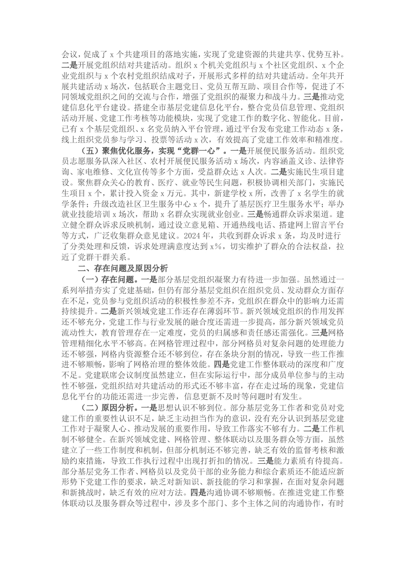2024年,在市委的坚强领导下,市委社会工作部党组始终坚持以习近平新时代中国特色社会主义思想为指导,紧紧围绕基层党建工作重点任务,聚焦强化基础保障、抓实新兴领域、推行网格管理、加强互联互通以及优化服务等关键方面,扎实推进基层党建各项工作,切实夯实党建根基,不断提升基层党组织的凝聚力和战斗力。现将2024年工作情况汇报如下:一、工作开展情况(一)强化基础保障,夯实“党建根基”。一是加强党组织阵地建设。全年累计投入资金x万元,对x个基层党组织活动场所进行升级改造,打造标准化规范化的党员活动阵地。新建活动阵地面积达到x平方米,配备了完善的多媒体教学设备、图书资料等,为党员开展学习、交流、议事等活动提供了有力的硬件支撑。二是强化党务工作者队伍建设。通过举办各类党务知识培训班x场次,覆盖党务工作者达x人次,系统提升了他们的业务能力和综合素质。同时,积极落实党务工作者待遇保障,按照相关规定足额发放工作补贴,确保队伍的稳定性。目前,已成功吸引x名优秀年轻干部加入到党务工作者队伍中,为基层党建工作注入了新鲜血液。三是保障党建工作经费投入。协调财政部门,将基层党建工作经费纳入年度预算,全年共安排党建专项经费x万元,同比增长x%。经费主要用于党组织活动开展、党员教育培训、党建项目推进等方面,切实保障了基层党建工作的顺利开展。(二)抓实新兴领域,织密“组织网络”。一是扩大新兴领域党组织覆盖。针对互联网企业、社会组织、新业态等新兴领域,开展深入调研摸底,掌握企业和组织数量、党员分布等情况。2024年,新组建新兴领域党组织x个,其中互联网企业党组织X个,社会组织党组织x个,新业态行业党组织X个,党组织覆盖率较去年提高了x个百分点,实现了党的组织和工作在新兴领域的有效覆盖。二是创新新兴领域党建工作模式。探索实施“党建+行业”融合发展模式。目前,已设立党员先锋岗x个,覆盖快递网点x个,客户投诉率较之前下降了x%。三是强化新兴领域党员教育管理。运用线上线下相结合的方式,开展新兴领域党员教育培训活动。线上依托党建云平台推送学习资料x余篇,组织线上学习交流活动x次:线下举办专题讲座、主题党日等活动x场次,参与党员达x人次,切实增强了新兴领域党员的党性修养和身份意识。(三)推行网格管理,激活“神经末梢”。一是优化网格设置。按照地域相邻、便于管理的原则,将全市划分为x个网格,每个网格配备x名网格管理员,其中党员网格管理员占比达到x%。同时,整合党建、综治、民政等各类资源,构建“多网合一”的基层治理网格体系,实现了资源共享、信息互通、工作协同。二是发挥网格党组织作用。在网格内建立党支部或党小组x个,充分发挥党组织在网格治理中的核心引领作用。通过开展党员联系群众、志愿服务等活动,及时收集和解决群众关心的热点难点问题。2024年,网格党组织共收集群众意见建议x条,解决实际问题x件,群众满意度达到x%,有效提升了基层治理效能。三是加强网格员队伍建设。组织网格员业务培训x轮次,培训内容涵盖政策法规、矛盾纠纷调解、信息采集等方面,累计培训网格员x人次,不断提升网格员的履职能力。同时,建立健全网格员考核微励机制,对表现优秀的网格员给予表彰奖励,激发了网格员的工作积极性和主动性。(四)加强互联互通,推进“整体联动”。一是建立党建联席会议制度。联合辖区内机关单位、企业、社区等党组织,建立党建联席会议制度,定期召开会议x次,共同商讨区域党建工作重点、难点问题,研究制定解决方案。通过联席