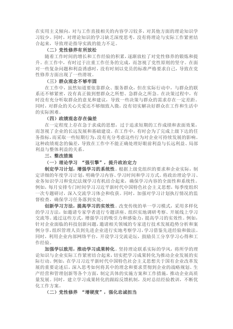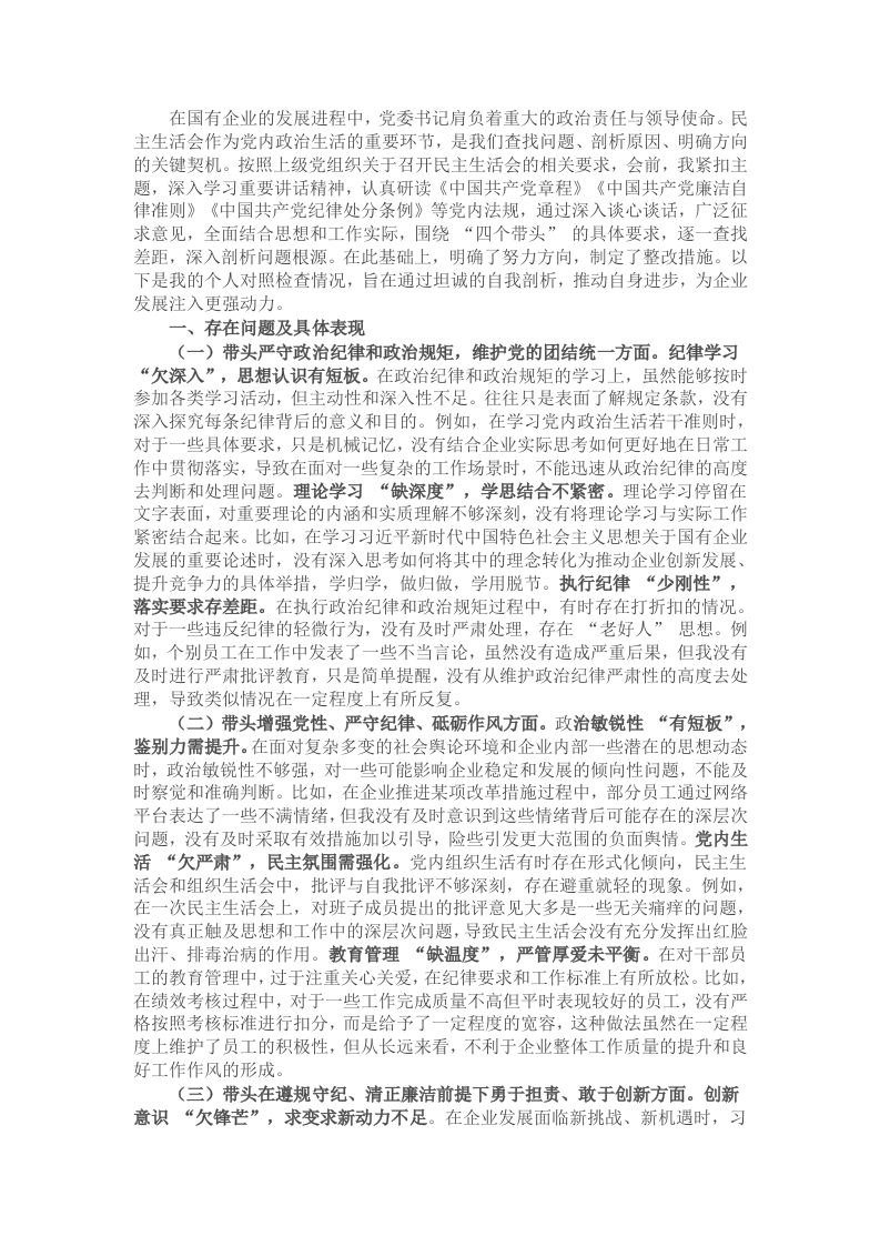 在国有企业的发展进程中,党委书记肩负着重大的政治责任与领导使命。民主生活会作为党内政治生活的重要环节,是我们查找问题、剖析原因、明确方向的关键契机。按照上级党组织关于召开民主生活会的相关要求,会前,我紧扣主题,深入学习重要讲话精神,认真研读《中国共产党章程》《中国共产党廉洁自律准则》《中国共产党纪律处分条例》等党内法规,通过深入谈心谈话,广泛征求意见,全面结合思想和工作实际,围绕“四个带头”的具体要求,逐一查找差距,深入剖析问题根源。在此基础上,明确了努力方向,制定了整改措施。以下是我的个人对照检查情况,旨在通过坦诚的自我剖析,推动自身进步,为企业发展注入更强动力。一、存在问题及具体表现(一)带头严守政治纪律和政治规矩,维护党的团结统一方面。纪律学习“欠深入”,思想认识有短板。在政治纪律和政治规矩的学习上,虽然能够按时参加各类学习活动,但主动性和深入性不足。往往只是表面了解规定条款,没有深入探究每条纪律背后的意义和目的。例如,在学习党内政治生活若干准则时,对于一些具体要求,只是机械记忆,没有结合企业实际思考如何更好地在日常工作中贯彻落实,导致在面对一些复杂的工作场景时,不能迅速从政治纪律的高度去判断和处理问题。理论学习“缺深度”,学思结合不紧密。理论学习停留在文字表面,对重要理论的内涵和实质理解不够深刻,没有将理论学习与实际工作紧密结合起来。比如,在学习习近平新时代中国特色社会主义思想关于国有企业发展的重要论述时,没有深入思考如何将其中的理念转化为推动企业创新发展、提升竞争力的具体举措,学归学,做归做,学用脱节。执行纪律“少刚性”,落实要求存差距。在执行政治纪律和政治规矩过程中,有时存在打折扣的情况。对于一些违反纪律的轻微行为,没有及时严肃处理,存在“老好人”思想。例如,个别员工在工作中发表了一些不当言论,虽然没有造成严重后果,但我没有及时进行严肃批评教育,只是简单提醒,没有从维护政治纪律严肃性的高度去处理,导致类似情况在一定程度上有所反复。(二)带头增强党性、严守纪律、砥砺作风方面。政治敏锐性“有短板”,鉴别力需提升。在面对复杂多变的社会舆论环境和企业内部一些潜在的思想动态时,政治敏锐性不够强,对一些可能影响企业稳定和发展的倾向性问题,不能及时察觉和准确判断。比如,在企业推进某项改革措施过程中,部分员工通过网络平台表达了一些不满情绪,但我没有及时意识到这些情绪背后可能存在的深层次问题,没有及时采取有效措施加以引导,险些引发更大范围的负面舆情。党内生活“欠严肃”,民主氛围需强化。党内组织生活有时存在形式化倾向,民主生活会和组织生活会中,批评与自我批评不够深刻,存在避重就轻的现象。例如,在一次民主生活会上,对班子成员提出的批评意见大多是一些无关痛痒的问题,没有真正触及思想和工作中的深层次问题,导致民主生活会没有充分发挥出红脸出汗、排毒治病的作用。教育管理“缺温度”,严管厚爱未平衡。在对干部员工的教育管理中,过于注重关心关爱,在纪律要求和工作标准上有所放松。比如,在绩效考核过程中,对于一些工作完成质量不高但平时表现较好的员工,没有严格按照考核标准进行扣分,而是给予了一定程度的宽容,这种做法虽然在一定程度上维护了员工的积极性,但从长远来看,不利于企业整体工作质量的提升和良好工作作风的形成。(三)带头在遵规守纪、清正廉洁前提下勇于担责、敢于创新方面。创新意识“欠锋芒”,求变求新动力不足。在企业发展面临新挑战、新机遇时,习