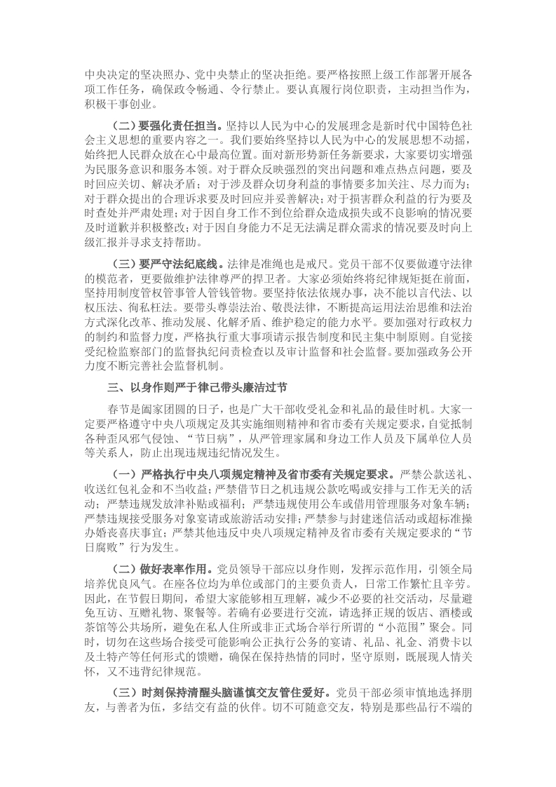 同志们:随着春节的脚步日益临近,我们迎来了这个传统佳节。今天,我们特地利用节前的宝贵时间召开这次廉政谈话会,旨在表达对大家的关心与爱护,并在新的一年伊始为大家敲响警钟。希望通过本次交流,大家能进一步增强廉洁自律、抵御腐败的能力,始终保持清醒的头脑,坚守底线,不触碰红线,真正做到心有所畏、言有所戒、行有所止。接下来,我结合当前党风廉政建设的形势和任务要求,与大家分享几点思考。一、常怀敬畏之心,做到自律守廉“人不以规矩则废,党不以规矩则乱。”自党的十八大以来,全面从严治党不断向纵深推进,不敢腐、不能腐、不想腐的战略目标逐步实现。然而,近期通报的一些违反中央八项规定精神及侵害群众利益的不正之风问题显示,个别干部仍未完全筑牢思想道德防线,未能严格执行纪律。对此,我们必须保持高度的警惕性、责任感和紧迫感,算好政治账、经济账、名誉账“三本账”,切实做到慎独、慎微、慎权、慎欲、慎友,始终维持清醒的头脑。(一)要常修道德情操。道德是为人的根本,是做人做事的基础。作为社会的中坚力量,党员干部更应在修身律己上树立榜样。我们要稳住思想道德这个“总开关”,自觉加强学习教育,树立正确的世界观、人生观和价值观。坚持以德立身,加强精神修养,培养高尚情操,追求健康情趣,远离低级趣味,自觉抵制风邪气侵蚀:同时,要加强家庭家教家风建设,严格约束自己和家人的行为举止,坚决反对特权思想和行为:经常对照《廉洁自律准则》等党内法规进行自查自纠,及时发现并纠正问题。(二)要常思贪欲之害。“当官发财两条道,当官就不要发财。”理想信念滑坡是最危险的滑坡。一旦有了“贪念”,就会丧失定力、迷失方向。一些干部走上违纪违法道路的根本原因就在于他们放松了自我要求,背弃了初心使命,被物质欲望所俘获、被金钱利益所迷惑、被灯红酒绿所诱惑。大家必须引以为戒、吸取教训,正确对待名利得失,始终保持一颗平常心、一个纯洁心、一份感恩心。(三)要常弃非分之想。人的一生不可能一帆风顺,总会遇到各种问题和困难。作为一名党员干部特别是领导干部,必须坚守底线、不碰红线,时刻牢记职责使命。要常修为政之德,坚持依法依规办事:要常思贪欲之害,见钱眼开必生祸端:要常怀律己之心,不该拿的不拿、不该吃的不吃、不该去的地方不去:要常除陋习之弊,不该交的人不交、不该做的事情不做:要常记亲朋之面,不该说的话不说、不该做的事不做:要常存敬畏之心,不越法纪红线。同时还要在小事小节上严格要求自己,管住自己的嘴、腿和手。二、尽职尽责履好职,坚持勤政廉政作风建设永远在路上。大家一定要认真履职尽责,持之以恒改进作风,努力营造风清气正的良好氛围。(一)要提高政治站位。旗帜鲜明讲政治是我们党作为马克思主义政党的根本要求。习近平总书记明确指出:“党政军民学,东西南北中,党是领导一切的”。这就要求我们牢固树立“四个意识”,坚定“四个自信”,坚决维护党中央的核心地位,坚决维护党中央权威和集中统一领导。凡是党中央提倡的坚决响应、党