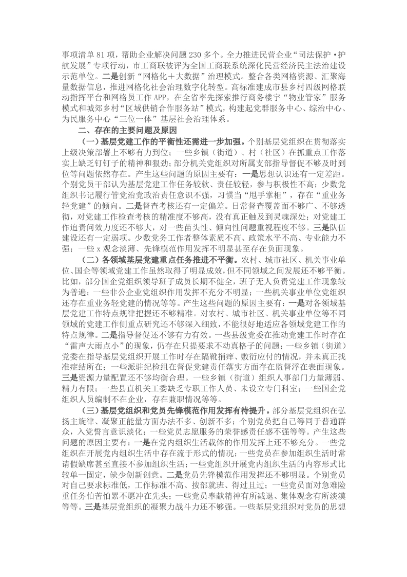 一、工作开展情况(一)坚持围绕中心抓党建,党建引领作用更加凸显。一是聚焦聚力产业转型,夯实高质量发展根基。建立市级领导干部联企业制度,深入开展“四送一服”活动,协调解决企业诉求2300多个。华海药业获得省级制造业单项冠军企业,万方医药获评省专精特新企业。新增规上工业企业28家、高新技术企业65家。宁国经济开发区在全省7家省级开发区综合考评中位列第一。二是深化开放创新协作,增强高质量发展动能。组建市属国有企业发展联盟,推动要素共享、优势互补。优化营商环境吸引项目,全年新签约亿元以上项目59个,其中10亿元以上19个,主导产业链项目41个。实际利用省外资金127亿元。建成“零土地”厂房15万平方米,入驻企业84家。整车产量增长21.7%,增幅创历史新高。主导或参与制(修)订国家标准33项、行业标准53项,新增“楚商商标”品牌20余个。三是坚持城乡统筹融合,筑牢高质量发展底盘。划定“三区三线”,优化城镇开发边界,城市面积扩大到317平方公里。改造老旧小区82个。新建安置房1041套、惠及群众3924户。青阳路东延段、西山大道竣工通车,滨江东路正式通车,北环路全线贯通,打通断头路7条。新建农村公路546公里,完成养护工程104公里。全国文明城市创建工作扎实推进,获批省级文明城市。(二)坚持从严从实抓党建,党的建设质量明显提升。一是抓好理论武装,落深思想认识。坚持以习近平新时代中国特色社会主义思想为指导,及时跟进学习习近平总书记重要讲话重要指示批示精神,全面落实“第一议题”制度。全年举办市委理论学习中心组学习14次,举办读书班4期,开展研讨交流5次,全市各级党组织开展集中宣讲300多场次,受教育干部群众近12万人次。二是加强基层组织建设,提质党建工作水平。在全省率先开展基层党组织“三规范三提升”行动,制定实施意见和三年行动计划。排查整顿软弱涣散村党组织19个。在全省首创村级“小微权力”清单、村级财务网上公开平台,全面推行村级事务公开标准化格式文本。新成立两新组织党组织89个。强化党员教育管理,有序推进党员不信教工作,处置违规违法党员39名。在全省率先试点打造“党建十信访”工作机制,形成“信访超市”“信访代办”等经验做法。三是坚持选人用人导向,锻造过硬干部队伍。完善干部日常考核评价机制,先后调整干部2批68人。鲜明树立重实干重实绩的用人导向,选拔使用在重大项目攻坚一线、疫情防控一线、防汛救灾一线、扫黑除恶一线表现突出的干部208名,优先提拔重用有担当善作为的干部265名。运用监督执纪“第一种形态”处理干部1266人次。四是从严监督执纪问责,营造良好政治生态。压实“两个责任”,开展纪检监察干部业务培训4期。做实以案促改“后半篇文章”,查处违反中央八项规定精神问题线件数、处分人数同比分别下降37.8%、35.7%。深入推进清廉建设“六廉”行动、“五抓五促”工作举措,重点纠治民生领域损害群众利益问题。运用法治思维和法治方式深化平安建设,主动融入社会治理格局。深化网格化服务管理,调整优化网格设置,高标准建成智慧社区信息化平台。推动和义镇群丰村、福井村省级美丽乡村中心村建设点位连片开发建设。纵深推进扫黑除恶斗争常态化工作机制,持续加大打击力度,挂牌督办涉黑涉恶案件8件,办理涉恶线索139条、“保护伞”线索24条。(三)坚持主动作为抓党建,社会治理效能持续提升。一是着力践行“枫桥经验”。深化“互联网十政务服务”,全面推进“最多跑一次”“不见面审批”改革。全面推行政务公开标准化规范化试点工作,建立健全政务公开标准体系。扎实开展“百名干部进百企”“我为群众办实事”等活动,梳理制定“四送一服”