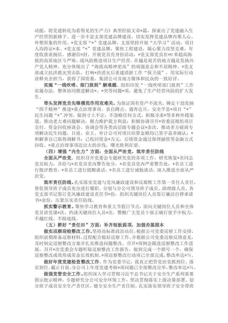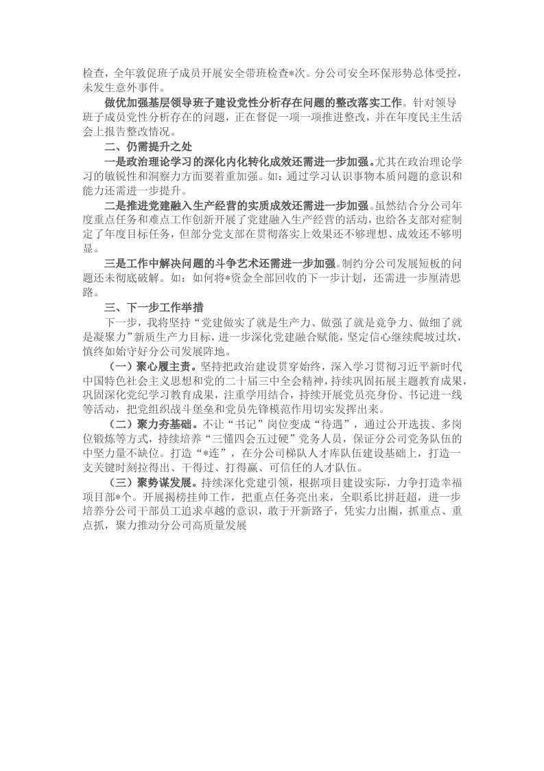 尊敬的各位领导,同志们:2024年,我和班子成员一道,团结和带领分公司全体党员干部员工全力完成上级赋予的各项任务,保持了分公司稳定健康良好的发展势头,现将个人履职尽责情况汇报如下。一、个人履职尽责情况(一)守牢“主阵地”方面:突出政治引领,抓实学习教育突出强化政治建设入心见行。聚焦学习贯彻习近平新时代中国特色社会主义思想和党的二十届三中全会精神,持续巩固拓展主题教育,组织印发关于进一步规范和加强政治理论学习的意见,规范政治理论学习。年度共组织开展党委理论学习中心组学习*次,落实“第一议题”*余次,督促各党支部开展“三会一课”主题党日等规定动作*余次,参加线下集中专项培训*次,政治判断力、政治领悟力、政治执行力得到进一步提高。扎实推进党纪学习教育落地见效。组织专题研究制定工作计划,举办*天专题读书班,督促班子成员讲包含党纪学习教育内容的专题党课,开展集中政治理论学习*次,警示教育*次,引导全体党员干部员工学纪、知纪、明纪、守纪,做到全覆盖。坚决把牢意识形态方向强化引领。坚持落实意识形态工作责任制,组织专题研究意识形态工作*次,把牢关卡风口。全年未发生意识形态领域不可控重大问题和突发事件。(二)激发“新动力”方面:夯实基层基础,筑强战斗堡垒抓好班子强合力。聚焦加强基层领导班子建设专项行动,组织高质量开展务虚会、党性分析会和专题读书班各*次,就如何带领队伍、打造什么样的团队、如何促进发展进行专题研讨分析和集中谋划。聚焦班子成员“一岗双责”责任落实,划分党建责任区和基层联系点*个,促进充分履职,实现党建与生产经营工作同步抓、同部署、同考核。抓好支部强堡垒。加强“三基”建设,选优配强支部书记*名、副书记*名,新建党支部*个。壮大党员队伍,发展预备党员*名,转正党员*名。强化党员先锋模范作用发挥,*名同志获得公司优秀共产党员。季度组织召开政工例会暨党员大会,确保党的队伍定期加强交流、沟通思想。抓实党员教育培训,*名党组织书记全部参加公司组织的党组织负责人专项培训,*次组织全体党员参加党纪学习教育专项培训和党的二十届三中全会集中轮训,确保党的创新理论在基层得到学习贯彻落实。抓好队伍强基础。树立正确的选人用人导向,年度共组织开展公开竞聘工作*次,提升*人至项目部副职岗位,*人至主管、一级员岗位,激发了干部员工活力干劲。深入落实“三项制度改革”,对排名末尾的*名基层管理人员进行降职处理,确保党的干部队伍能进能出、能上能下。强化市场化用人机制,通过社会招聘方式引入外部人才*人,其中基层管理人员*人,新能源项目管理人员*人,填补了分公司无新能源项目管理经验人员的空缺。建立中层后备、基层管理人员般管理人员梯队人才库,明确了*名员工的培养方向和培养周期。(三)应对“新考验”方面:聚焦中心任务,深化内化转化深化党建融合赋能显作用。创新实施项目化党建,组织研究制定工作方案,过程蓄势赋能、强化落实。如:党支部“*”党建项目新签合同额*元,项目实施取得重大成效。同时注重经验总结,向公司上报了《以项目化党建开辟发展新