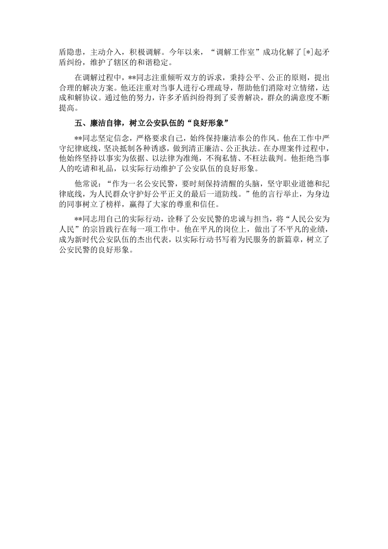 *同志,生于[具体年月],中共党员,现任[公安局名称][具体部门]民警。自加入公安队伍以来,他始终坚守岗位,用实际行动诠释着“人民公安为人民的初心和使命。无论面对何种挑战,他都始终奋战在一线,以坚定的信念和无畏的勇气,守护着社会的安宁和人民的幸福,赢得了群众的广泛赞誉和信任。他并非遥不可及的英雄,而是在平凡的岗位上展现出不平凡的担当的基层民警。一、心系群众,诠释执法为民的“深厚情感”**同志坚信:“公安民警的职责就是保民平安、为民服务。”他始终将群众的安危冷暖放在心上,用实际行动践行“为民服务”的宗旨。他所在的辖区人员复杂、治安形势严峻,他主动深入社区,了解群众需求,为群众排忧解难。他积极组织开展安全防范宣传活动,用通俗易懂的语言,将安全知识传递给每一位居民。通过举办安全讲座、发放宣传资料等方式,提高了群众的安全意识和自我防范能力。今年已累计开展安全宣传活动[*]场,服务群众[]人次。他特别关注辖区内的孤寡老人和困难群众,定期上门走访,为他们提供帮助和关怀。他会为老人检查家中的安全隐患,为困难群众送去生活必需品,让他们感受到公安机关的温暖。老人们亲切地称他为“贴心人”,这正是他与群众之间深厚情谊的体现。二、打击犯罪,担当维护平安的“先锋战士”**同志立足本职工作,坚决打击各类违法犯罪行为,为维护社会治安稳定贡献力量。他凭借敏锐的洞察力和扎实的专业知识,在案件侦破中发挥了重要作用。他深入研究犯罪规律和特点,善于从细微之处发现线索,成功破获了多起重大案件。在一次打击盗窃犯罪的专项行动中,*同志通过对案发现场的仔细勘查和对周边群众的走访调查,迅速锁定了犯罪嫌疑人的行踪。经过连续几天的蹲守,最终将犯罪嫌疑人成功抓获,为群众挽回了经济损失。他还积极参与扫黑除恶专项斗争,与同事们并肩作战,打掉了多个黑恶势力团伙,有效净化了社会治安环境。三、创新宜传,成为反诈防骗的“行家里手”*同志深刻认识到电信诈骗犯罪的严重危害,积极投身到反诈宣传工作中。他创新宣传方式,通过制作生动有趣的反诈短视频、编写朗朗上口的反诈口诀等方式,提高了群众的反诈意识。他还深入学校、企业、社区等场所,开展反诈专题讲座,结合实际案例,为群众讲解电信诈骗的常见手段和防范方法。今年以来,他组织的反诈宣传活动覆盖了[]个社区、[*]所学校和[*]家企业,有效降低了电信诈骗案件的发案率。为了更好地开展反诈宣传工作,**同志还组建了一支反诈志愿者队伍,通过培训和指导,提高了志愿者的反诈宣传能力。他们共同努力,形成了全民反诈的良好氛围,守护了群众的“钱袋子”。四、积极调解,探索矛盾化解的“有效方法”**同志注重矛盾纠纷的排查和化解,努力将矛盾解决在基层,消除在萌芽状态。他在辖区内设立了“调解工作室”,邀请经验丰富的调解员和律师参与,共同化解矛盾纠纷。他定期组织开展矛盾纠纷排查工作,及时发现和掌握潜在的矛