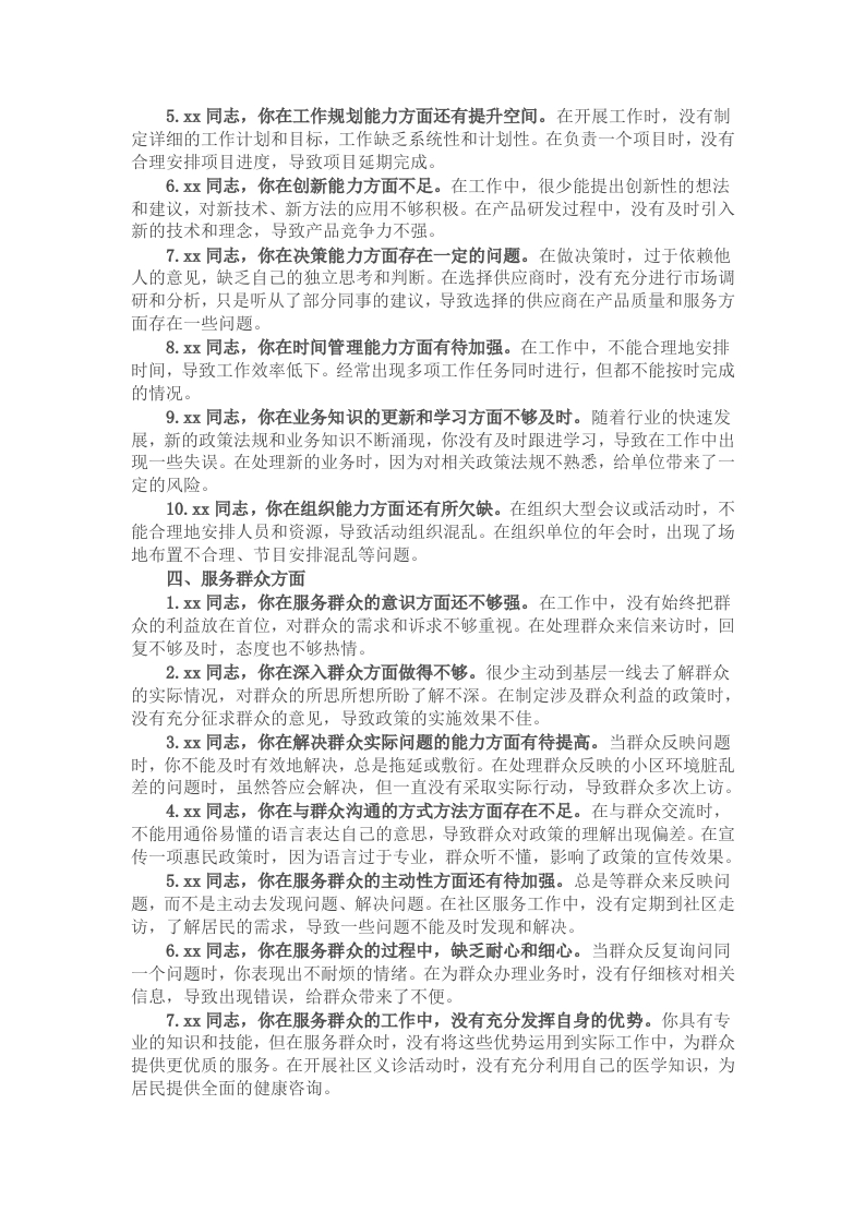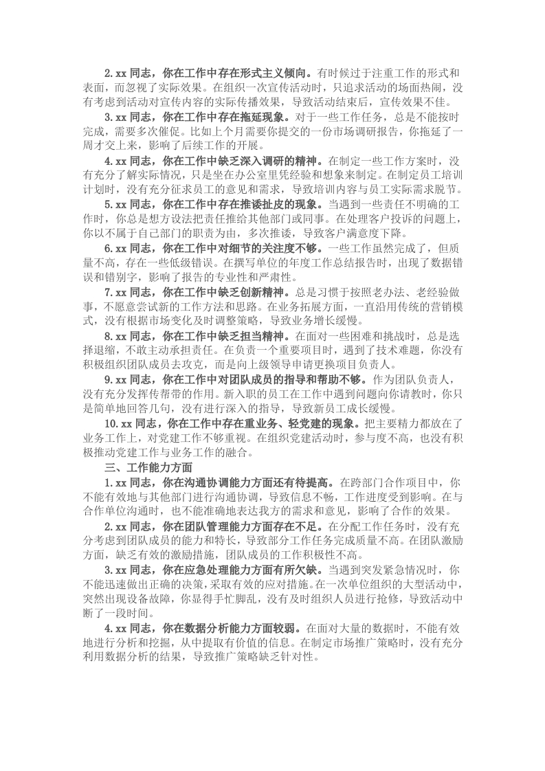 一、思想建设方面1.xx同志,在理论学习上,你存在实用主义倾向。对于和自己工作直接相关的内容就深入学习,像一些宏观的理论政策,虽然组织集中学习时参与了,但后续自主钻研很少,导致对党的创新理论体系缺乏系统性认知。比如在学习新发展理念时,只是了解了大概,对于如何在我们单位的业务拓展中精准运用,没有深入思考。2.x同志,你在思想上存在一定的保守性。面对新思想、新观点,接受速度较慢,总是习惯用旧有的思维模式去分析判断。在最近关于数字化转型的讨论中,你多次提出质疑,认为我们沿用传统业务模式更稳妥,没有充分看到数字化转型带来的巨大潜力和机遇。3.x同志,你在理论学习与实际工作结合方面做得不够。虽然参与了各类理论学习活动,但在实际工作中,很少能将所学理论运用到工作决策和问题解决中。比如在制定今年的工作计划时,完全没有体现出以人民为中心的发展思想,没有充分考虑到群众的需求和利益。4.x同志,你对意识形态工作的重视程度还不够。在日常工作中,很少主动关注意识形态领域的动态,对单位内部可能存在的一些不良思想倾向没有及时发现和纠正。例如,在单位内部交流群中,有个别xx同志转发了一些未经证实的负面信息,你没有及时提醒制止。5.x同志,在思想解放方面,你还存在一定的局限性。在面对一些改革创新举措时,总是担心会出现风险和问题,从而畏首畏尾,不敢大胆尝试。在推进单位内部的绩效考核制度改革时,你提出了很多反对意见,虽然有一定的合理性,但也在一定程度上阻碍了改革的进程。6.x同志,你在理论学习的深度上有所欠缺。对于一些重要的理论著作,只是简单地浏览了一遍,没有深入研究其中的内涵和精髓。在学习党的二十大报告时,对于一些关键的政策解读,没有深入领会,导致在向基层员工传达时,内容不够准确、深入。7.x同志,你在学习的主动性和自觉性方面有待提高。总是依赖组织的集中学习,很少主动利用业余时间进行学习。在近期的一次理论知识测试中,你的成绩不太理想,反映出你对理论知识的掌握不够扎实。8.x同志,你在思想上存在一定的本位主义。在考虑问题时,总是从自己所在的部门角度出发,没有站在单位整体的高度去思考。在跨部门项目合作中,你过于强调本部门的利益,忽视了整体的工作目标,影响了项目的顺利推进。9.x同志,你对党的创新理论学习缺乏持之以恒的精神。学习时断时续,没有形成良好的学习习惯。在学习习近平新时代中国特色社会主义思想时,没有制定系统的学习计划,导致学习效果不佳。10.xx同志,你在面对复杂的国际形势和社会思潮时,政治敏锐性不够强。对于一些不良思潮的渗透,没有及时察觉和抵制。在网络上,看到一些歪曲历史、诋毁英雄的言论,你没有及时进行反驳和纠正。二、工作作风方面1.x同志,你在工作中存在急躁情绪。当工作任务繁重或遇到紧急情况时,你不能很好地控制自己的情绪,对同事态度不够耐心,容易给团队带来负面情绪。例如,在最近的项目汇报前夕,因为数据整理出现问题,你对负责数据的同事大发雷霆,影响了团队的凝聚力。