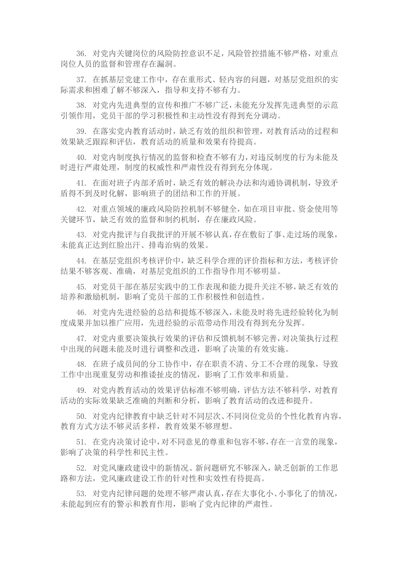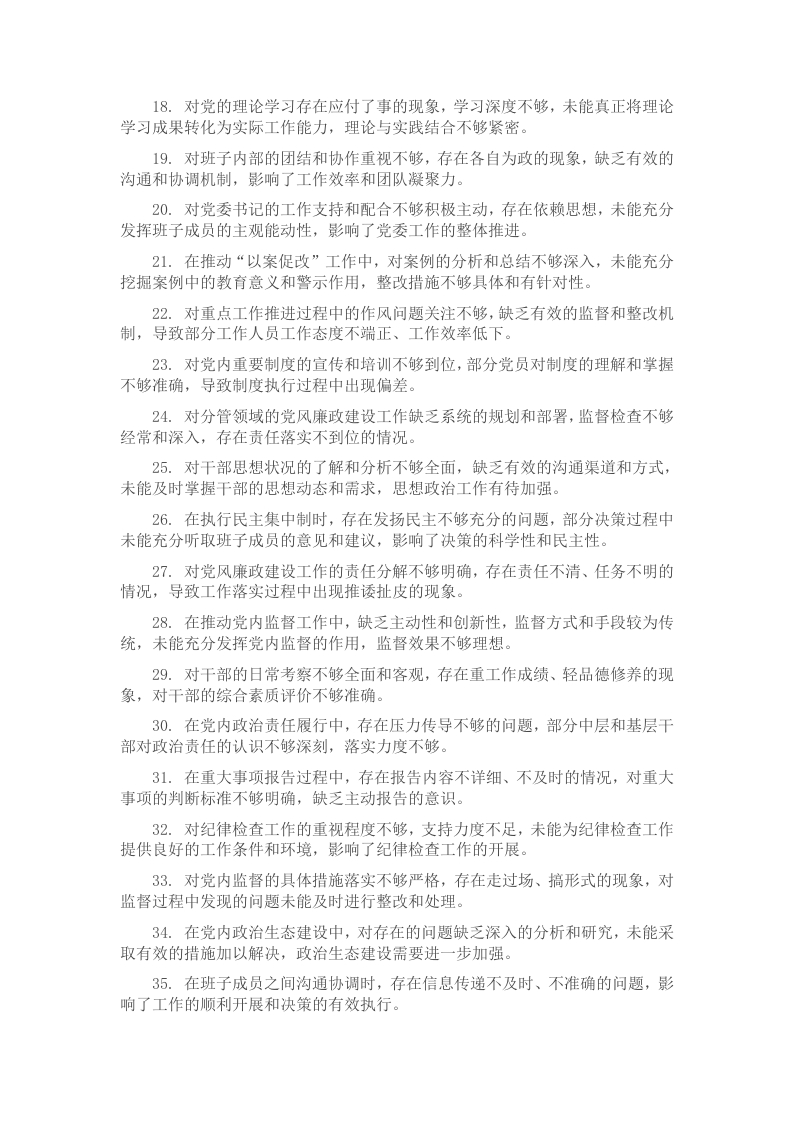 1.对“两个维护”的践行不够深入,仅停留在表面的口号上,缺乏在实际工作中的具体体现,未能将其真正贯彻到每一项决策和行动中。2.在推动党的群众路线教育实践活动中,未能充分结合本单位实际情况创新活动形式,导致活动效果不够显著,群众参与度不高。3.对党员的思想政治教育不够重视,教育内容和方法较为单一,缺乏针对性和实效性,未能有效提升党员的政治觉悟和思想素质。4.在监督领导干部履行职责时,存在不敢监督、不愿监督的现象,对一些违规行为未能及时发现和纠正,监督力度有待加强。5.对党内规章制度的执行缺乏有效的监督和检查机制,导致部分规章制度执行不到位,存在打折扣、搞变通的情况。6.在整治形式主义、官僚主义方面,措施不够有力,部分问题仍然存在,如文件多、会议多等问题没有得到根本解决。7.对党内重大决策的前期调研不够充分,未能广泛听取各方面意见,导致决策的科学性和可行性受到一定影响。8.廉政教育形式不够丰富,缺乏生动性和感染力,对党员干部的廉政意识培养效果不明显,存在教育内容与实际工作脱节的问题。9.对党风廉政建设的宣传工作不够深入,宣传渠道较为狭窄,未能充分利用现代信息技术手段进行多方位宣传,宣传效果有待提高。10.对干部队伍中的潜在问题未能及时察觉和解决,对干部的日常管理和监督存在漏洞,尤其是在干部的工作作风和廉洁自律方面。11.在民主生活会中,存在批评与自我批评不够深刻的问题,部分同志对自身问题认识不足,对他人的批评避重就轻,影响了民主生活会的质量。12.对党内纪律学习的组织和引导不够,学习方法单一,缺乏系统性和连贯性,导致部分党员纪律意识淡薄,对纪律规定了解不够深入。13.对关键岗位和重要环节的廉政风险点排查不够细致,防控措施不够完善,存在一定的廉政风险隐患。14.对党内组织生活的重视程度不够,组织生活形式较为单一,内容不够丰富,缺乏吸引力,导致党员参与积极性不高。15.在选人用人方面,标准不够明确,考察不够全面,存在重学历、轻能力,重资历、轻潜力的现象,影响了干部队伍的整体素质。16.对重点岗位干部的培训和教育不够系统,缺乏针对性的培训计划和内容,导致干部的业务能力和综合素质提升缓慢。17.对党内出现的一些不良倾向和苗头性问题,缺乏敏锐的洞察力和及时的干预措施,未能将问题解决在萌芽状态。