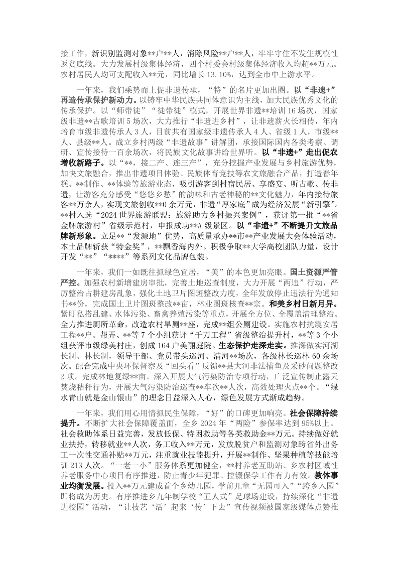 2025年乡人民政府工作报告各位代表:现在,我代表**乡人民政府向大会报告工作,请予审议,并请各位列席人员提出意见。一、2024年工作回顾2024年是中华人民共和国成立75周年,也是实现“十四五”规划目标任务的关键一年。我们坚持以习近平新时代中国特色社会主义思想为指导,在县委县政府和乡党委的坚强领导下,在乡人大的监督支持下,紧紧围绕市委****目标,聚焦*建设任务,团结带领全乡各族干部群众,聚决战之力,展实干之风,答奋斗之卷,圆满完成年度目标任务。一年来,我们持之以恒抓经济建设,“强”的基础更加夯实。经济发展势头强劲。我们克服诸多不利因素,积极向上争取项目政策,多措并举谋划产业转型升级,经济实力显著提升。完成固定资产投资**万元,经济总量首次突破*亿元大关,增长*%,高于全国、全省、全市、全县同比增幅。招商引资量质齐升。成功举办商企新春见面会活动,搭建政商交流平台,为组建**乡商会及招商引资奠定坚实基础。坚持“走出去”“引进来”,与*有限公司签订综合能源项目,签约资金达**万元。项目建设蹄疾步稳。投资*万元完成跨乡调水工程建设,正在进行通水调试。投资**万元完成**基地*种植、深井取水灌溉,正在组织砍运。投资*万元建成*项目并交付使用,改善*余亩坚果灌溉条件。投资*万元建设坚果分拣中心项目正在进行收尾工作。申请2025年以工代赈项目资金**万元建设*小组通村道路正在进行招投标程序。投资*万元完成*一组和*小组2个彩票公益金项目。投资200.2万元实施*博物馆提升改造项目有序推进,预计上半年建成开馆。投资*万元的区域性养老服务中心项目即将建成交付。营商环境持续优化。全力做好乡权责清单的编制,承接140项**级赋权事项,构建简约高效基层管理体制。认真落实助企纾困各项政策,发放“贷免扶补”创业贷款140万元。落实*县支持联农带农新型农业经营主体奖补办法,*个新型经营主体带动*户群众增收致富,企业获奖补**万元。全力推广融信服平台下载注册工作,完成**户中小企业及个体户平台注册,通过融信服平台办理企业贷款*万元。一年来,我们精耕细作促乡村振兴,“富”的成果更加丰硕。农业产业提档升级。认真落实粮食安全责任制,耕地“非农化”“非粮化”整治成效明显,完成2023-2024年度耕地流出问题图斑整改*亩。粮食播种面积稳定在*万亩,产量*吨。传统产业稳步发展,甘蔗收获面积1*8亩,预计产值达2**0万元:菠萝、砂糖橘、香蕉、百香果等水果种植面积**亩,产值达*万元:大牲畜存栏*头,出栏*头;猪存栏*头,出栏*头:禽存栏*万只,出栏**万只。特色产业发展迅速,*种植面积首次突破5万亩,产量达**吨,产值达*万元:**产量突破20吨,产值翻番突破1000万元;生姜种植面积*2亩,产量*吨,产值*万元:牵头引进**产业,种植面积*亩,产量*吨,产值*万元。基础设施持续优化。运用“千万工程”经验,投入*万元完成*一石场、*小组一公路、*小组一**公路等**公里道路养护工程。投入272万元完成**单腰一**尖山*公里道路硬化。清运处理生活垃圾259车次955吨,集镇区生活污水处理设施建成投入使用。人民生活日益改普。持续推进巩固拓展脱贫攻坚成果同乡村振兴有效衔