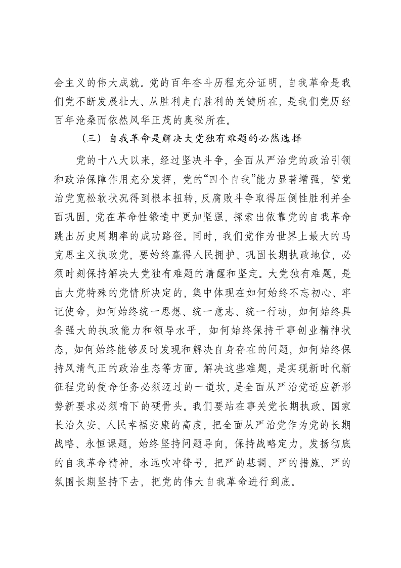党课讲稿:全面准确理解把握习近平总书记关于党的自我革命的重要思想同志们:党的十八大以来,习近平总书记围绕党的自我革命作出一系列重要论述,深刻阐述了党的自我革命的重大意义、科学内涵、实践要求,形成了关于党的自我革命的重要思想,为深入推进全面从严治党、推进党的建设新的伟大工程提供了强大思想武器和行动指南。在二十届中央纪委三次全会上,习近平总书记从新时代新征程党和国家事业发展全局的战略高度,深刻阐述了健全全面从严治党体系的目标任务、实践要求,对坚定不移深入推进全面从严治党作出战略部署,为新征程上深入推进新时代党的建设新的伟大工程指明了前进方向、提供了根本遵循。作为新时代纪检监察干部,我们要深入学习贯彻习近平总书记关于党的自我革命的重要思想,准确把握健全全面从严治党体系的战略部署,不断提高政治判断力、政治领悟力、政治执行力,以实际行动推动全面从严治党、党风廉政建设和反腐败斗争向纵深发展。借此机会,由我为大家作一堂党课报告,与同志们共同交流。一、深刻认识党的自我革命的重大意义勇于自我革命是我们党最鲜明的品格,是我们党最大的优势,是我们党跳出治乱兴衰历史周期率的第二个答案。习近平总书记指出:“在进行社会革命的同时不断进行自我革命,是我们党区别于其他政党最显著的标志,也是我们党不断从胜利走向新