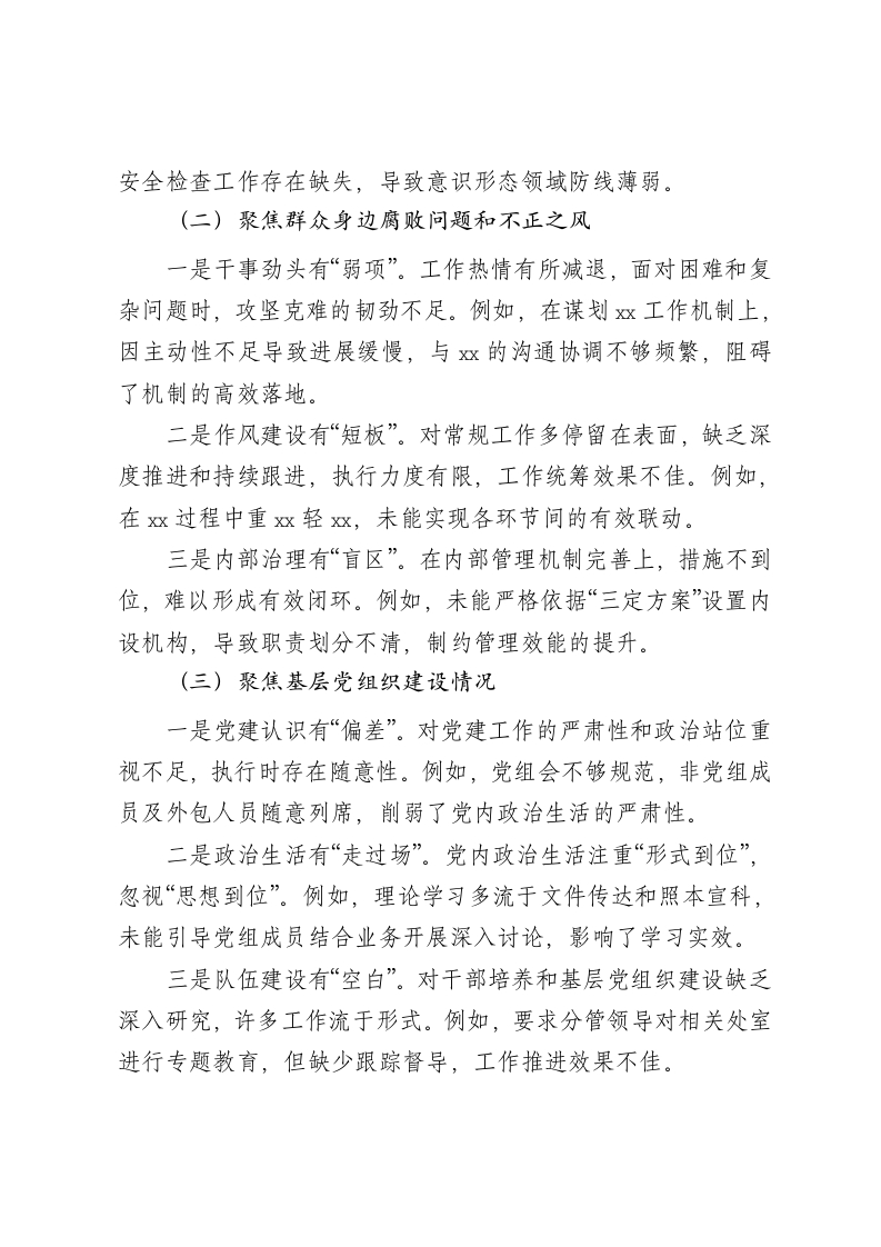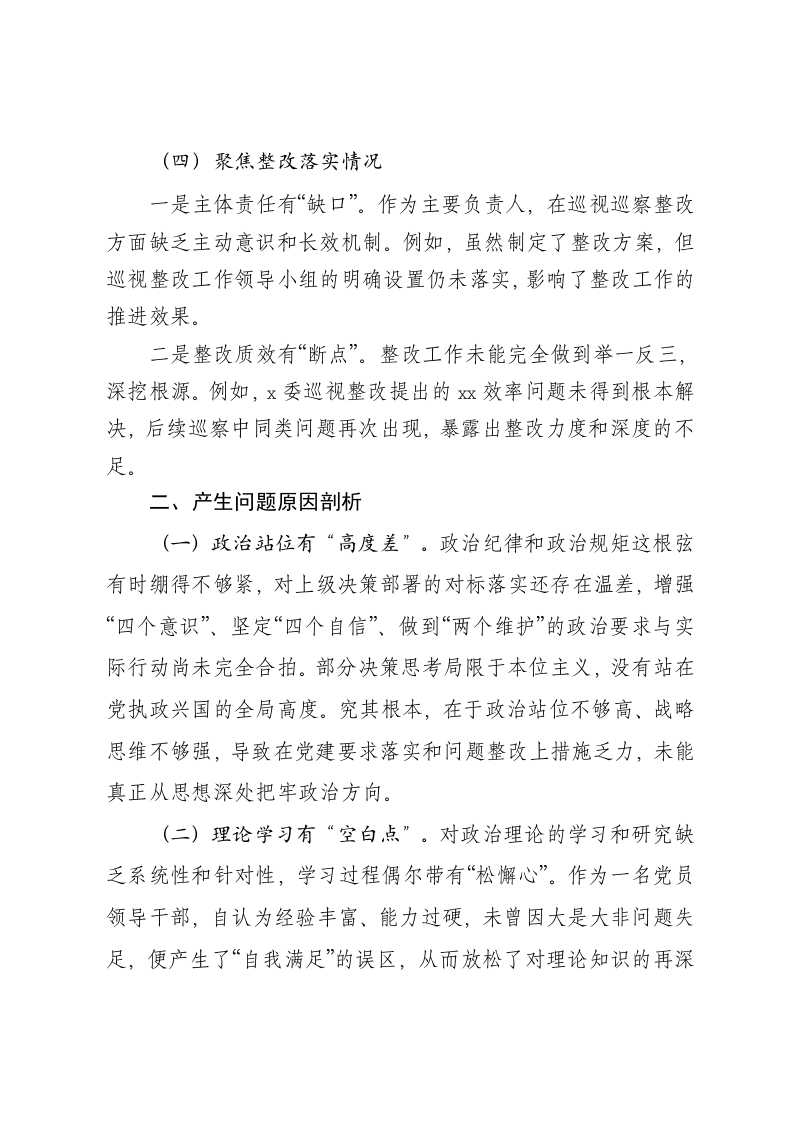 2024年巡察整改专题民主生活会个人对照检查材料根据巡察整改工作要求,我认真学习了关于巡视工作的重要论述,深刻领会察组巡察反馈局党组反馈会议精神。这不仅是一次思想上的“加压泵”,更是行动上的“导航仪”。在此基础上,通过精准认领巡察反馈问题、开展多层次谈心谈话和广泛征求意见,深挖问题根源、精准查摆不足。现将对照检查情况报告如下:一、存在的主要问题(一)聚焦党的决策部署落实情况方面一是学深悟透有“浅滩”。虽能紧跟新思想和重要讲话精神的学习步伐,但学习的“深度”和“温度”仍显不足。事务繁忙时易以任务应付学习,主动性和自觉性缺乏,未能真正做到学以致用。例如,对关于高质量x助推经济发展的指示精神未完全融会贯通,存在学习表面化、落实不到位的现象。二是执行部署有“偏差”。对重大决策和上级指示的理解和执行不够精准,学习浅尝辄止,执行中难免“走样”。部分工作受制于畏难情绪或实用主义倾向,难以全面推进。例如,在推动x政策时侧重企业纳税,却忽视运营质量,未能有效提升区域经济发展的整体动能。三是意识形态有“空档”。对意识形态工作的重要性和责任感认识不足,监督检查不到位,缺乏系统性工作机制。例如,未明确网络安全第一责任人,未制定网络安全应急预案,且年度网络