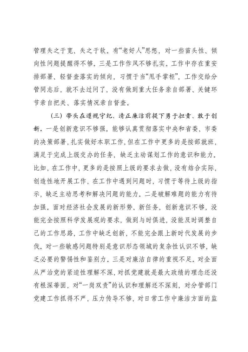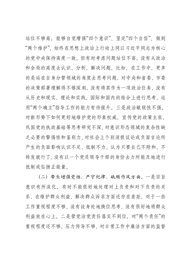 2024年度民主生活会“四个带头”对照检查发言材料根据市纪委、市委组织部关于召开2024年度民主生活会的通知要求,我紧紧围绕这次民主生活会主题,重温党章党规,认真研读《中国共产党纪律处分条例》《中共中央办公厅关于推进党纪学习教育常态化长效化的意见》等重要文件,深入学习习近平新时代中国特色社会主义思想、党的二十大和二十届二中、三中全会精神,深刻领会加强党的纪律建设的重要性,严格按照“四个带头”“三个摆进去”要求,广泛听取班子成员、基层党组织、党员干部群众的意见建议,紧密结合自身实际,深入查找自身存在的差距和不足,深刻剖析了问题根源,逐一明确整改举措。根据会议要求,现作如下发言,不妥之处请同志们批评指正。一、存在的突出问题(一)带头严守政治纪律和政治规矩,维护党的团结统一方面。一是理论学习不够系统深入。能够自觉加强政治理论学习,坚决拥护“两个确立”、增强“四个意识”、坚定“四个自信”、做到“两个维护”,但对照更高标准、更严要求,还存在一定差距。在学习内容上,学习党的二十大精神、习近平总书记重要讲话精神等不够全面,在学习方法上,满足于集中学习和个人自学,没有做到带着问题学、深入思考学,没有将理论学习与实际工作相结合,用党的创新理论指导实践、推动工作的能力有待提升。二是政治