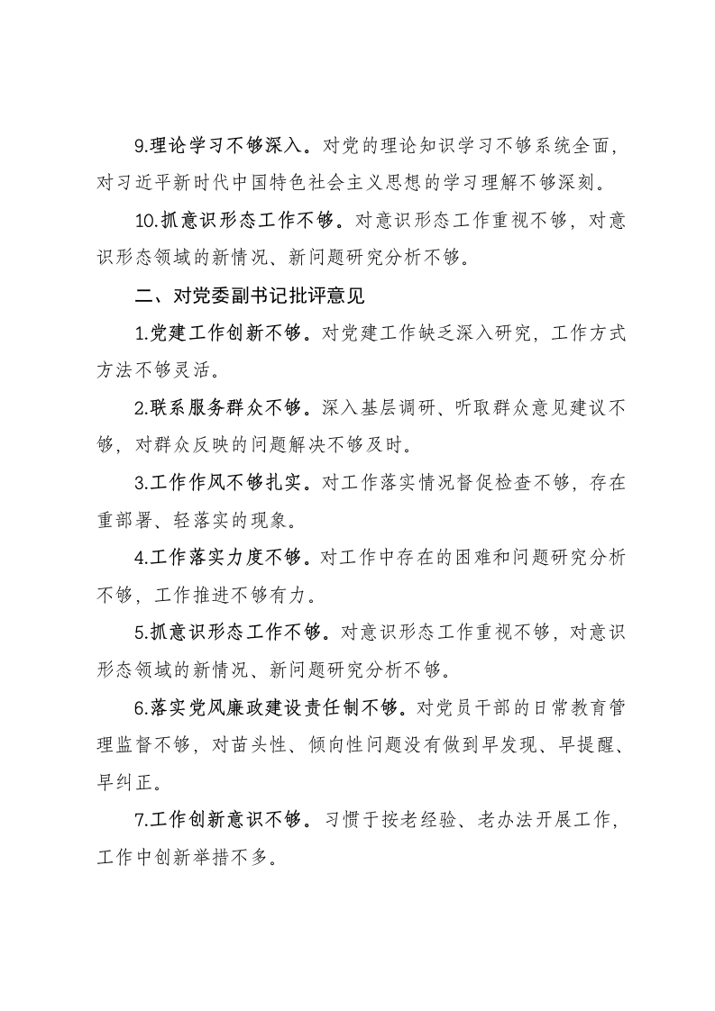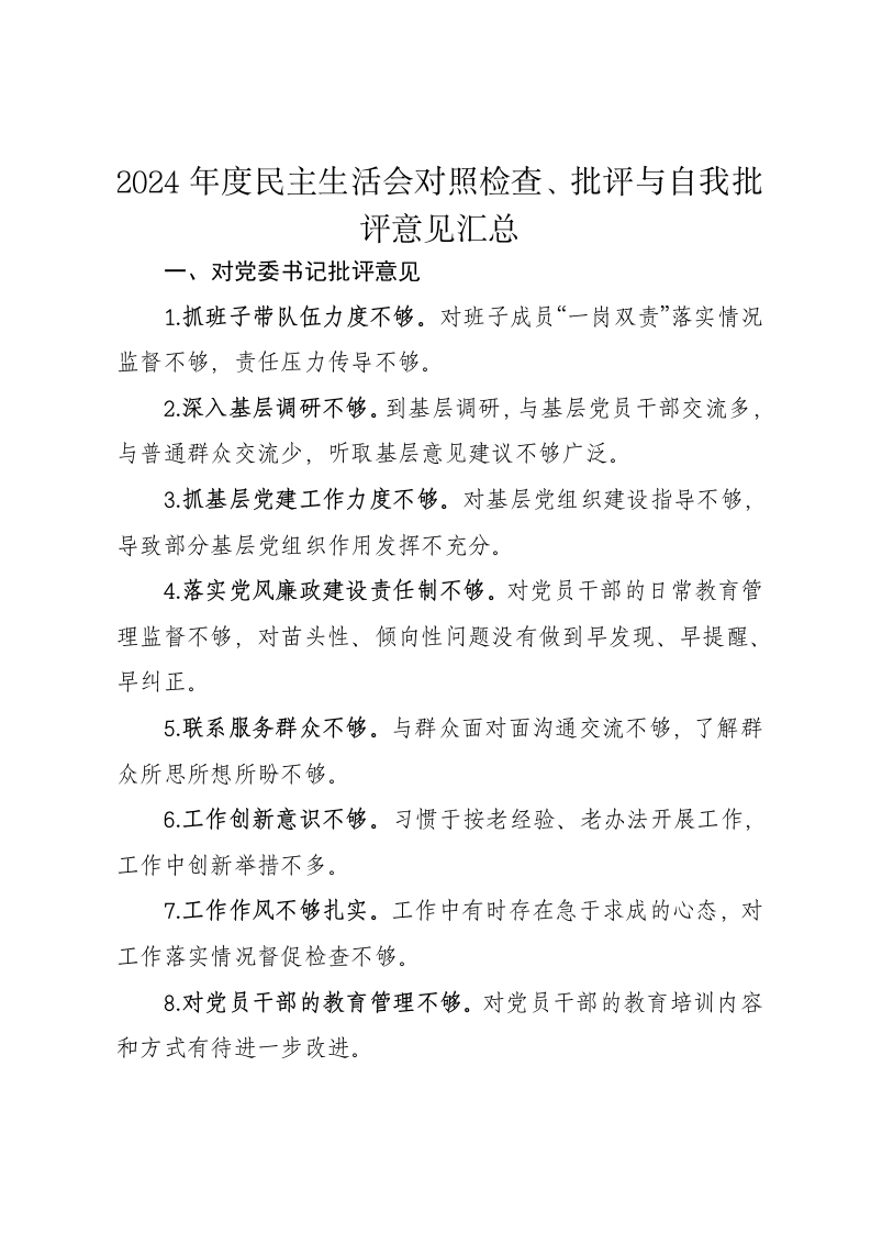 2024年度民主生活会对照检查、批评与自我批评意见汇总一、对党委书记批评意见1.抓班子带队伍力度不够。对班子成员“一岗双责”落实情况监督不够,责任压力传导不够。2深入基层调研不够。到基层调研,与基层党员干部交流多,与普通群众交流少,听取基层意见建议不够广泛。3.抓基层党建工作力度不够。对基层党组织建设指导不够,导致部分基层党组织作用发挥不充分。4.落实党风廉政建设责任制不够。对党员干部的日常教育管理监督不够,对苗头性、倾向性问题没有做到早发现、早提醒、早纠正。5.联系服务群众不够。与群众面对面沟通交流不够,了解群众所思所想所盼不够。6.工作创新意识不够。习惯于按老经验、老办法开展工作,工作中创新举措不多。7.工作作风不够扎实。工作中有时存在急于求成的心态,对工作落实情况督促检查不够。8.对党员干部的教育管理不够。对党员干部的教育培训内容和方式有待进一步改进。