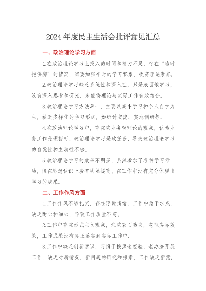 2024年度民主生活会批评意见汇总一、政治理论学习方面1.在政治理论学习上投入的时间和精力不足,存在“临时抱佛脚”的情况,需要加强平时的学习积累,提高理论素养。2.政治理论学习缺乏系统性和深入性,只是表面地学习,没有深入思考和研究,未能将理论与实际工作有效结合。3政治理论学习方法单一,主要以集中学习和个人自学为主,缺乏多样化的学习形式,如研讨交流、实地调研等。4.在政治理论学习中,存在重业务轻理论的现象,认为业务工作是硬指标,政治理论学习是软任务,导致政治理论学习的自觉性和主动性不够。5.政治理论学习的效果不明显,虽然参加了各种学习活动,但在思想认识上没有明显提高,在工作中没有充分体现出学习的成果。二、工作作风方面1.工作作风不够扎实,存在浮躁情绪,工作中急于求成,缺乏耐心和细心,导致工作质量不高。2.工作中存在形式主义现象,注重表面功夫,忽视实际效果,工作成果没有真正落实到实际工作中。3.工作中缺乏创新意识,习惯于按照老经验、老办法开展工作,缺乏对新情况、新问题的研究和探索,工作缺乏新意。